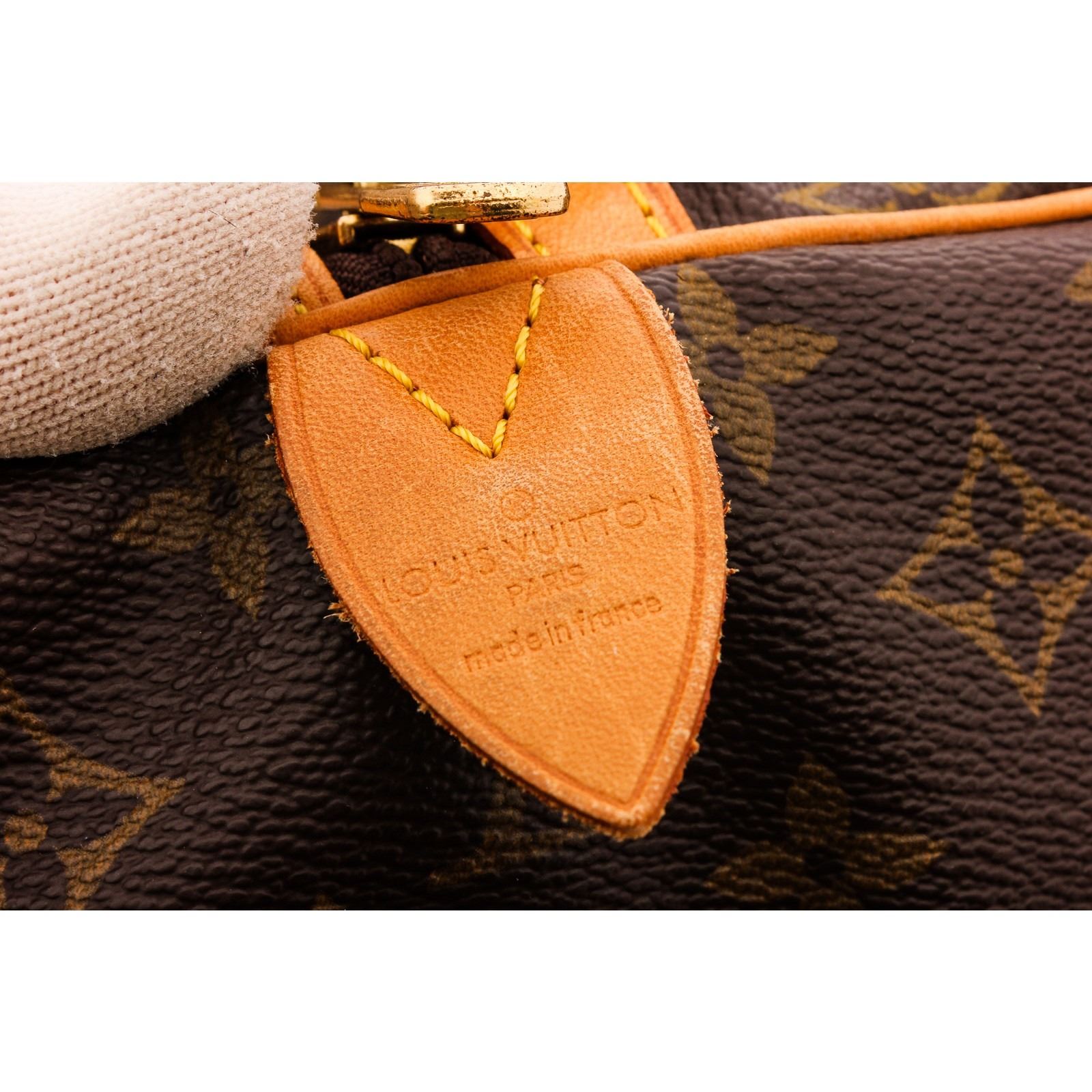 Brown and tan monogram coated canvas Louis Vuitton Sac Souple 55 with brass hardware, tan vachetta leather accents, dual flat shoulder straps, brown canvas interior and two-way zip closure at top.