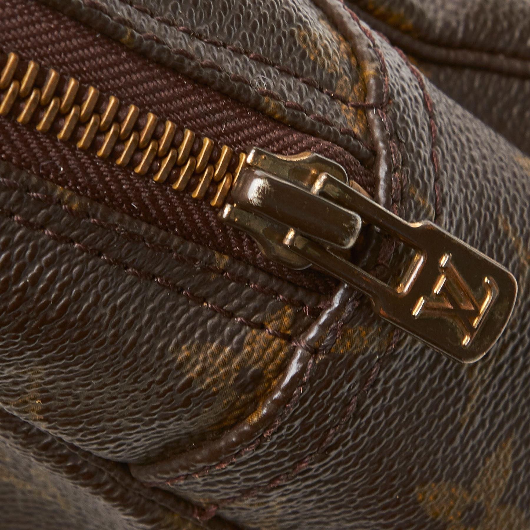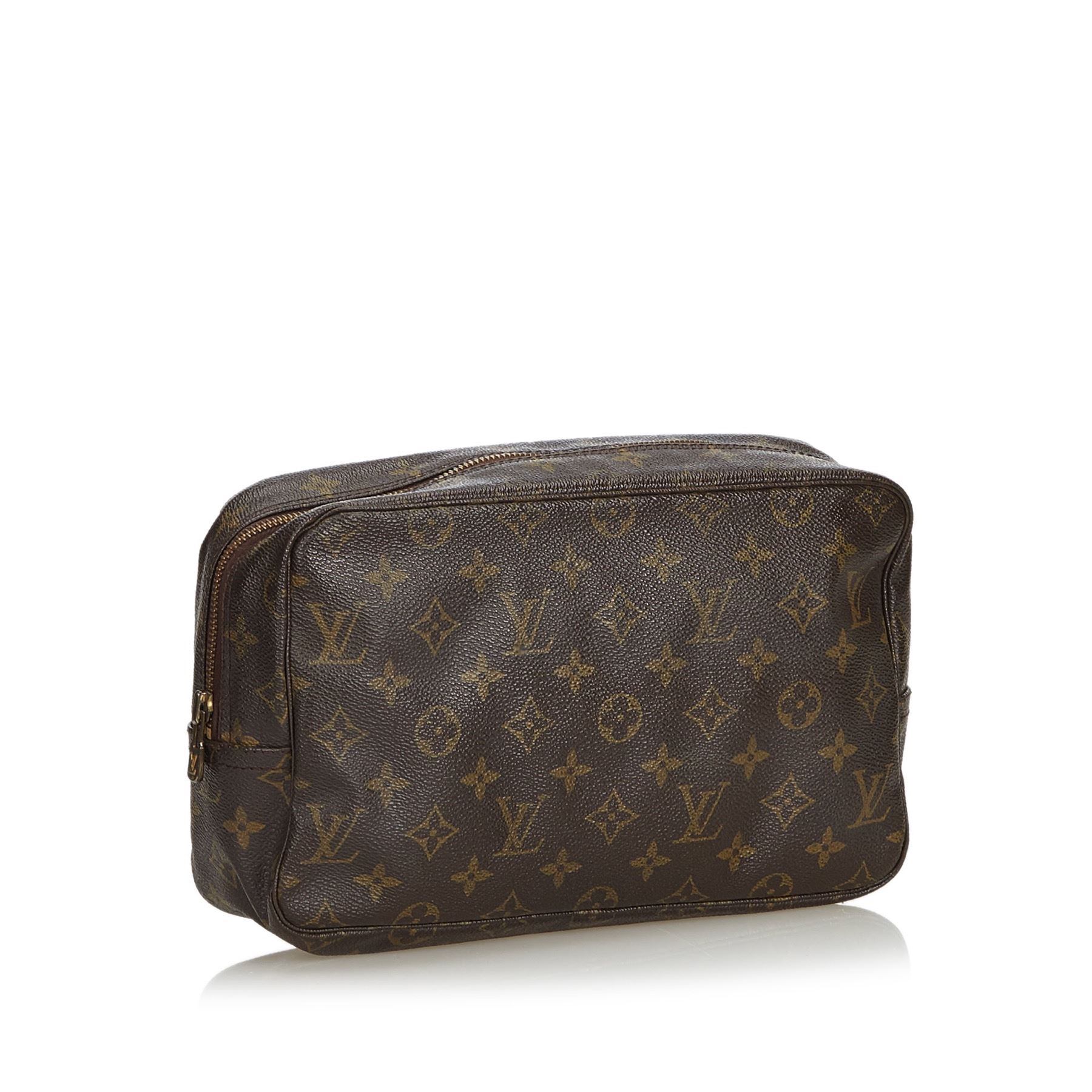 The Trousse Toilette 28 features a monogram canvas body, a top zip closure, and interior slip pockets. Canvas x Monogram Canvas x Leather x Vachetta Leather Brown Interior lining is stained with transfer of color. Size: 17 x 27 x 8 Card: YES Made in: France