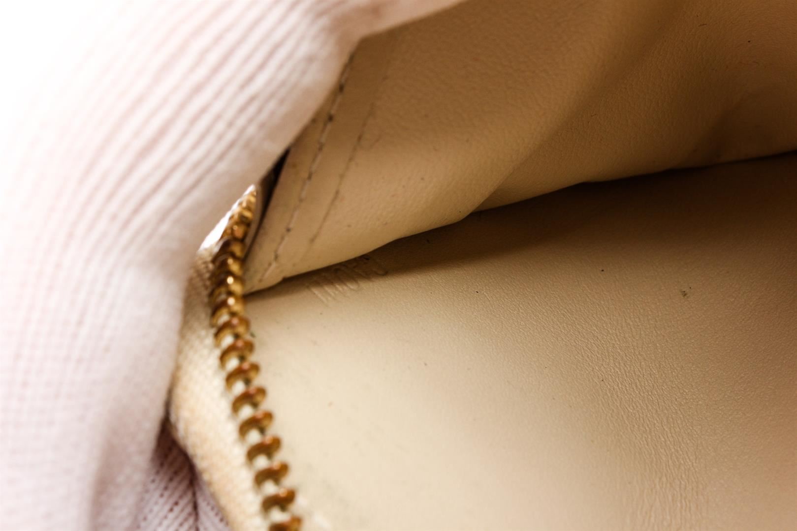 Creme and pink leopard print monogram Vernis leather Louis Vuitton Zippy wallet with brass hardware, green printed logo accent at front, creme leather interior lining, five compartments; one with zip closure, dual bill compartments at interior walls, eight card slots and zip-around closure at top.