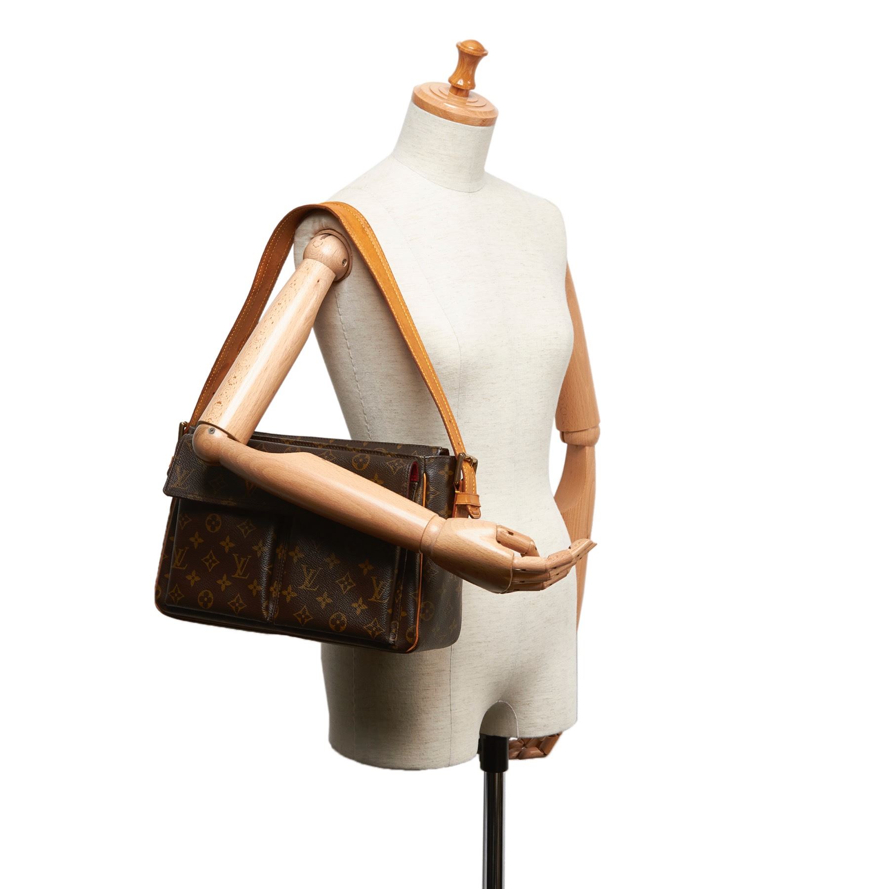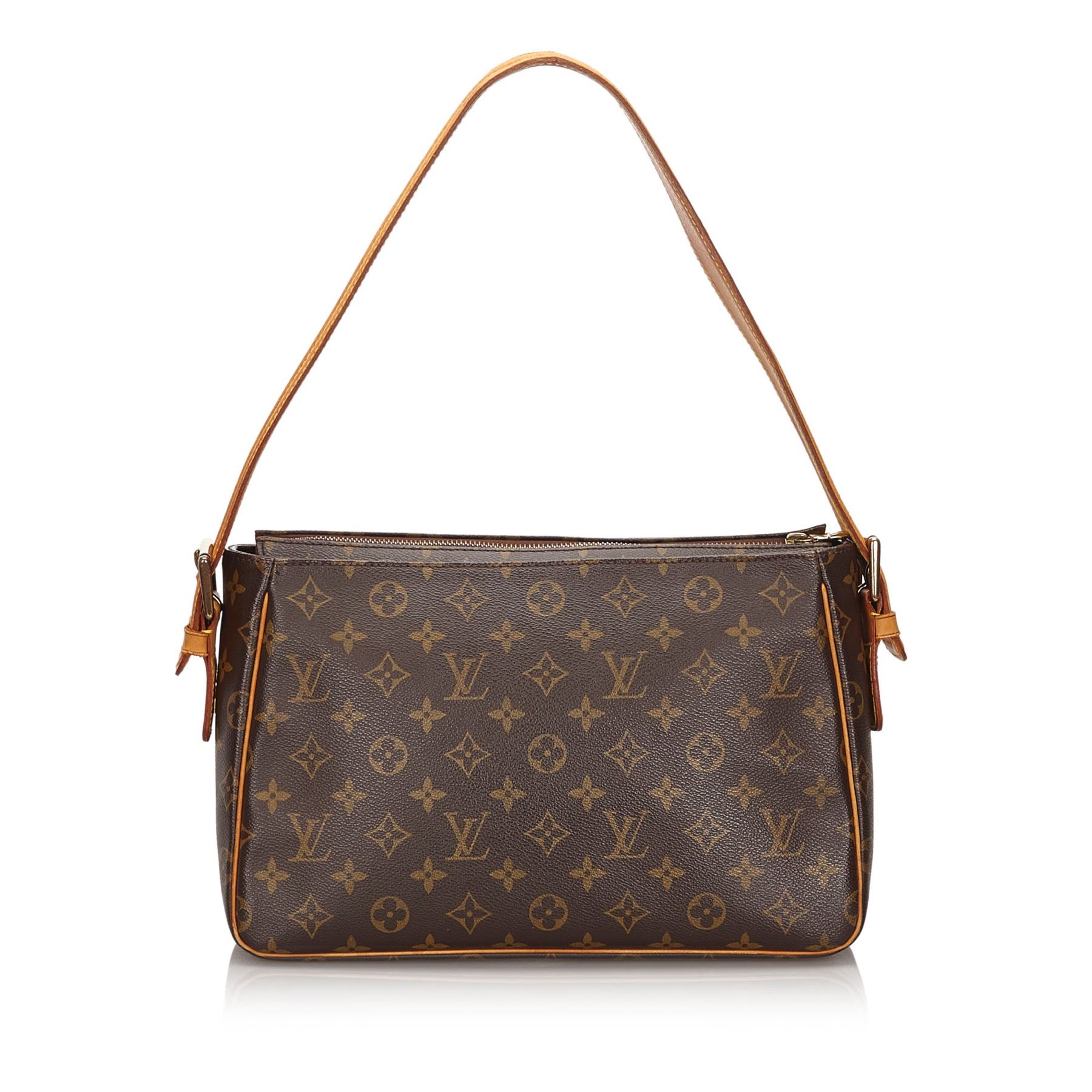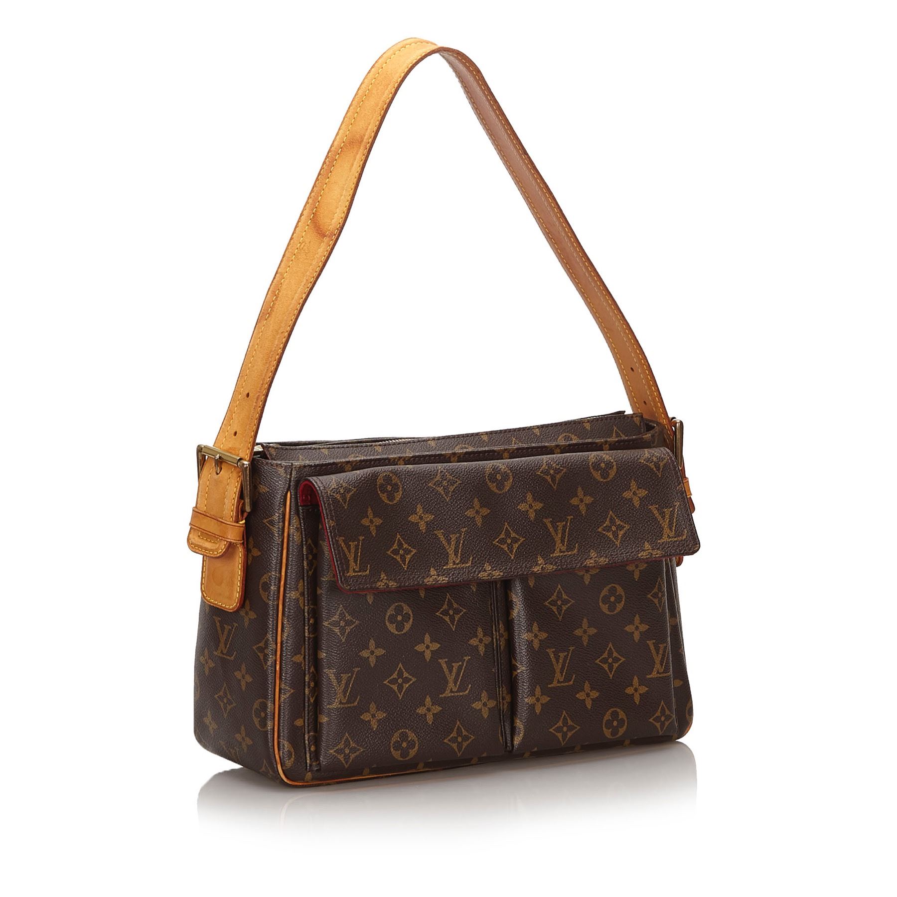 The Viva Cite GM features a monogram canvas body, exterior flap pockets, an adjustable leather shoulder strap, a top zip closure, and interior slip pockets. Canvas x Monogram Canvas x Leather x Vachetta Leather Brown Exterior front is scratched. Exterior back is scratched. Exterior handle is stained with water mark, discolored, cracked and scratched. Exterior pocket is stained. Exterior corners is scratched. Exterior side is stained. Interior lining is stained. Zipper is scratched. Buckle is rusty and scratched. Size: 32 x 22 x 10 Card: NO. Louis Vuitton pieces do not come with an authenticity card—please refer to the production date code within the bag for its age and as an authenticity reference. Made in: France