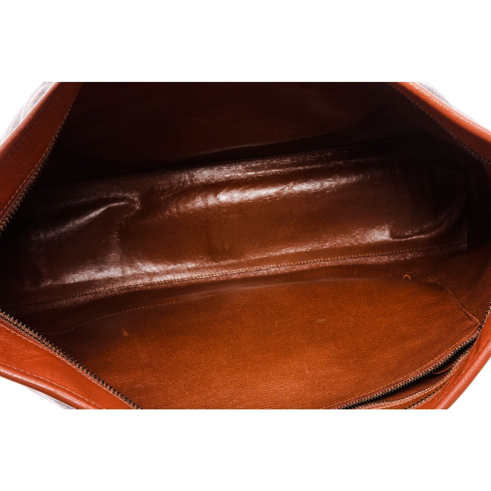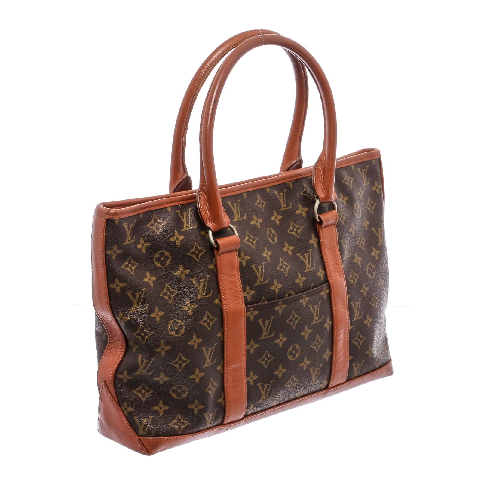 Brown and tan monogram coated canvas vintage Louis Vuitton Sac Weekend tote with brass hardware, dual rolled top handles, cinnamon leather trim, dual exterior slip pockets, caramel leather lining, single interior zip pocket and zip closure at top.