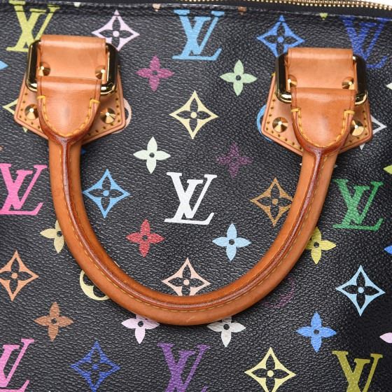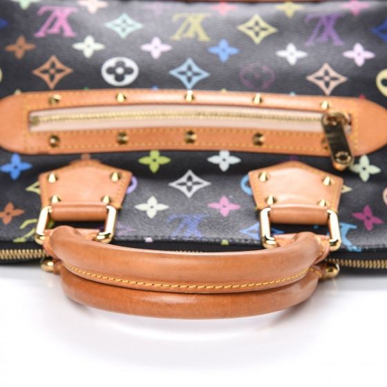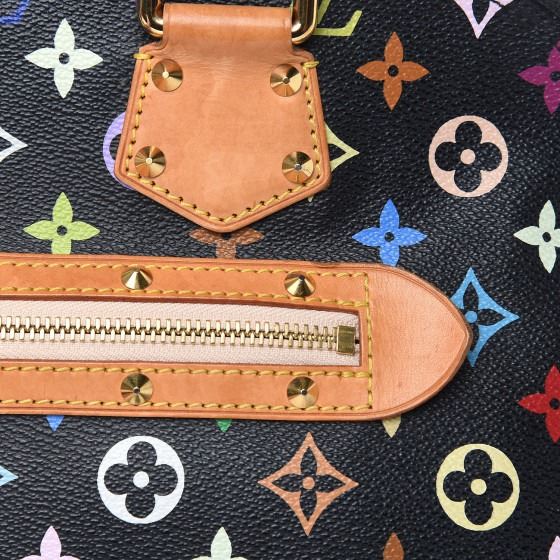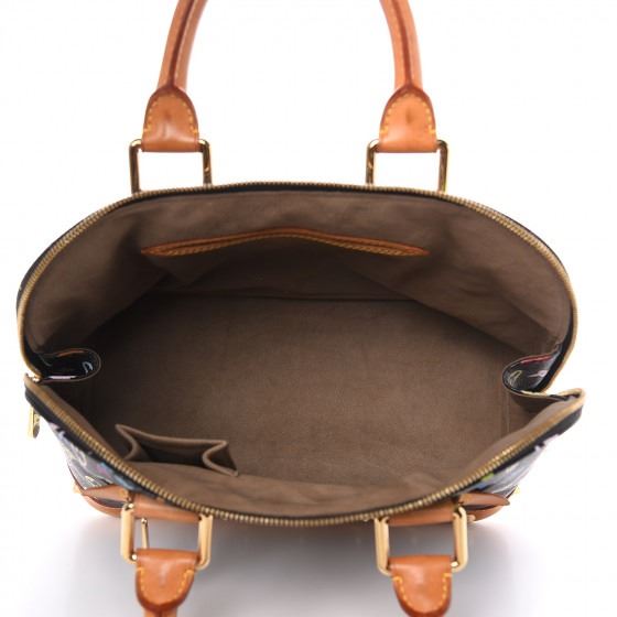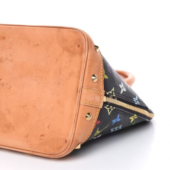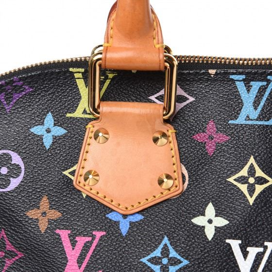 This Alma is finely crafted of multicolor Louis Vuitton monogram in 33 vivid colors on black coated canvas. The handbag features vachetta cowhide leather top handles, trim and base lined with cone shaped polished brass studs and a front zipper pocket. The wrap around brass zipper opens to a light brown microfiber interior with patched pockets.