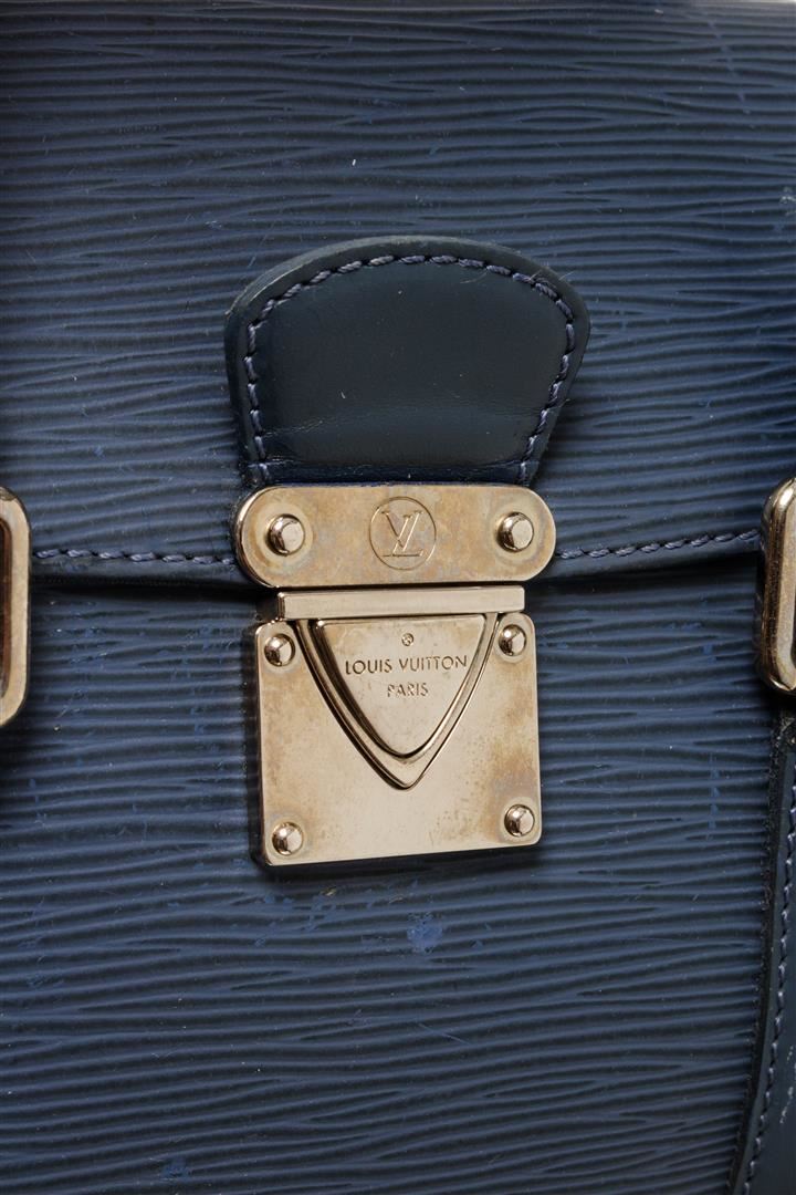One Louis Vuitton Navy Epi Leather Segur PM Bag. Item is sold AS-IS. All available information is listed in the description and shown in the photo. Louis Vuitton navy epi leather Segur PM bag with leather exterior, blue fabric lining, silver-toned hardware, flap and lock closure, two rigid top handles, and one interior slip pocket. The PM size is the smallest size of the Segur family. There are some spots and repainting on the handle & exterior as shown in photos. Height: 6.7" Width: 3.94" Depth: 11.82", Handle Drop: / 17 x 10 x 30 Cm