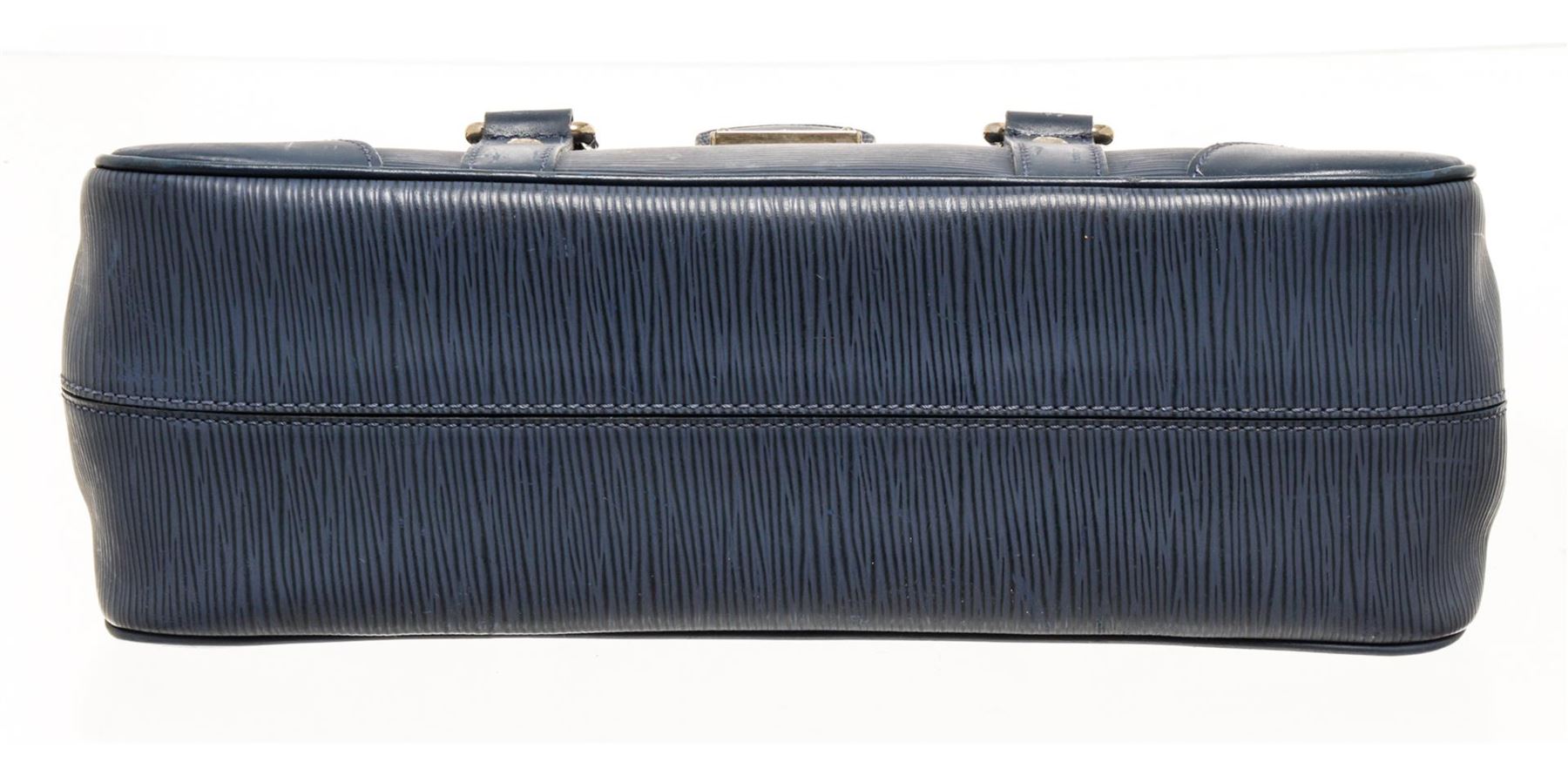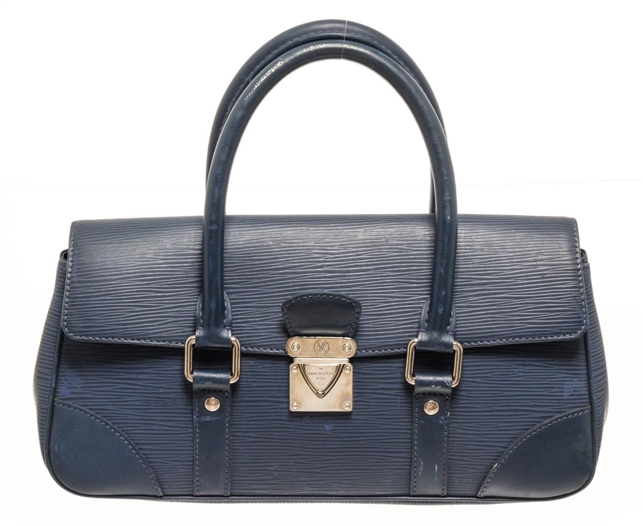 One Louis Vuitton Navy Epi Leather Segur PM Bag. Item is sold AS-IS. All available information is listed in the description and shown in the photo. Louis Vuitton navy epi leather Segur PM bag with leather exterior, blue fabric lining, silver-toned hardware, flap and lock closure, two rigid top handles, and one interior slip pocket. The PM size is the smallest size of the Segur family. There are some spots and repainting on the handle & exterior as shown in photos. Height: 6.7" Width: 3.94" Depth: 11.82", Handle Drop: / 17 x 10 x 30 Cm