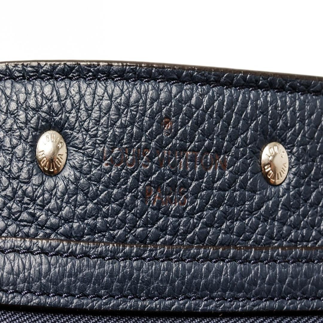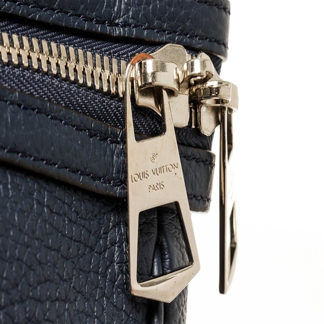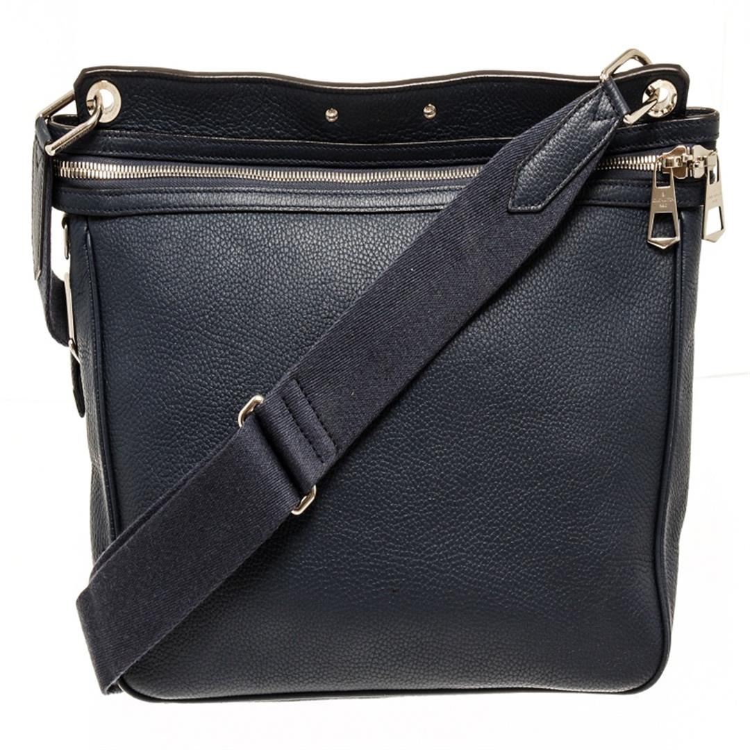 One Louis Vuitton Navy Leather Armand Messenger bag. Item is sold AS-IS. All available information is listed in the description and shown in the photo. Louis Vuitton navy leather Armand messenger bag with leather exterior, orange suede lining, silver-tone hardware, zipper closure, adjustable fabric strap, one exterior zip pocket, and one main compartment with a slip pocket. Height: 12.5" Width: 14" Depth: 5" , Handle Drop: / 31.75 x 35.56 x 12.7 Cm