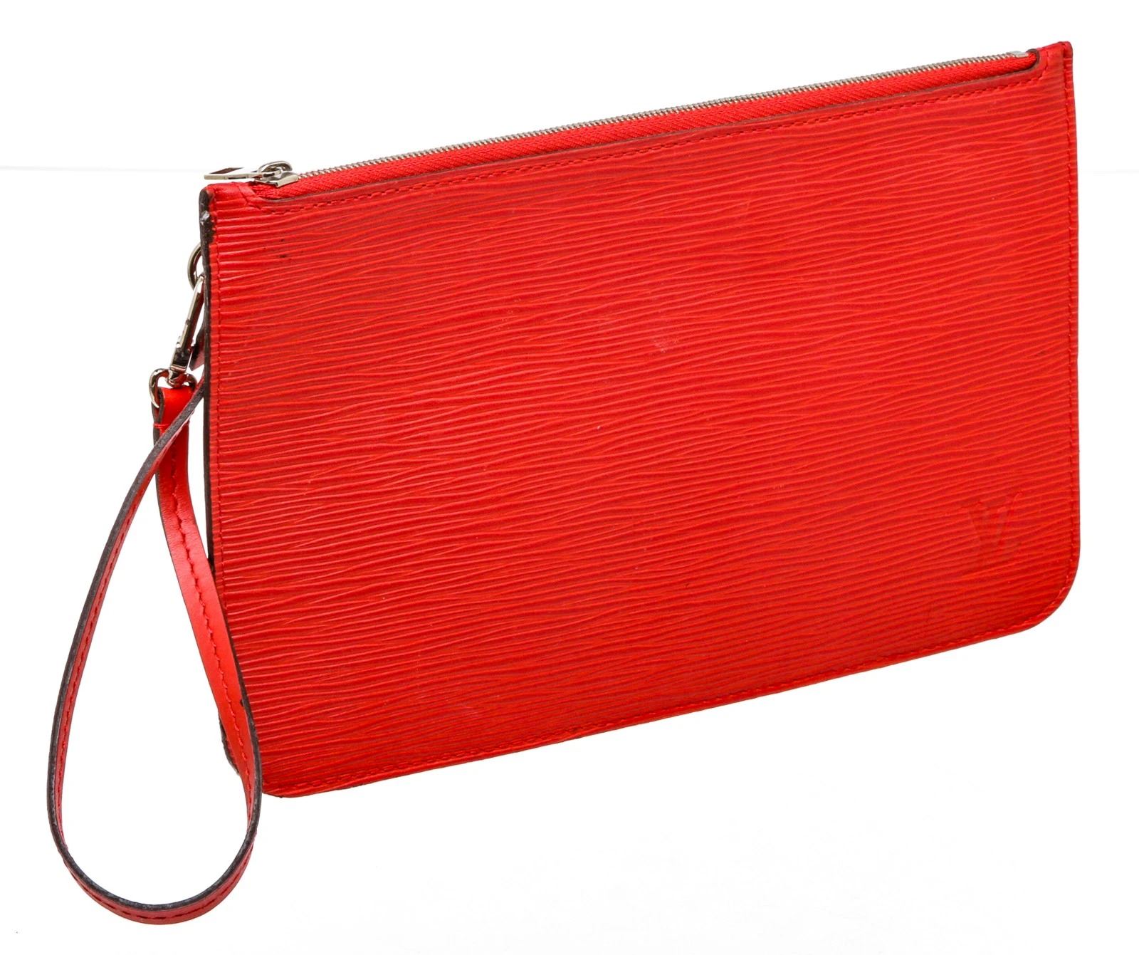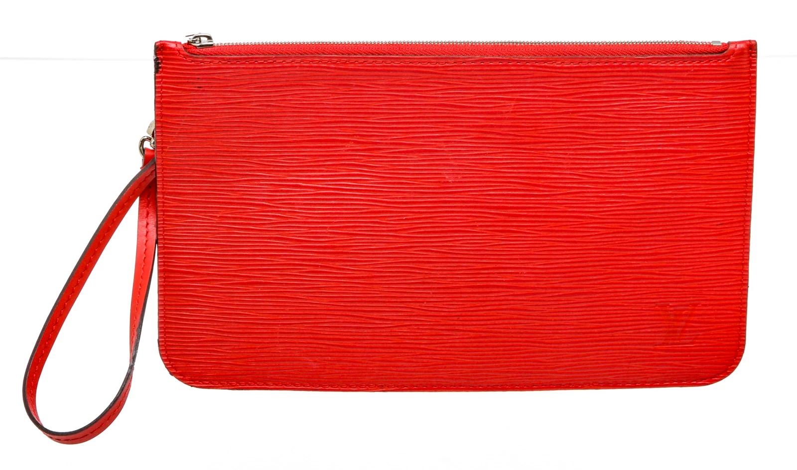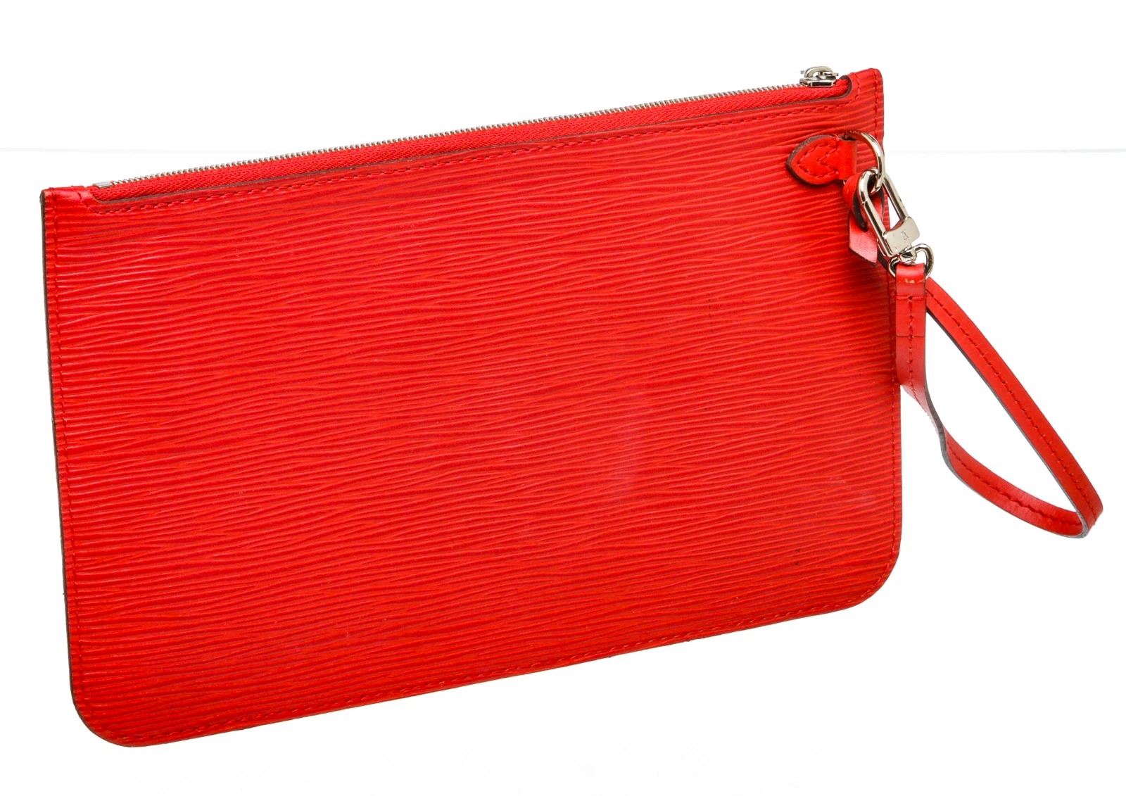 Crafted from red Epi leather, the Neverfull pouch features silver-tone hardware, wristlet at the side, and zip top closure which opens to a single wall pocket.