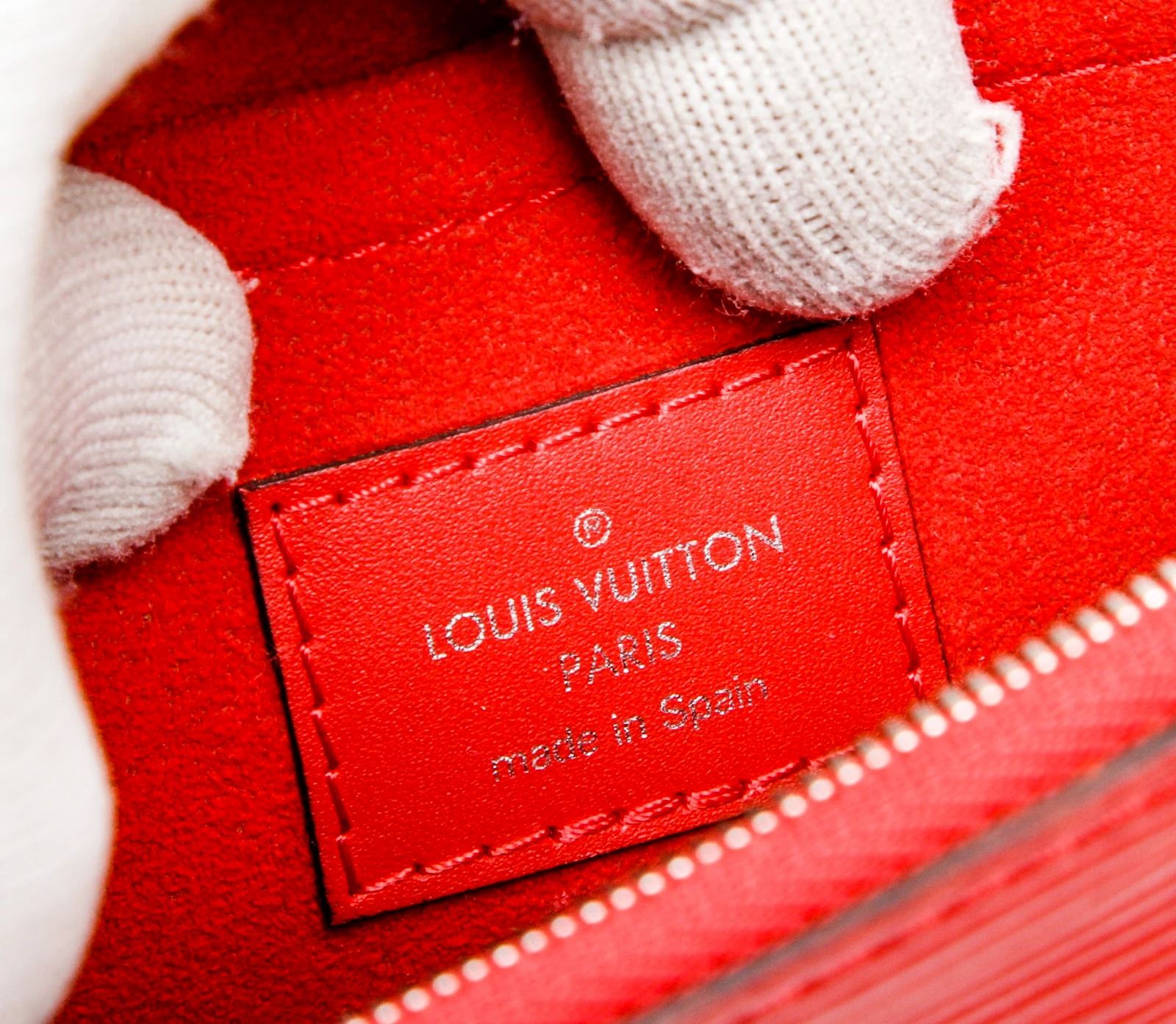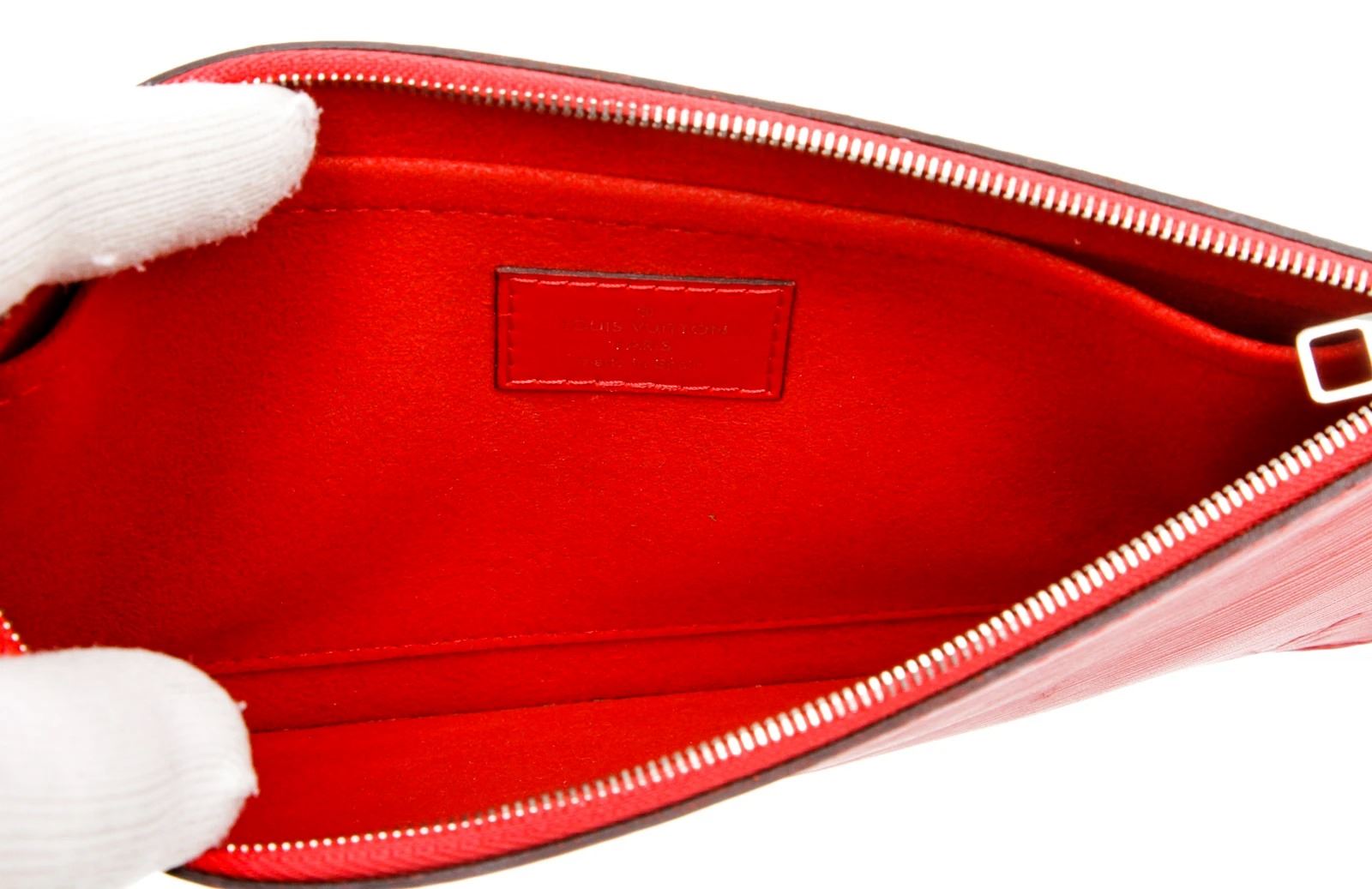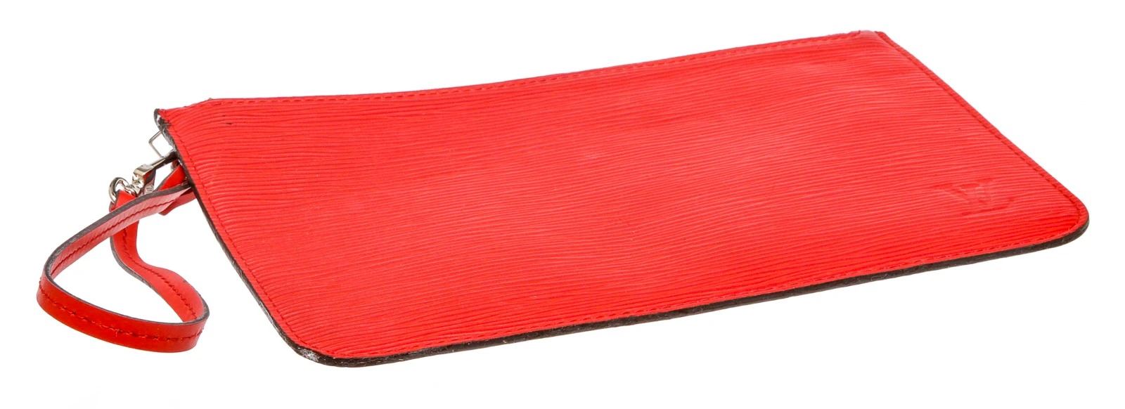 Crafted from red Epi leather, the Neverfull pouch features silver-tone hardware, wristlet at the side, and zip top closure which opens to a single wall pocket.