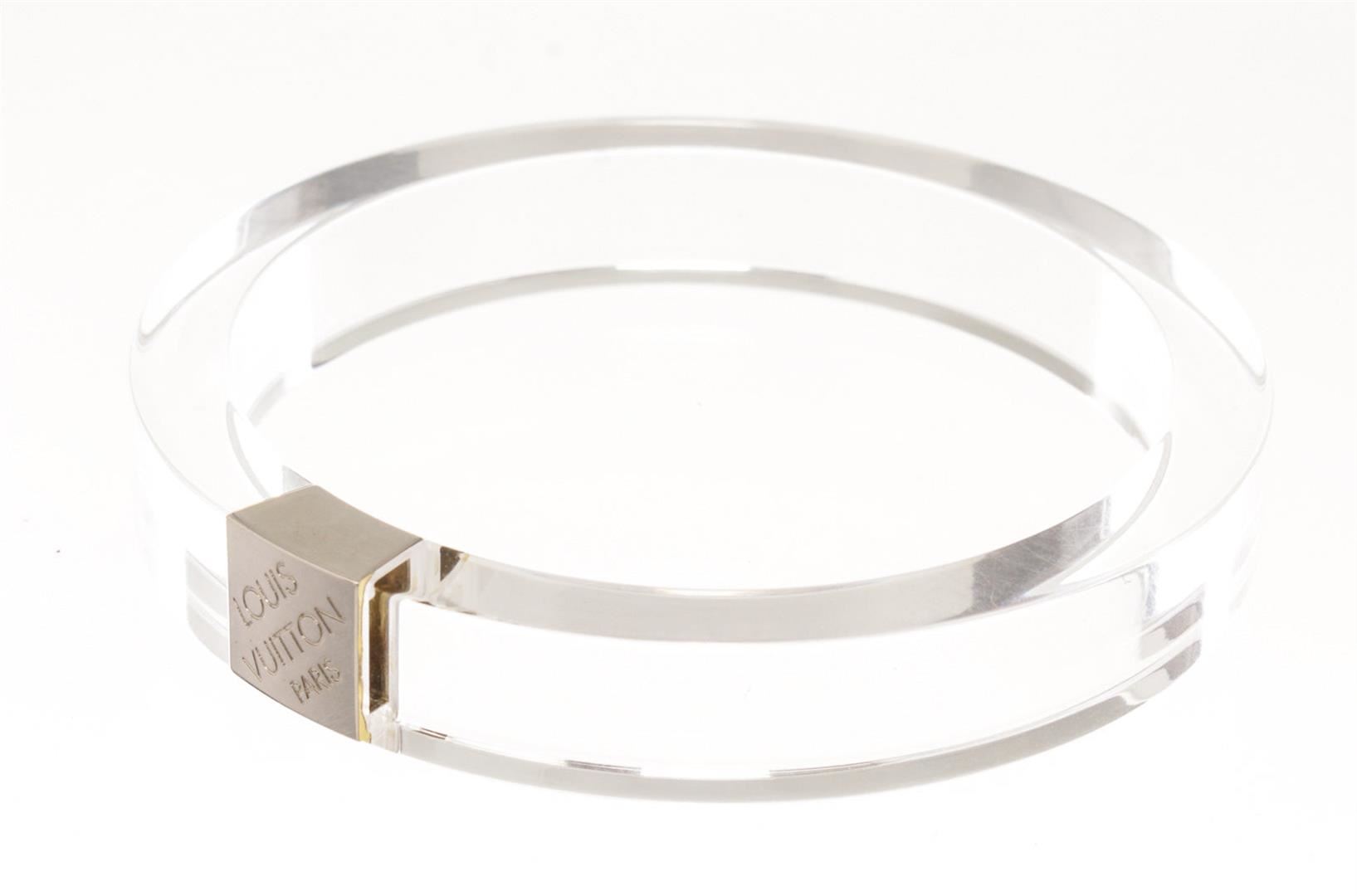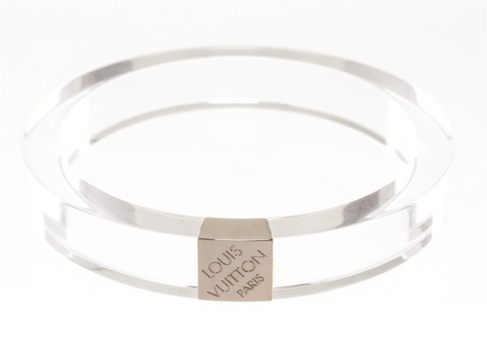Louis Vuitton Night Clubber Bangle Bracelet Clear Resin. Brand: Louis Vuitton, Style: Night Clubber Bangle, Type: Bracelet, Exterior Color: Clear, Exterior Material: Resin, Length: 1cm, Width: .25", Height: 2.5. Item is sold AS-IS and all information pertaining to this lot is available in the photos or this description.