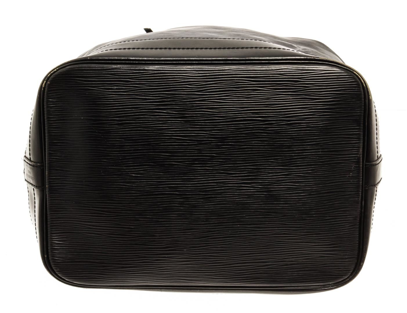 Louis Vuitton Noe MM Bucket Bag Black Epi Leather. Brand: Louis Vuitton, Style: Noe MM, Type: Bucket Bag, Exterior Color: Black Epi, Exterior Material: Leather, Exterior Pockets: None, Interior Color: Black, Interior Material: Suede, Interior Pockets: None, Closure: Drawstring, Handle/Strap Type: Adjustable, Length: 7, Width: 1N/A, Height: 13, Strap Drop: 12-14". Condition: Corner wear. Item is sold AS-IS and all information pertaining to this lot is available in the photos or this description.