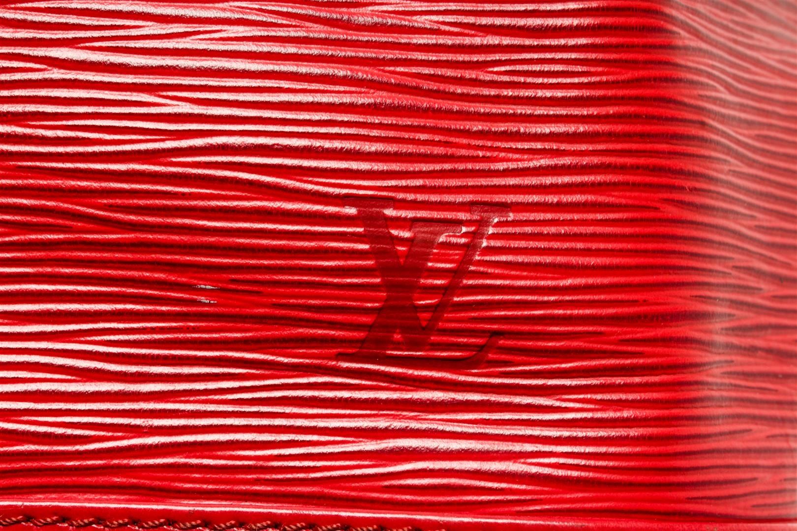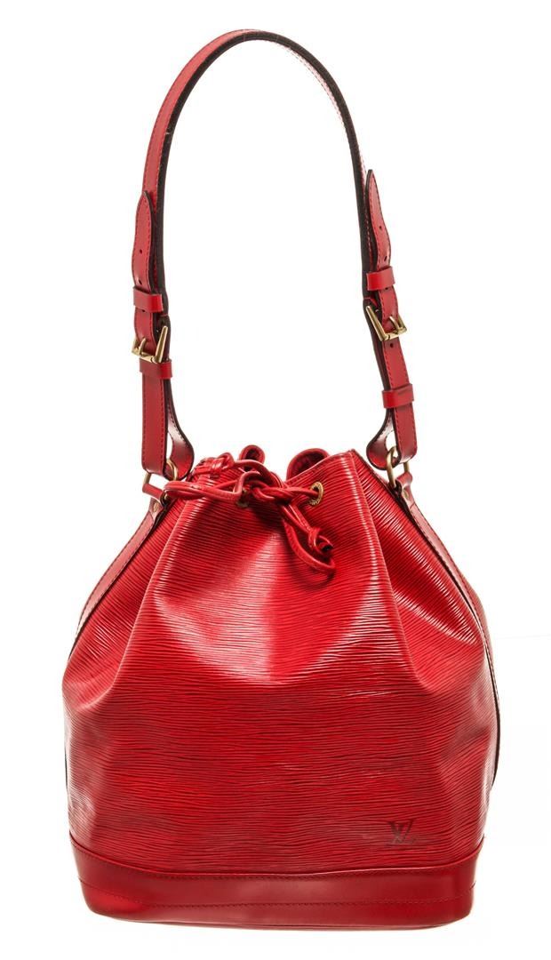 Louis Vuitton Noe Shoulder Bag Red Epi Leather. Brand: Louis Vuitton, Style: Noe, Type: Shoulder Bag, Exterior Color: Red, Exterior Material: Epi Leather, Exterior Pockets: None, Interior Color: Red, Interior Material: Alcantara, Interior Pockets: None, Closure: Drawstring, Handle/Strap Type: Adjustable Shoulder Strap, Length: 1N/A.5", Width: 7.5", Height: 13.5", Strap Drop: 12". Condition: Light corner wear. Additional Information: Gold Hardware. Item is sold AS-IS and all information pertaining to this lot is available in the photos or this description.