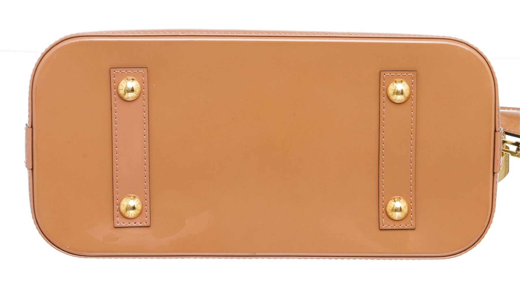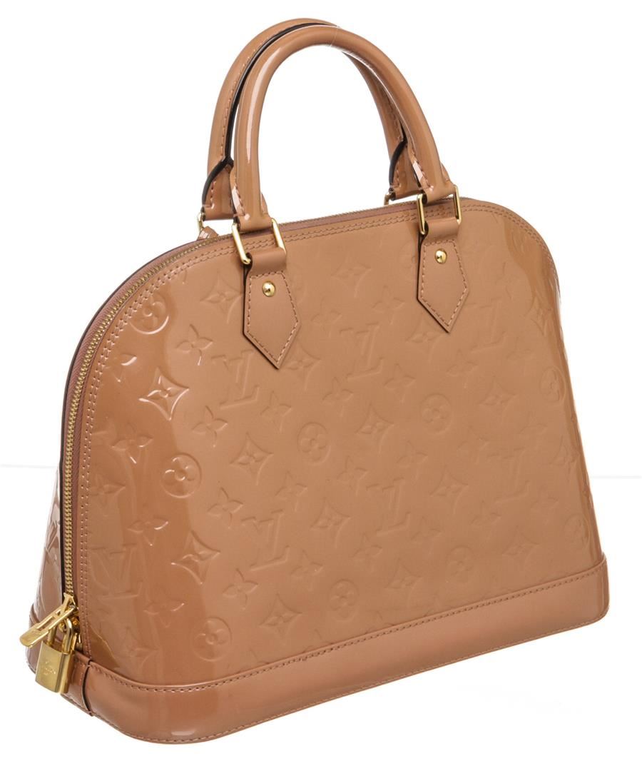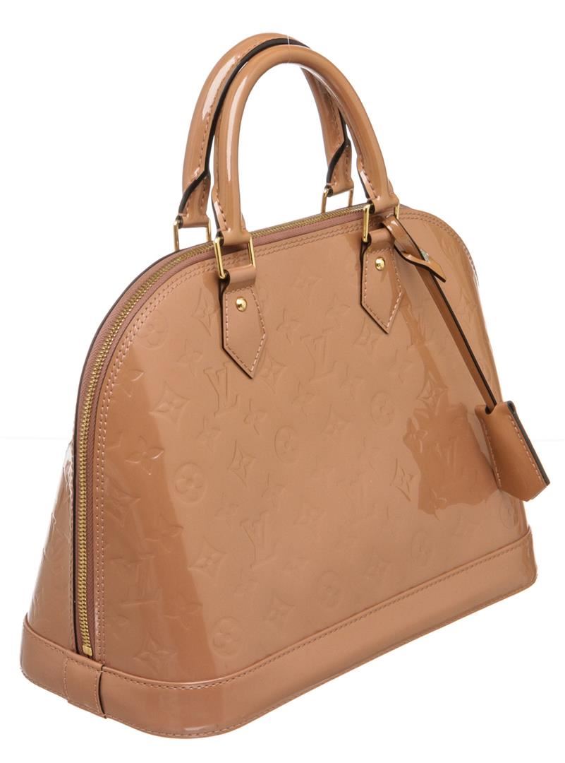 Nude monogram Vernis leather Louis Vuitton Alma PM with brass hardware, dual rolled top handles, protective feet at base, tonal canvas lining, dual slip pockets at interior wall and two-way zip closures at top.