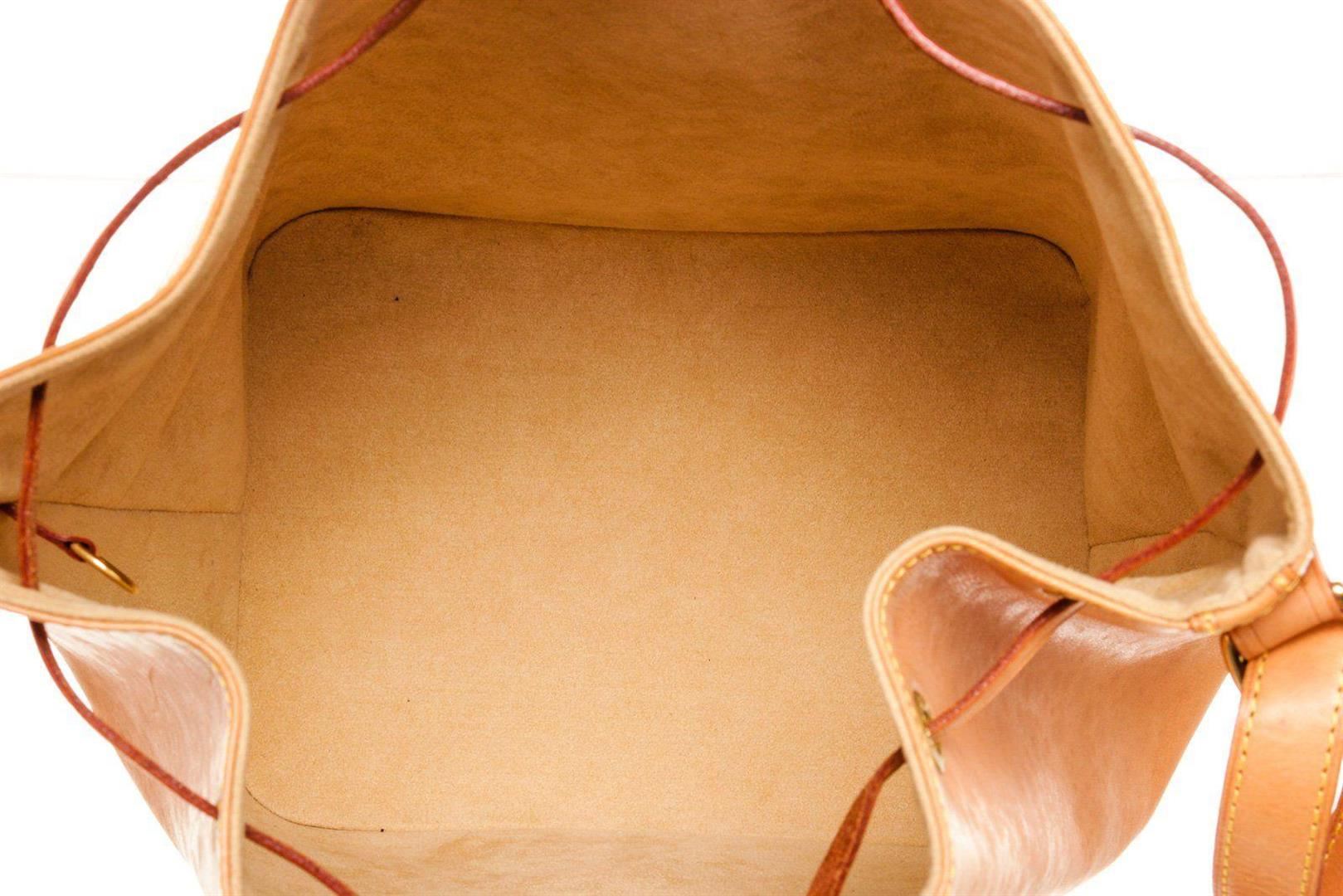 Louis Vuitton Orange Canvas Leather Noe PM Bucket Bag with material epi leather, gold-tone hardware, trim tan vachetta leather, shoulder adjustable strap and drawstring closure.
