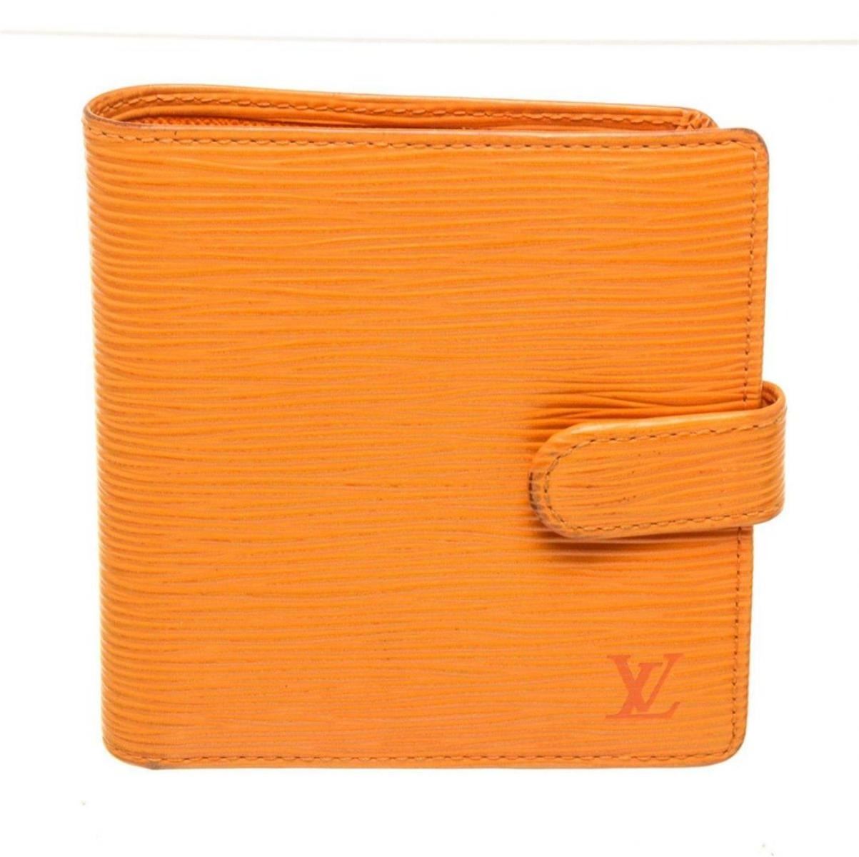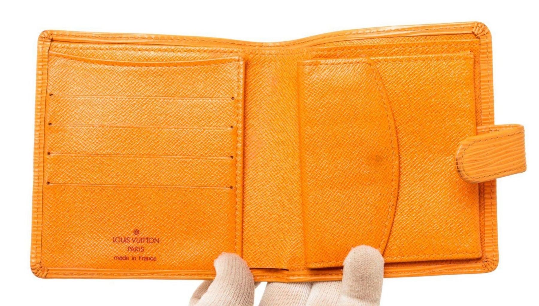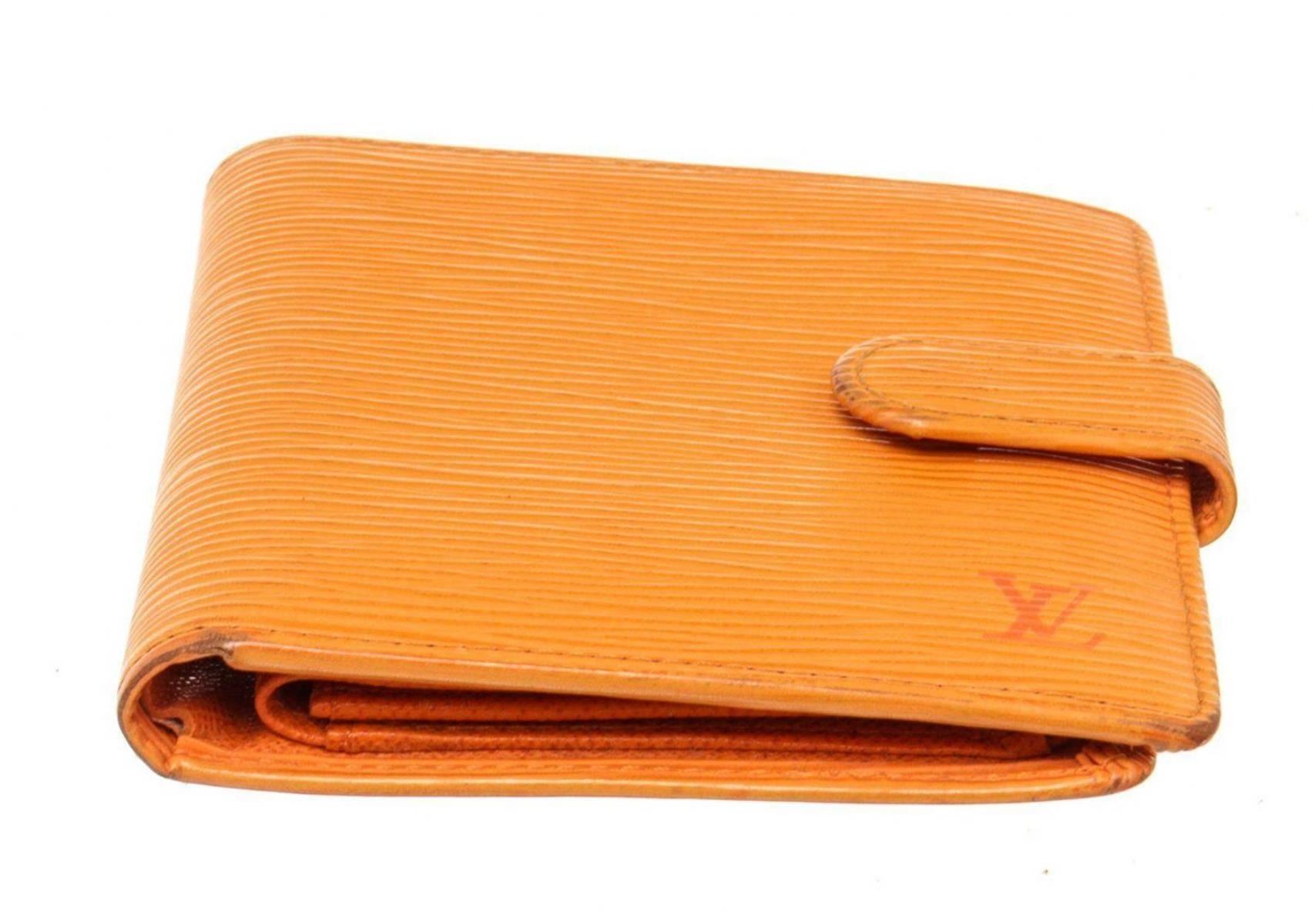 Louis Vuitton Orange Epi Leather Compact Bifold Wallet with epi leather, gold-tone hardware, trim tan vachetta leather, interior card holder pockets, leather lining and snap closure.