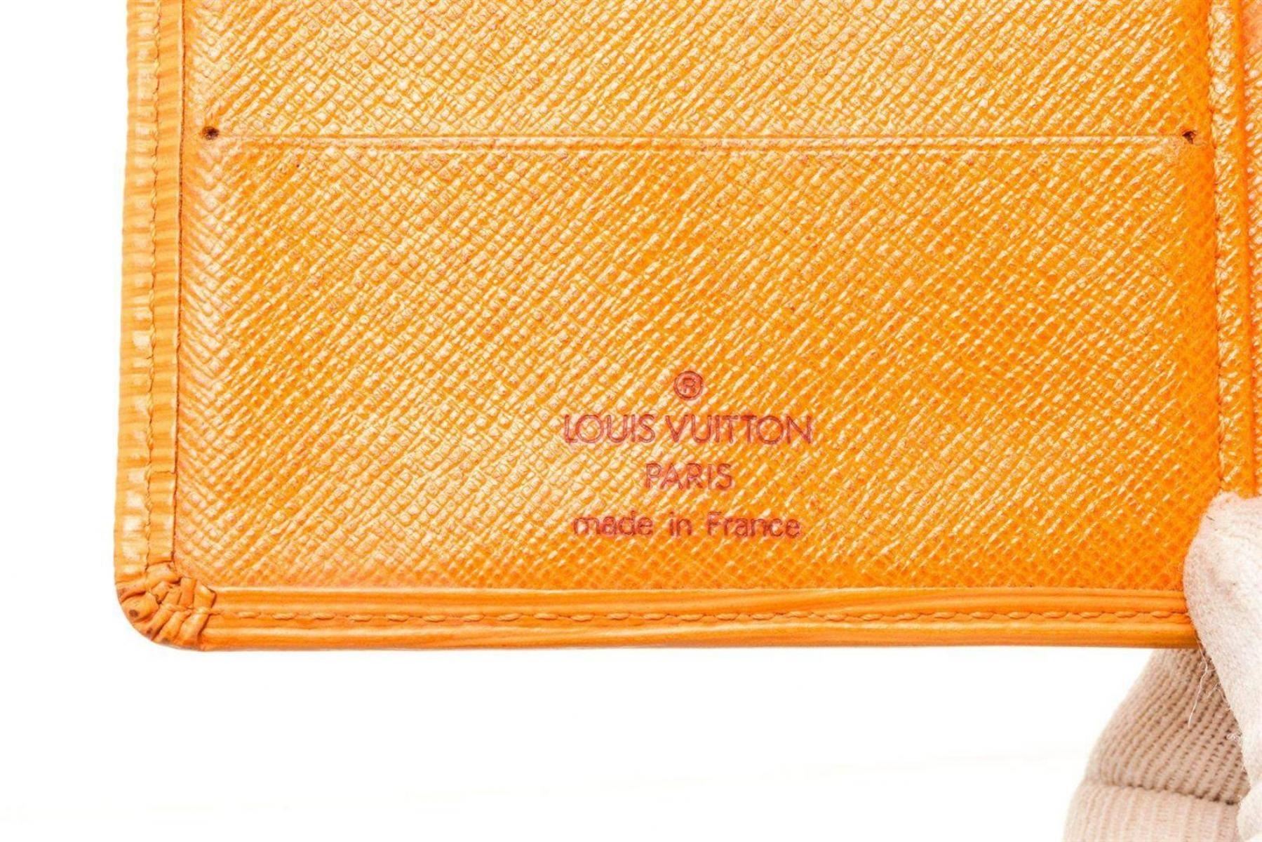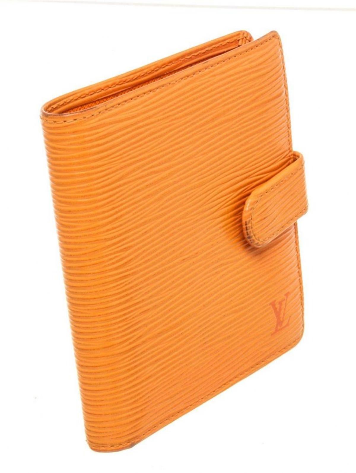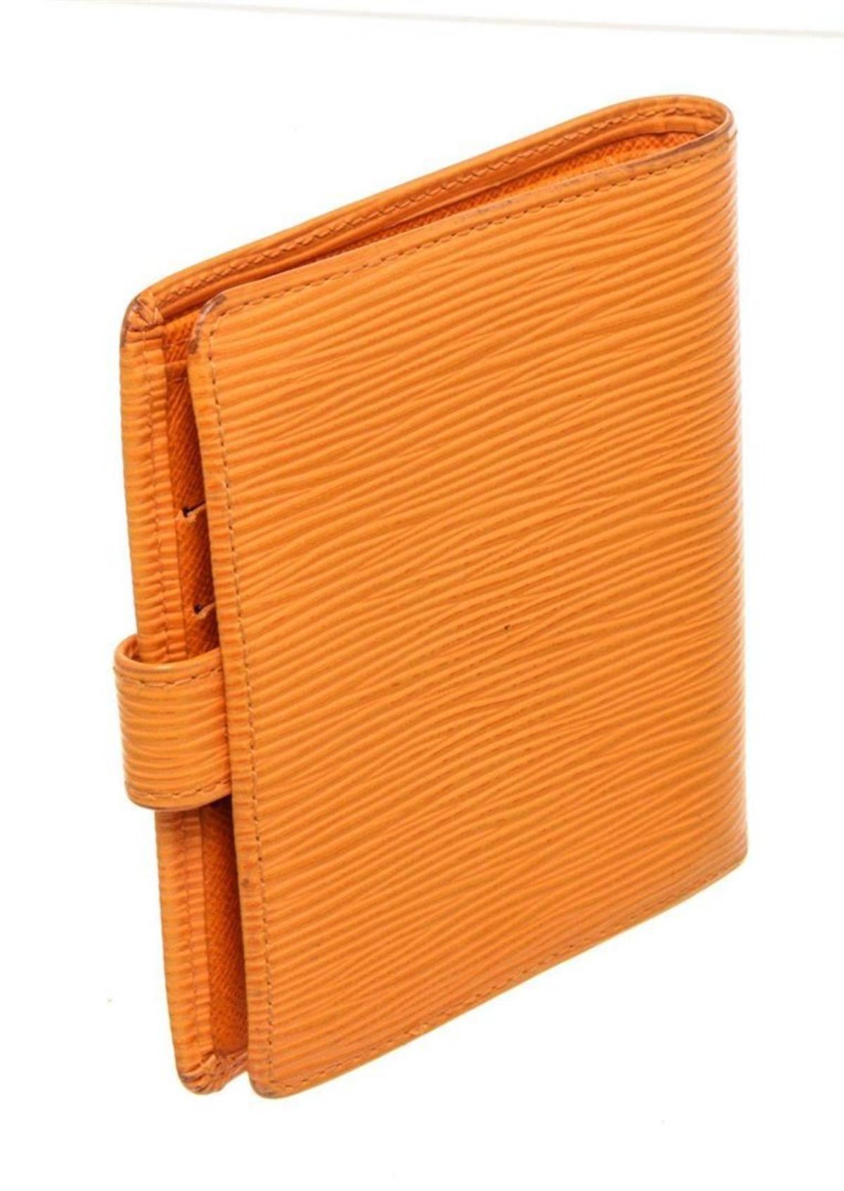 Louis Vuitton Orange Epi Leather Compact Bifold Wallet with epi leather, gold-tone hardware, trim tan vachetta leather, interior card holder pockets, leather lining and snap closure.