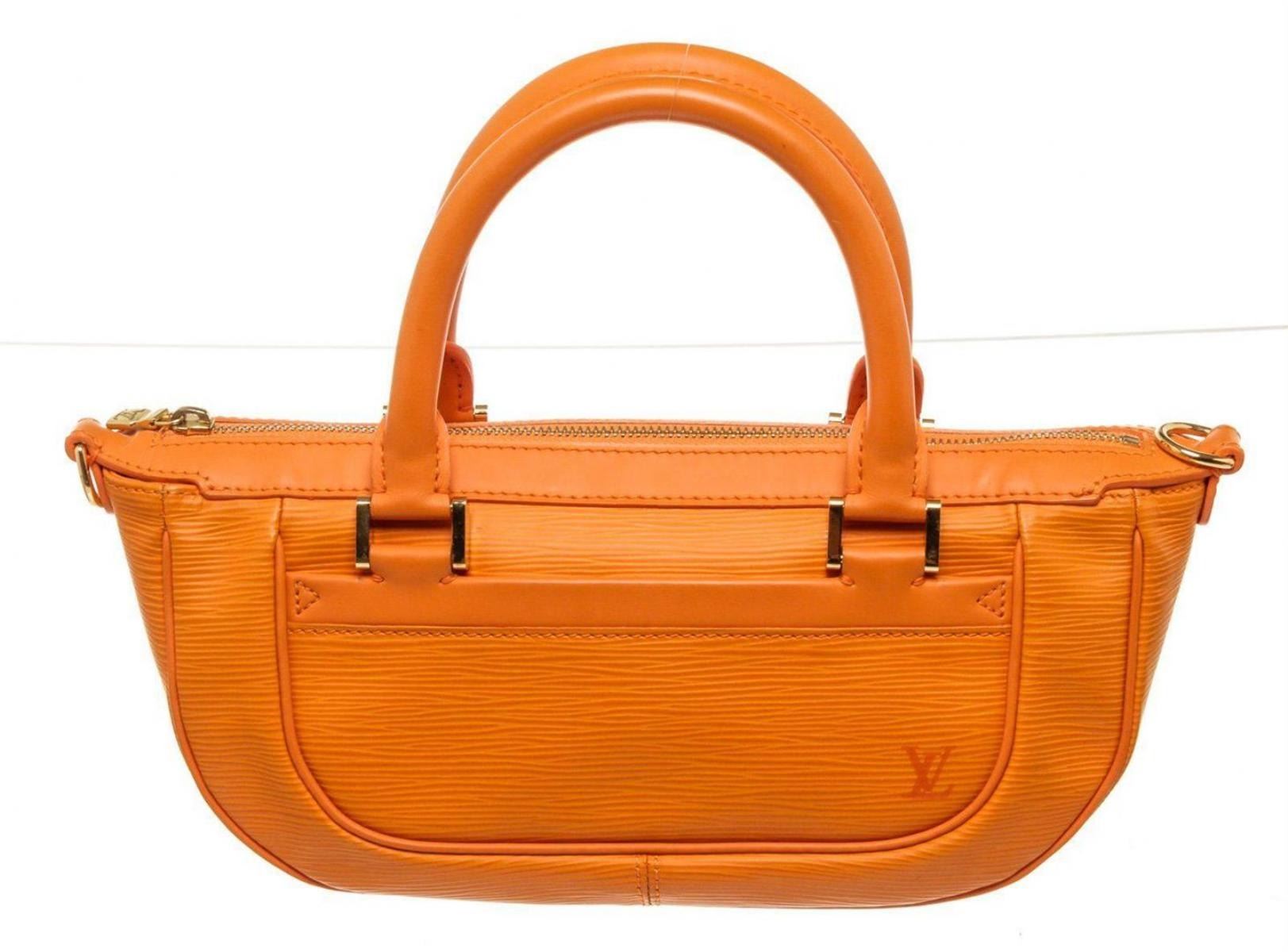 Louis Vuitton Orange Epi Leather Danura PM Handbag. Louis Vuitton Orange Epi Leather Danura PM Handbag with material vernis leather, gold-tone hardware, trim tan vachetta leather, interior slip pocket, dual top handle, and zip closure.