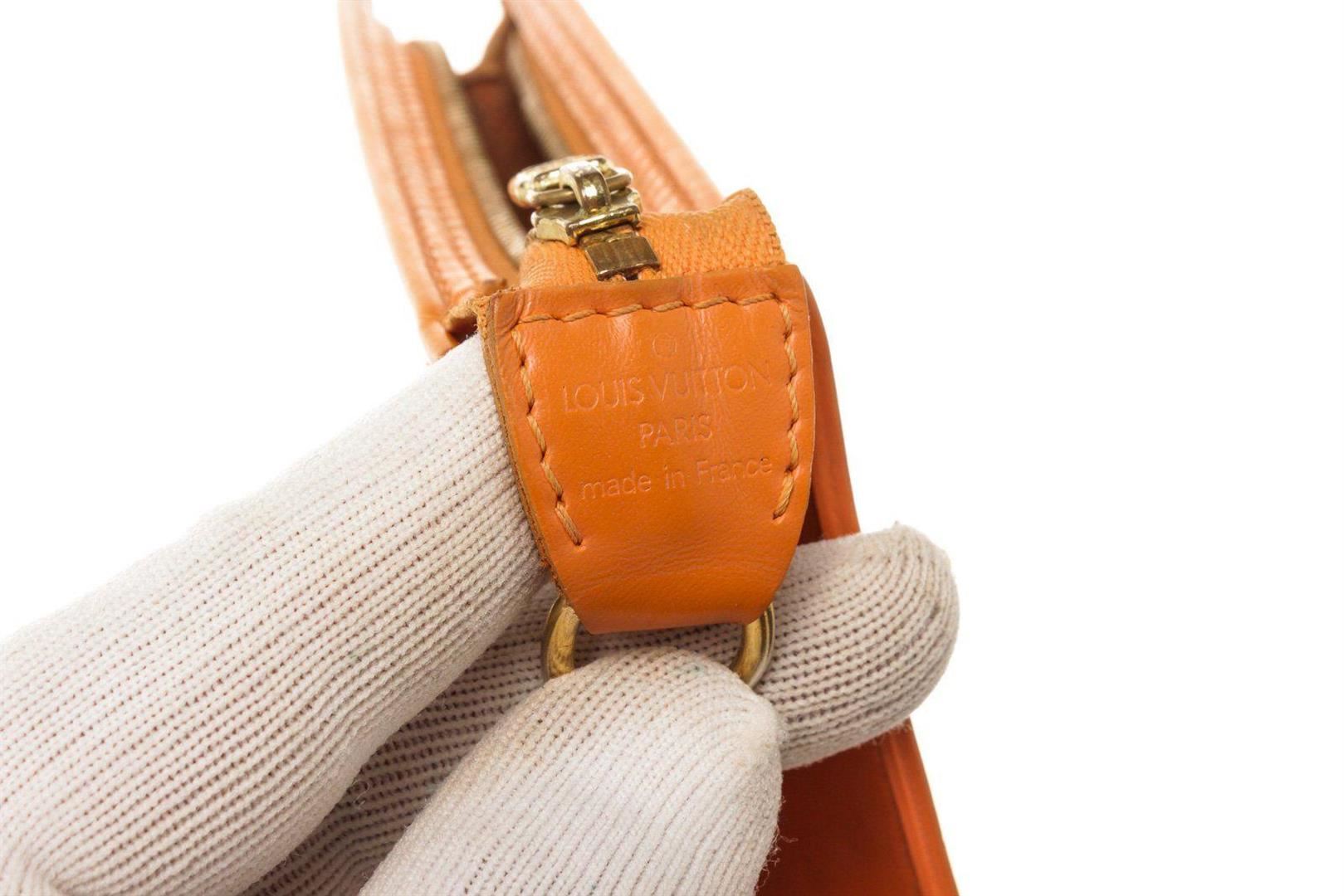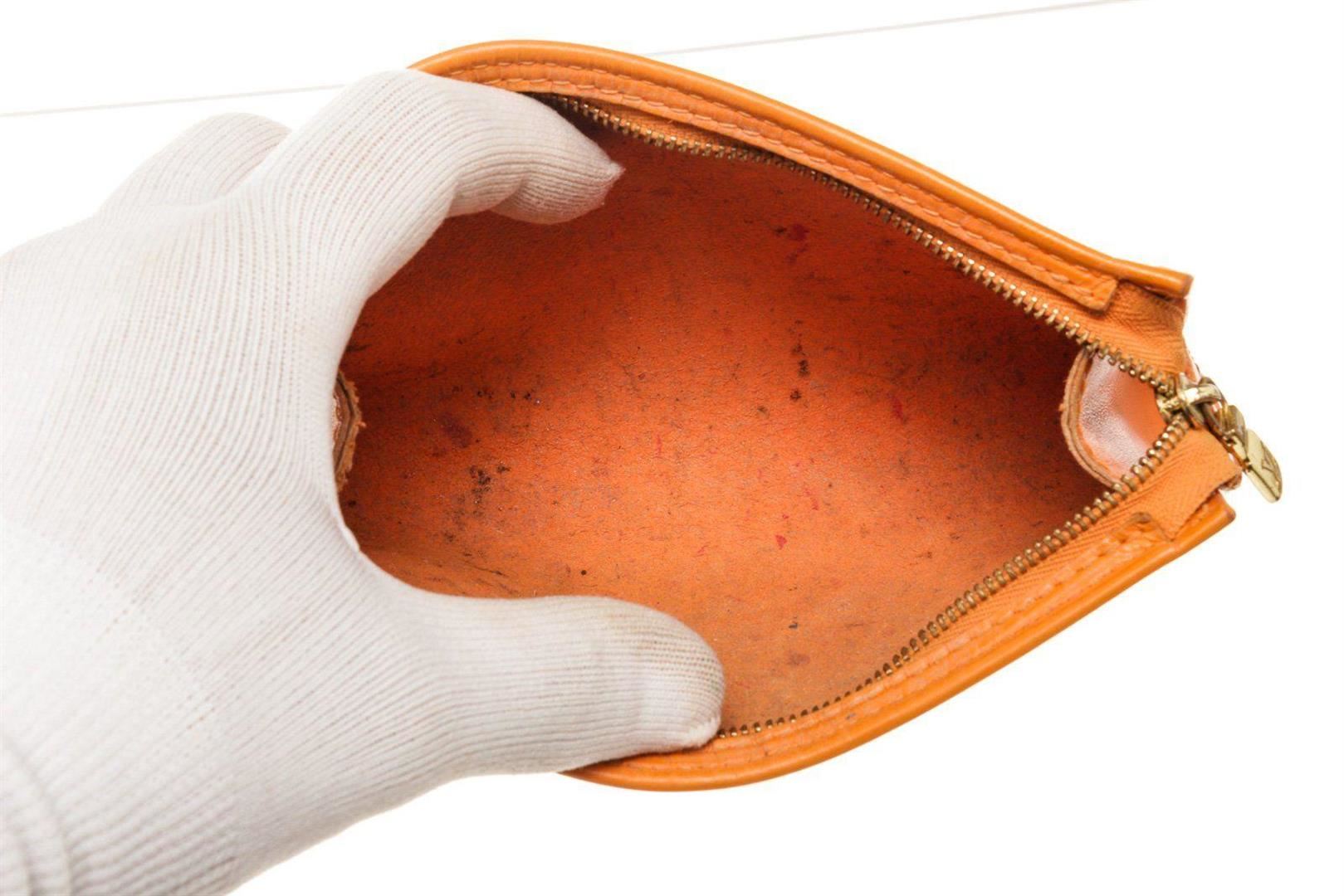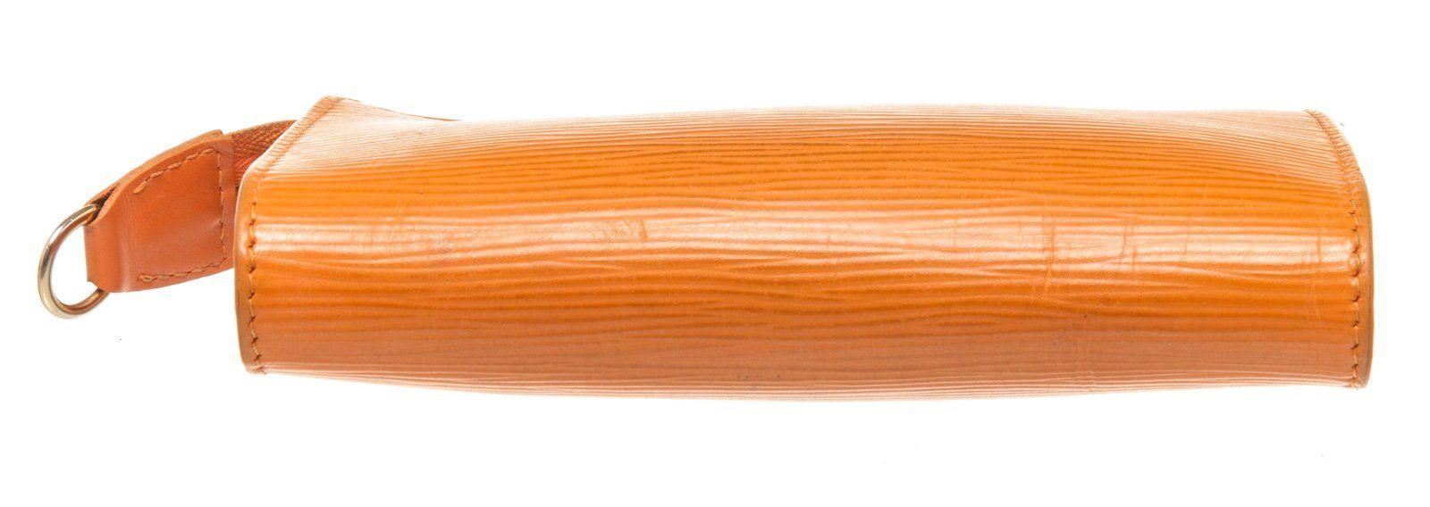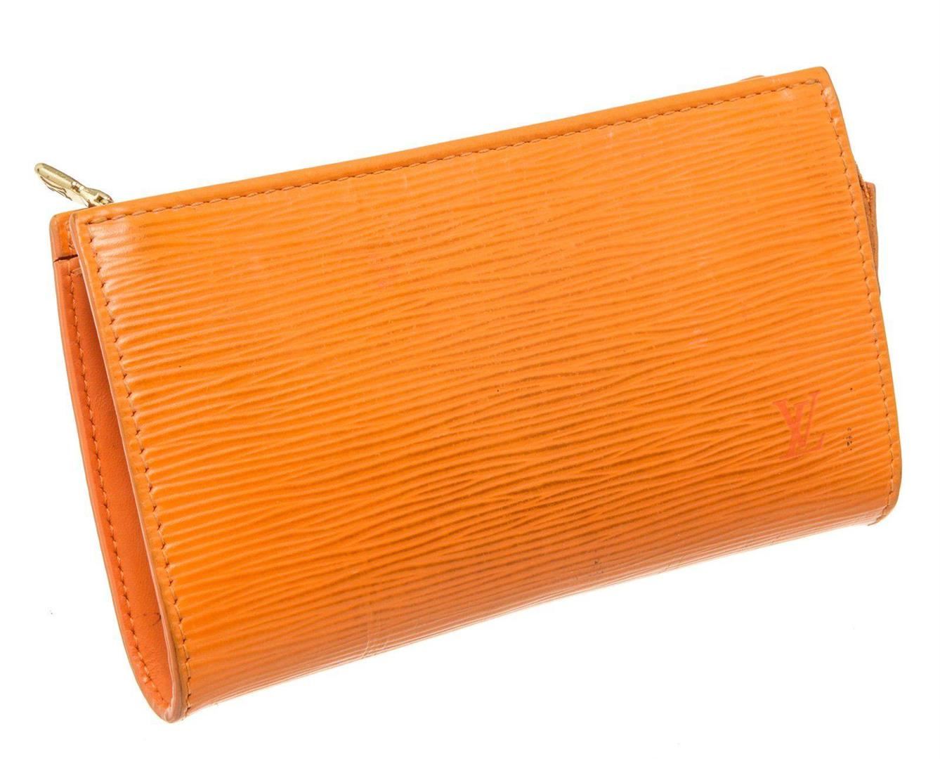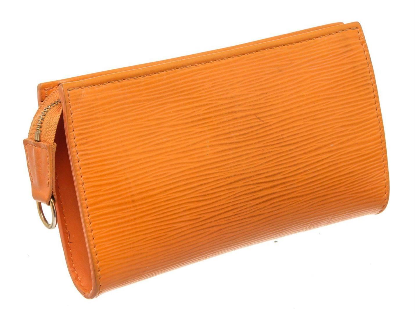 One Louis Vuitton Orange Epi Leather Pouch Wallet. Item is sold AS-IS. All available information is listed in the description and shown in the photo. Louis Vuitton Orange Epi Leather Pouch Wallet with material epi leather, gold-tone hardware, trim tan vachetta leather and zipper closure.