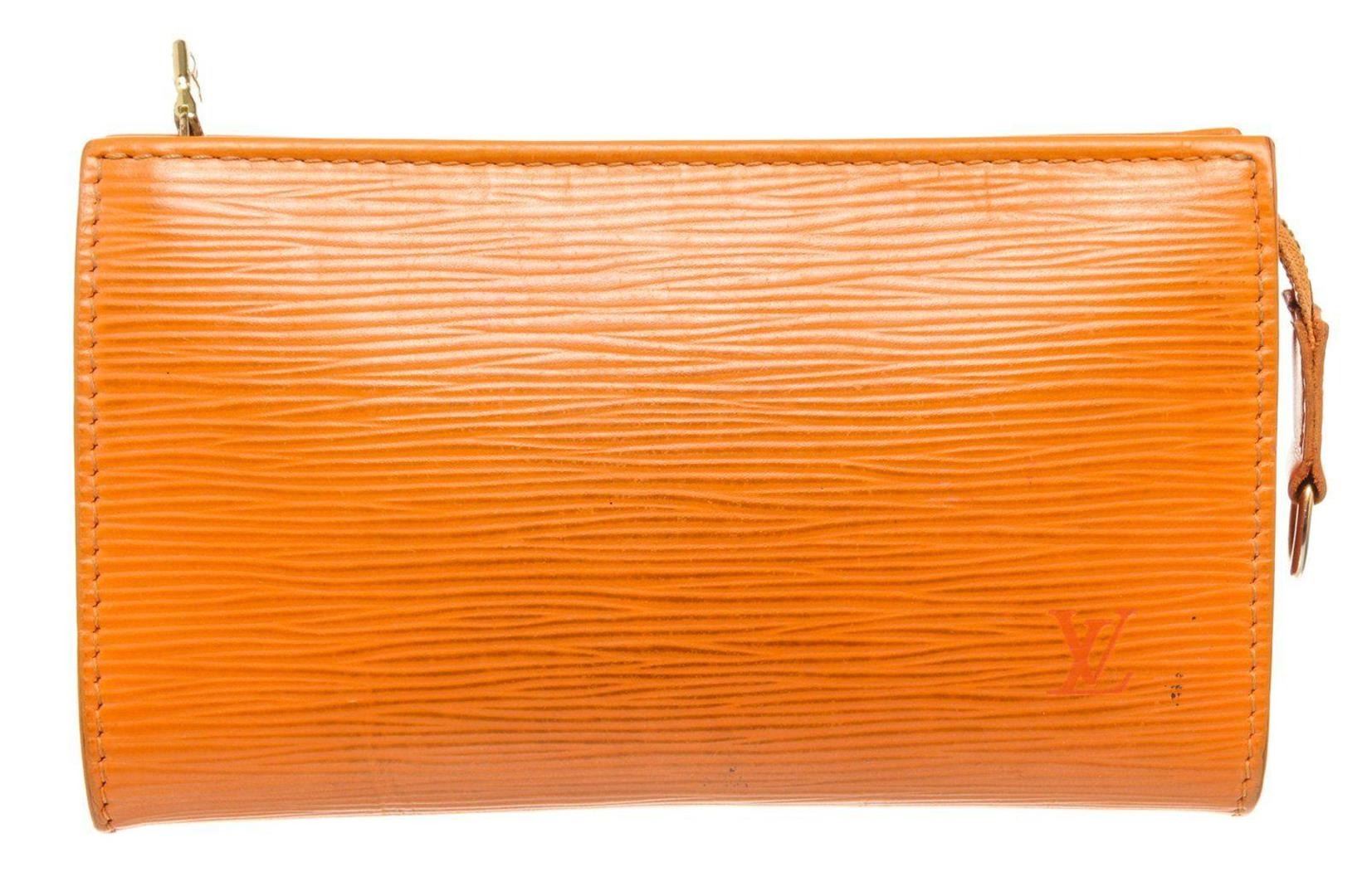 One Louis Vuitton Orange Epi Leather Pouch Wallet. Item is sold AS-IS. All available information is listed in the description and shown in the photo. Louis Vuitton Orange Epi Leather Pouch Wallet with material epi leather, gold-tone hardware, trim tan vachetta leather and zipper closure.