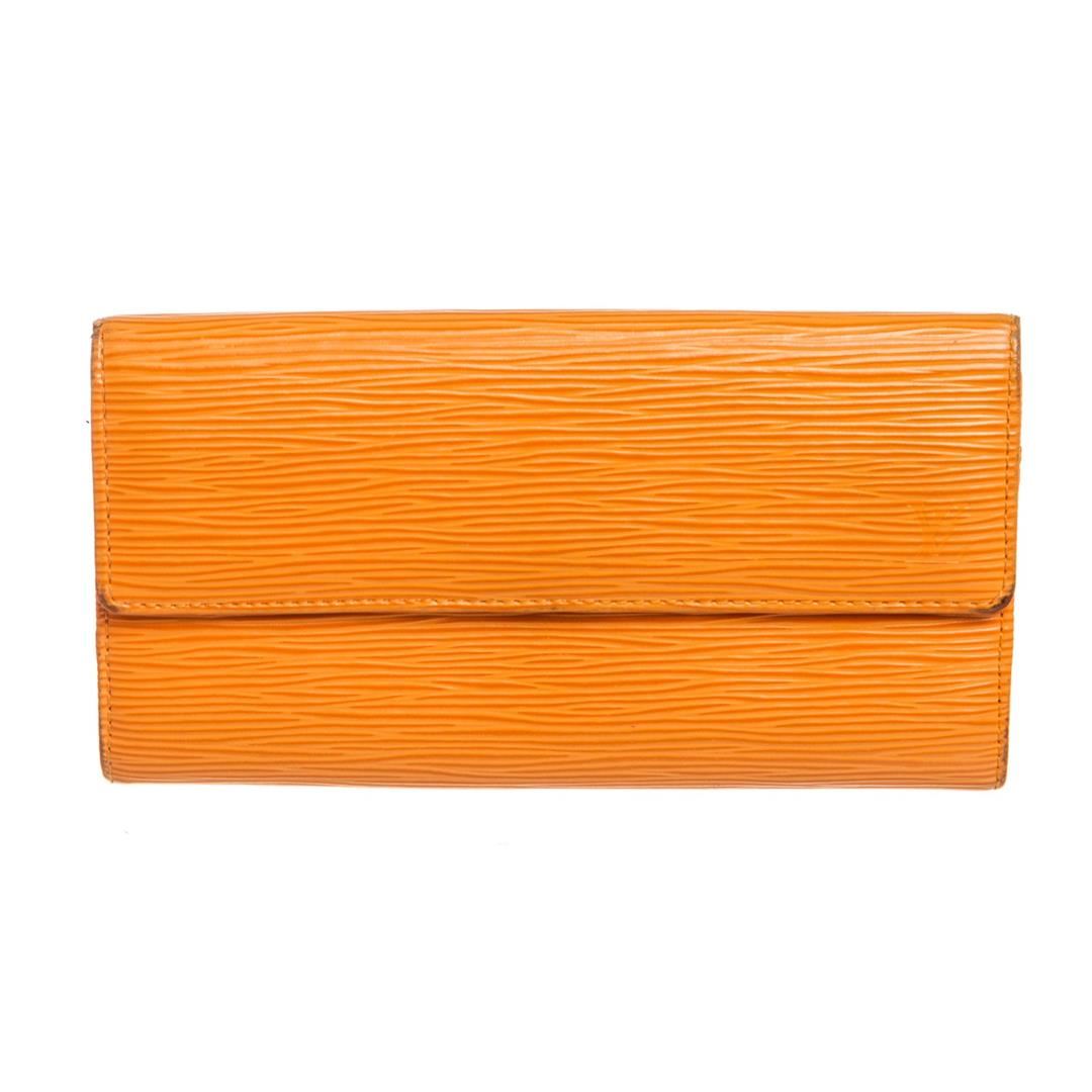 Orange Epi leather Louis Vuitton Sarah wallet with brass hardware, embossed logo at corner, tonal leather lining, single interior zip pocket, single bill compartment, six card slots and snap closure at front flap. Dimensions = 7.5"x0.75"x4"/19cmx1.9cmx10.1cm. Item is pre-owned.