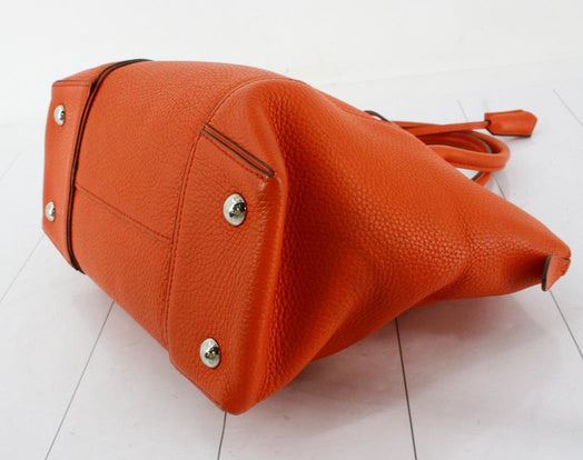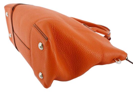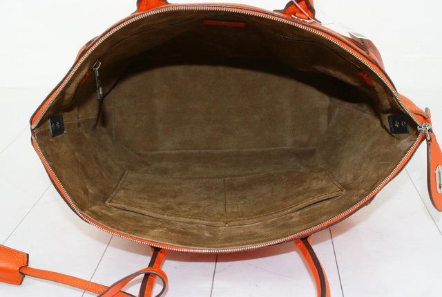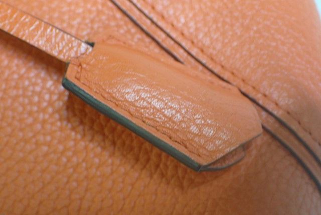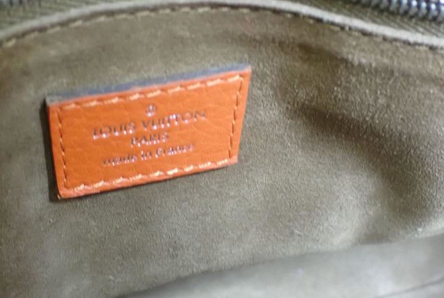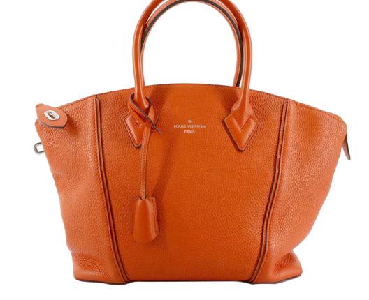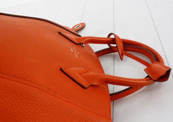 Orange Taurillon leather Louis Vuitton Soft Lockit PM with silver-tone hardware, dual rolled top handles, tawny Alcantara lining, three pockets at interior wall; one with zip closure and zip-closure at top. Height 10" Width: 14" Depth: 5" Handle Drop