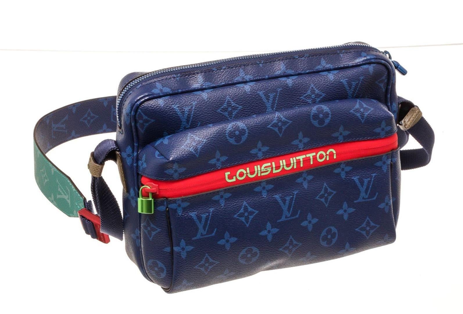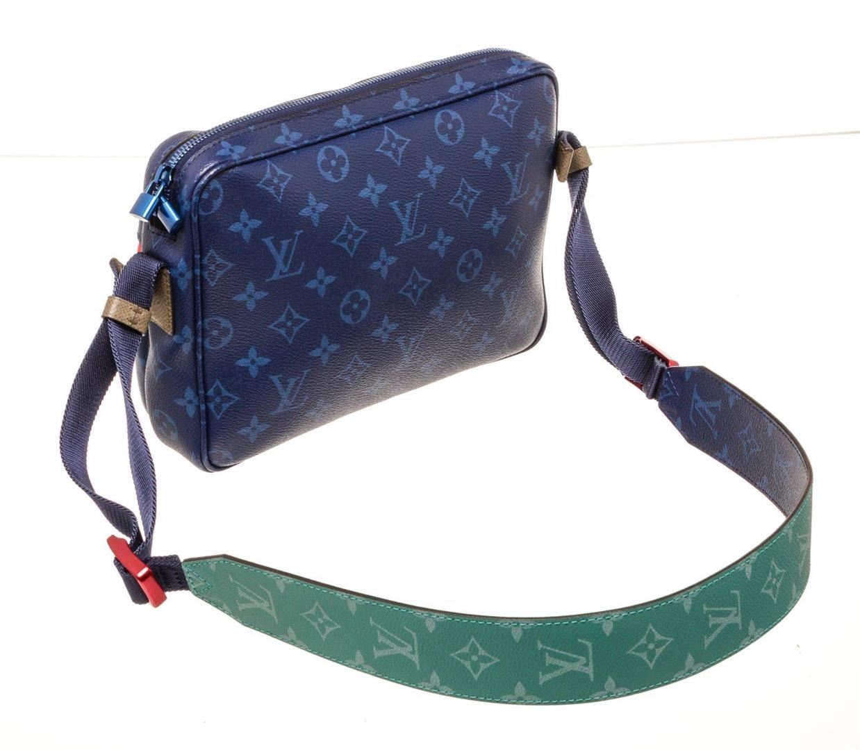 Louis Vuitton Outdoor Messenger Crossbody. Brand: Louis Vuitton, Style: Outdoor Messenger, Type: Crossbody, Exterior color: Blue Tigarama Monogram, Exterior material: Coated Canvas, Interior color: Navy, Interior material: Nylon, Length: 9.5", Width: 3",