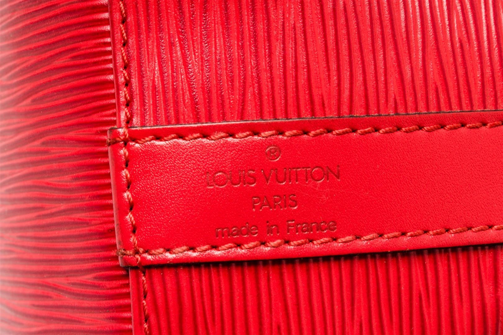 Louis Vuitton Petit Noe Shoulder Bag. Brand: Louis Vuitton, Style: Petit Noe, Type: Shoulder Bag, Exterior color: Castilian Red, Exterior material: Epi Leather, Interior color: Red, Interior material: Alcantara, Length: 10", Width: 7.5", Height: 10.5". It