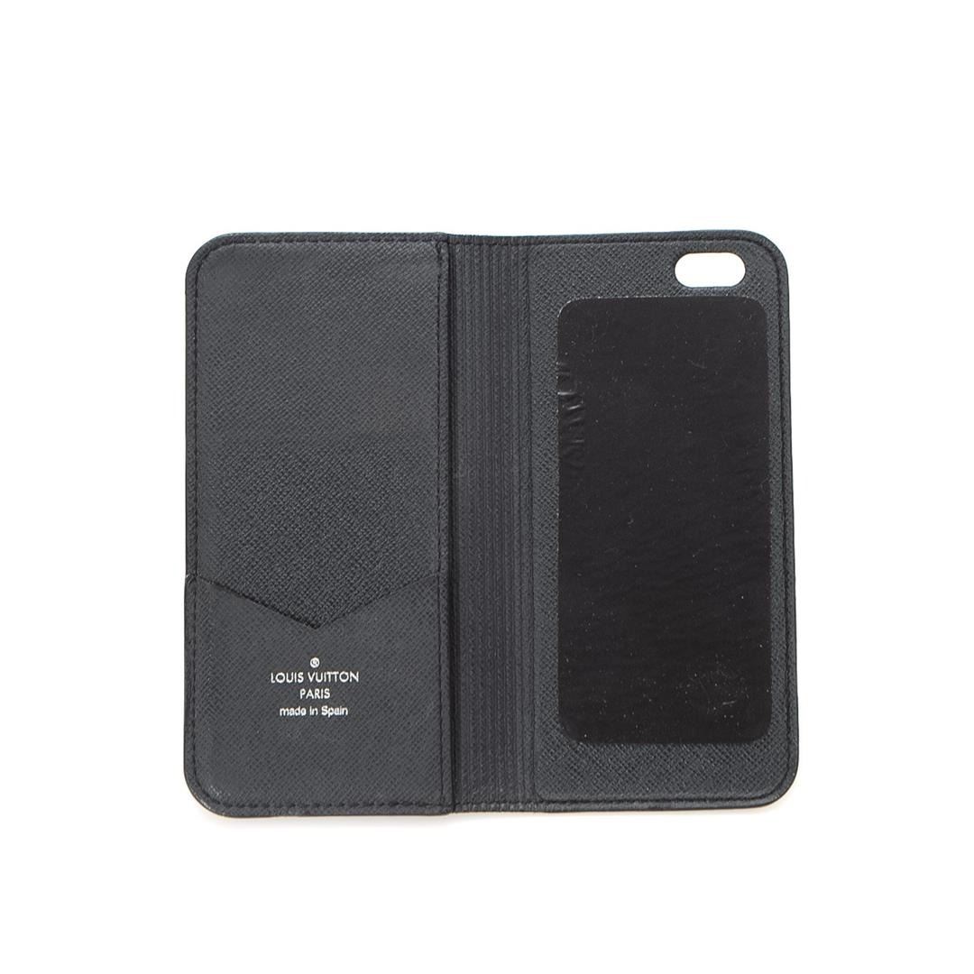 Louis Vuitton Phone Cover Case. Brand: Louis Vuitton, Style: Phone Cover, Type: Case, Exterior color: Black Taiga, Exterior material: Leather, Interior color: Black, Interior material: Coated Canvas, Length: 3, Width: 1, Height: 6. Item is sold AS-IS and