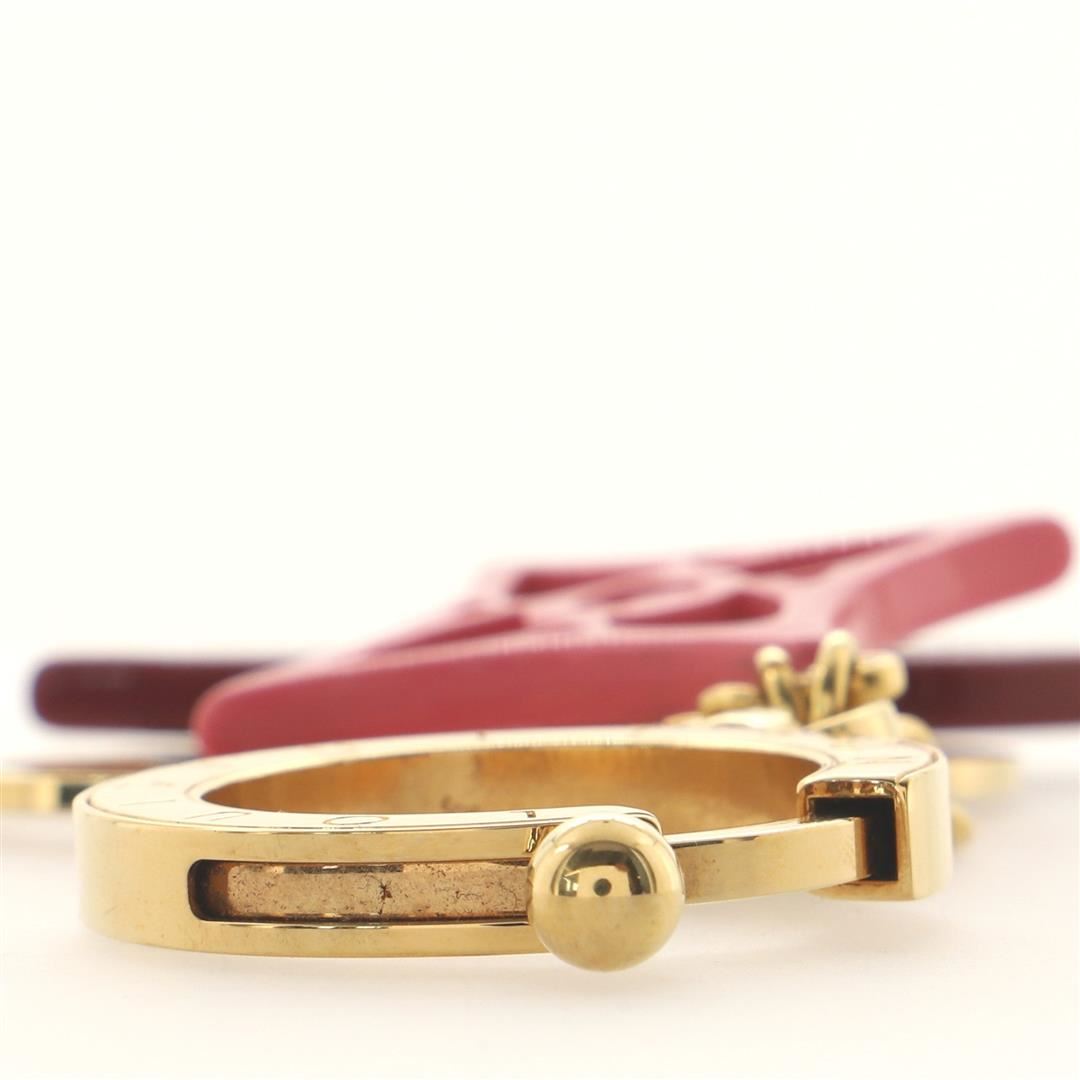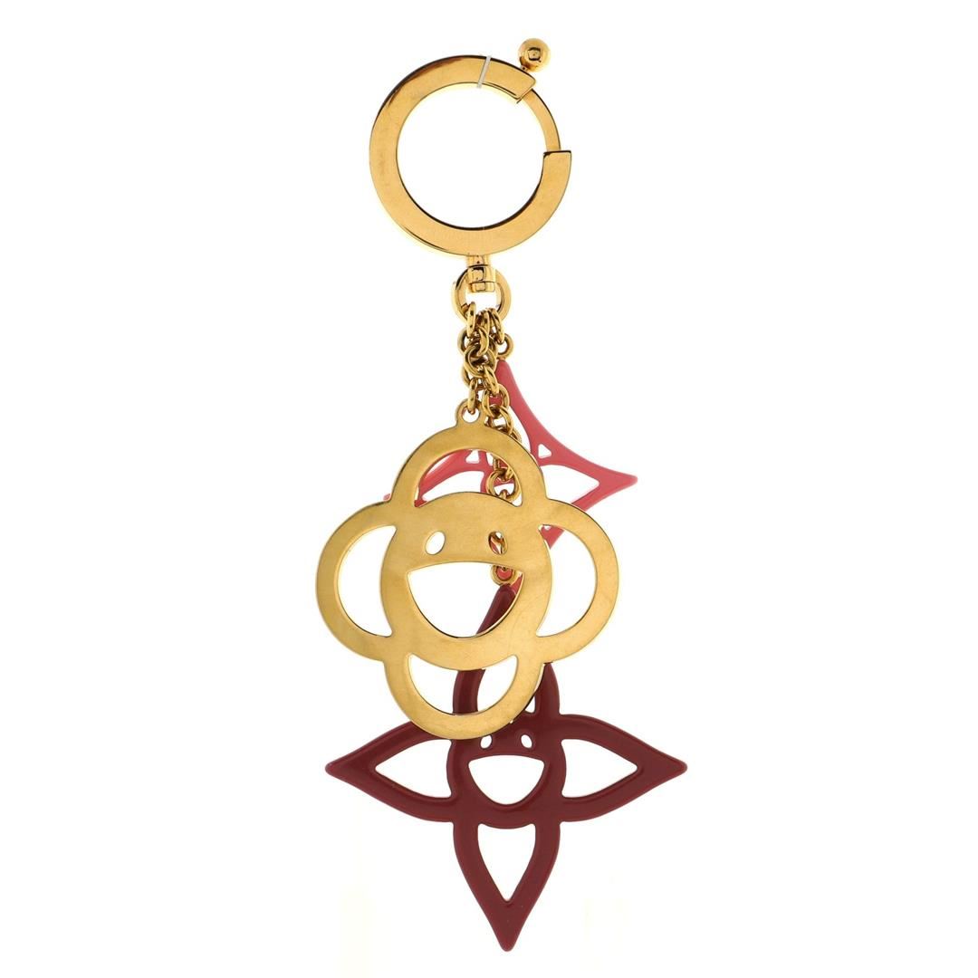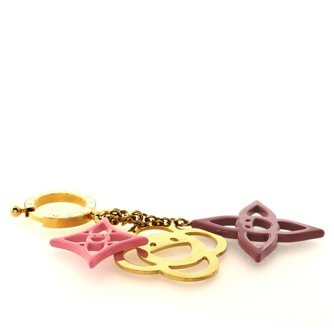 Louis Vuitton Pink Cosmic Resin and Brass Blossom Bag Charm features gold-tone hardware with gold, burgundy and pink flowers.