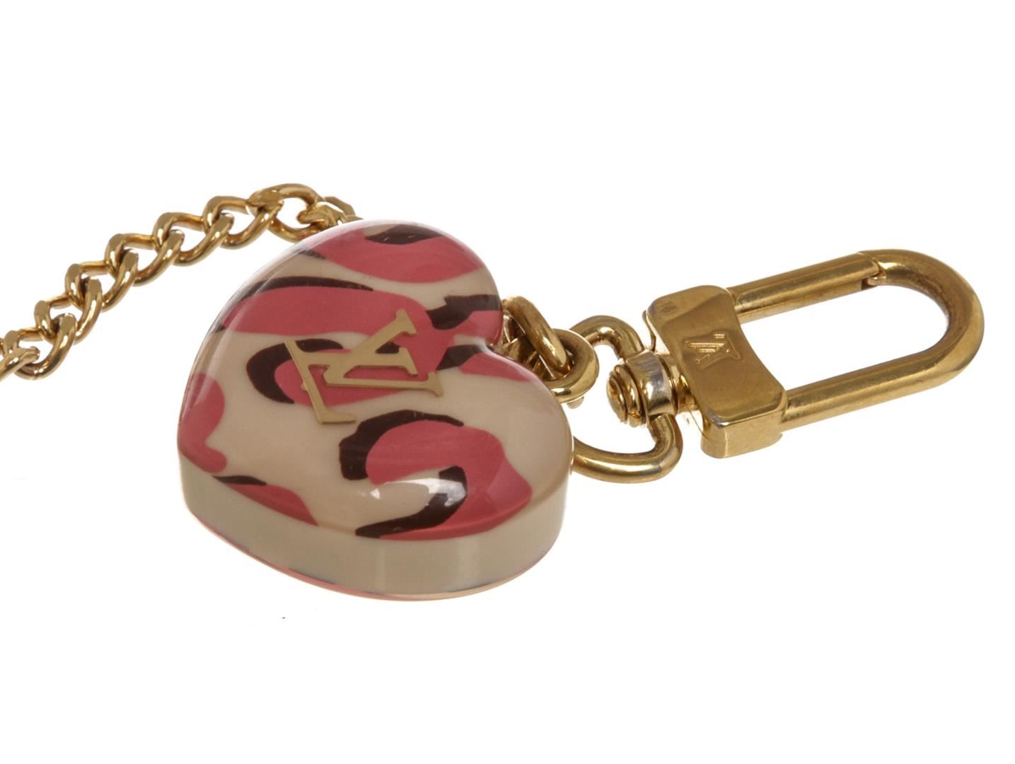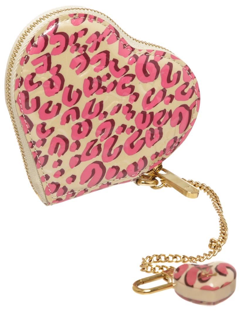 Louis Vuitton Stephen Sprouse limited edition pink and creamcheetah Vernis leather Heart Coin Wallet with gold-tone hardware, chain-link with heart charm and lobster claps, cream leather lining, zip around closure. Authentic.