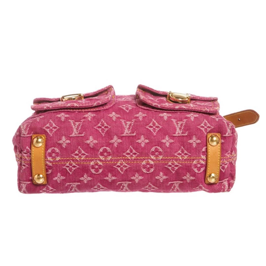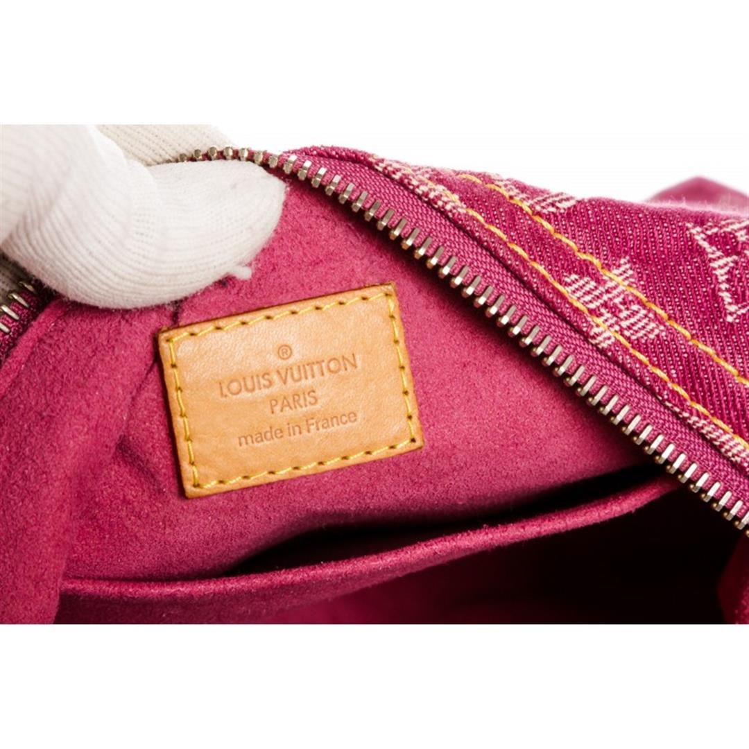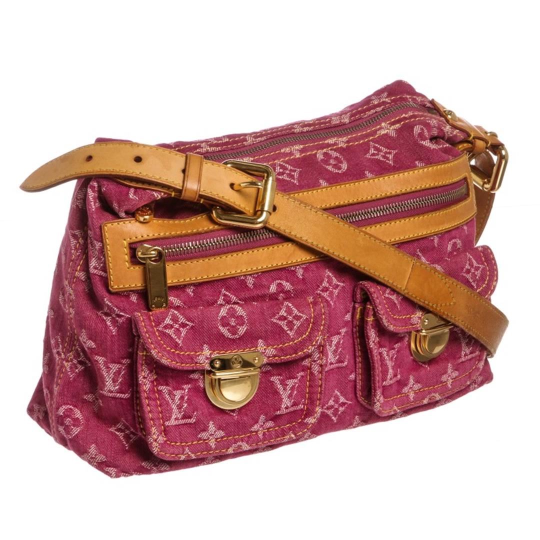 Wash monogram denim Louis Vuitton Baggy PM with brass hardware, tan vachetta leather trim, single flat shoulder strap, three exterior pockets; one with zip closure, marigold Alcantara lining, single interior slit pocket and zip closure at top. Item is pre-owned.
