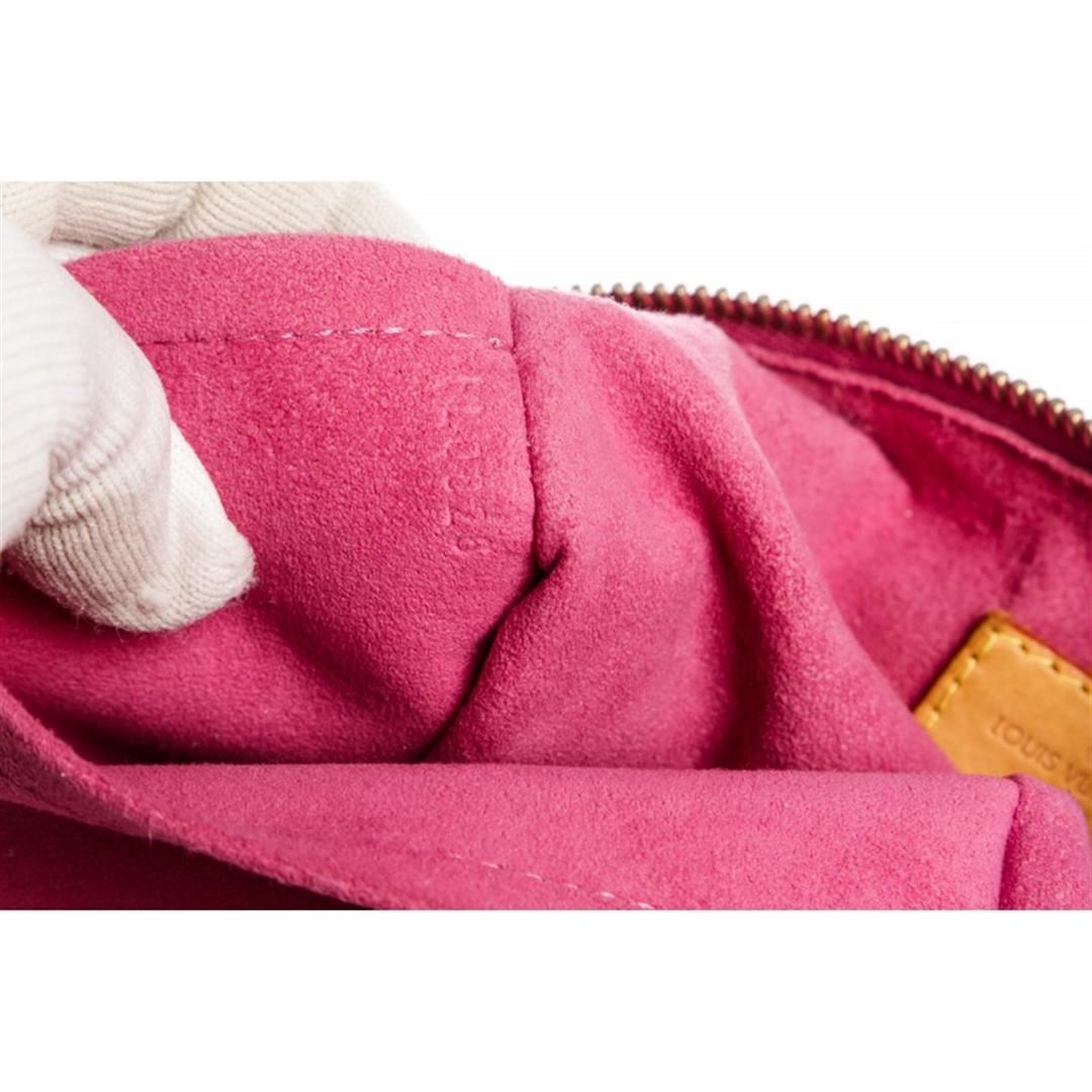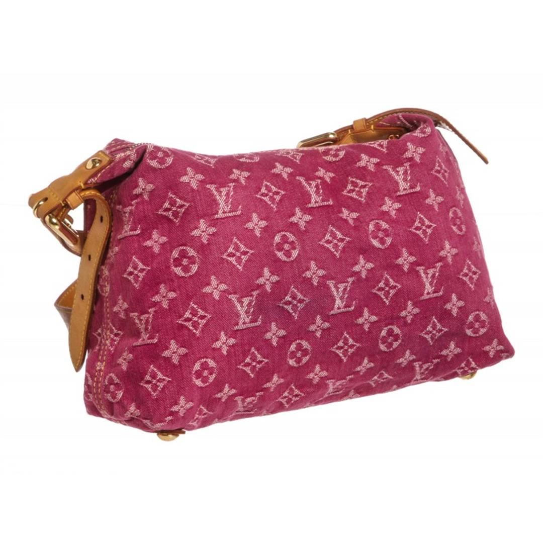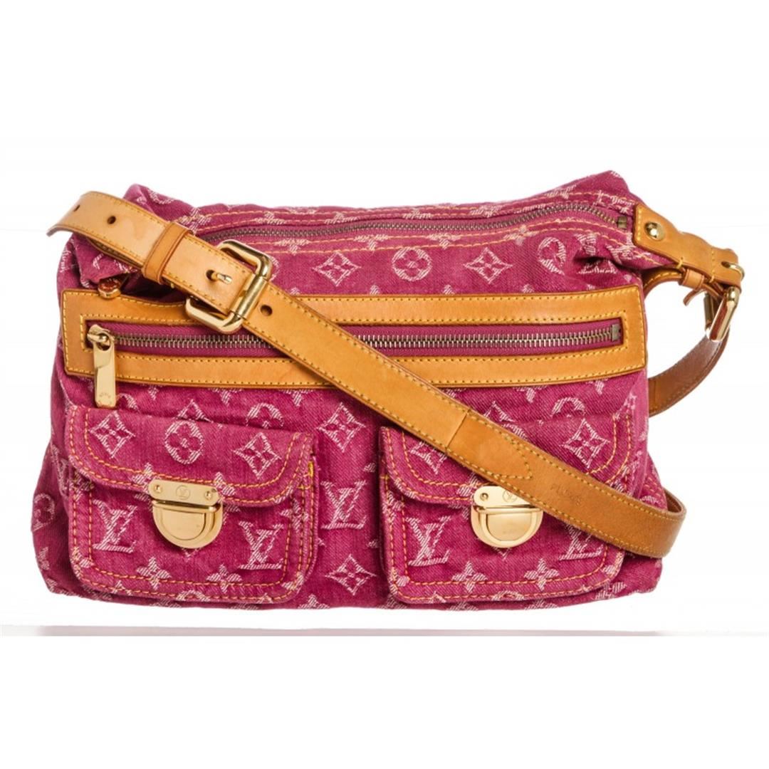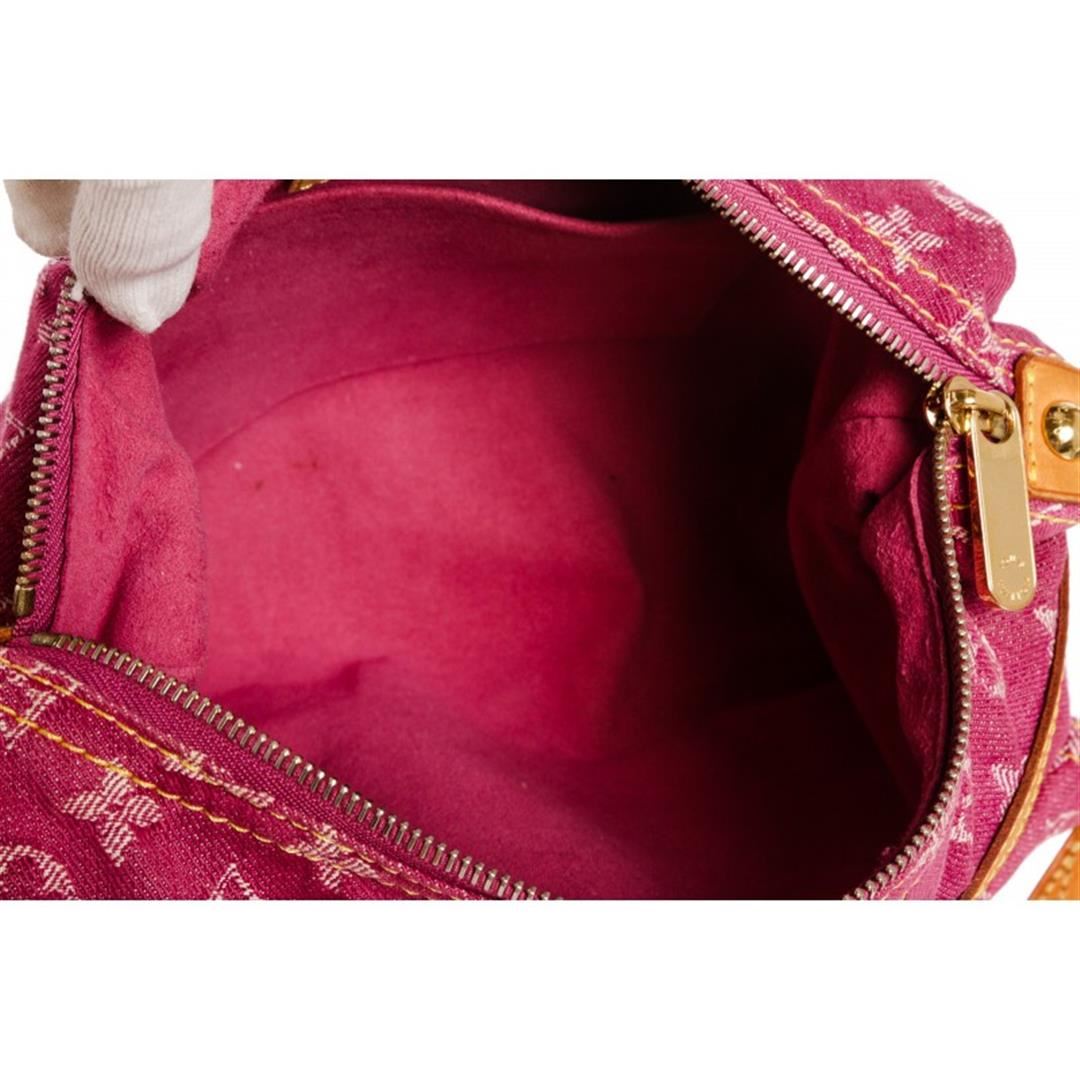 Wash monogram denim Louis Vuitton Baggy PM with brass hardware, tan vachetta leather trim, single flat shoulder strap, three exterior pockets; one with zip closure, marigold Alcantara lining, single interior slit pocket and zip closure at top. Item is pre-owned.