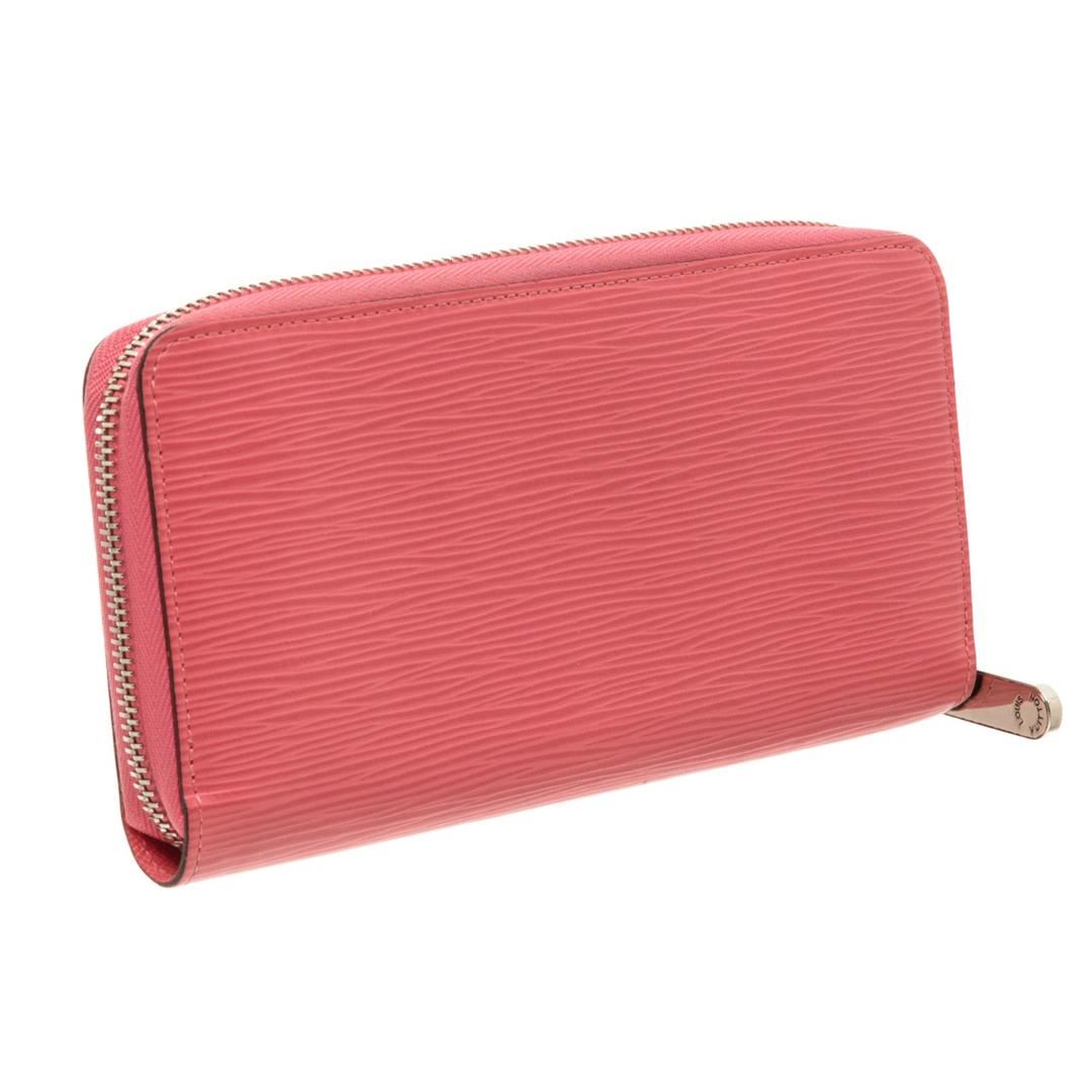Pink Epi leather Louis Vuitton Zippy wallet with silver-tone hardware, tonal leather lining, dual bill compartments, single zip pocket at interior wall, ten card slots and zip-around closure.