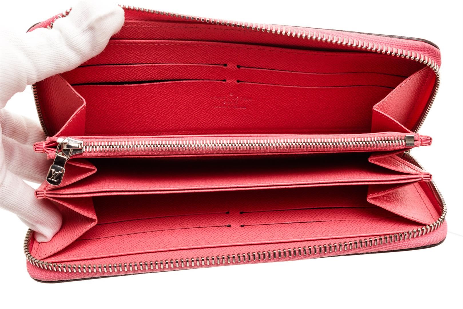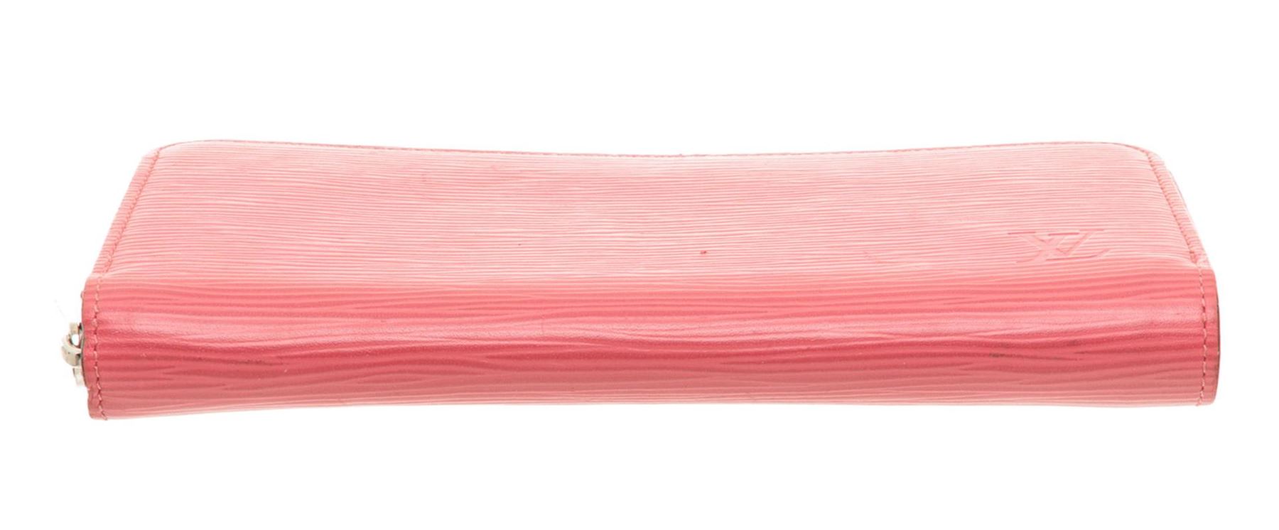 Pink Epi leather Louis Vuitton Zippy wallet with silver-tone hardware, tonal leather lining, dual bill compartments, single zip pocket at interior wall, ten card slots and zip-around closure.
