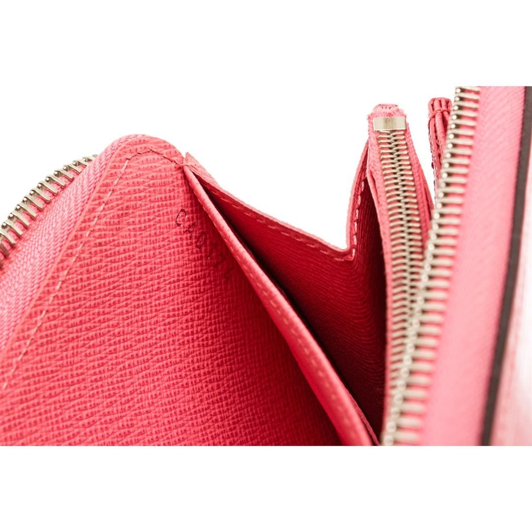 Pink Epi leather Louis Vuitton Zippy wallet with silver-tone hardware, tonal leather lining, dual bill compartments, single zip pocket at interior wall, ten card slots and zip-around closure.