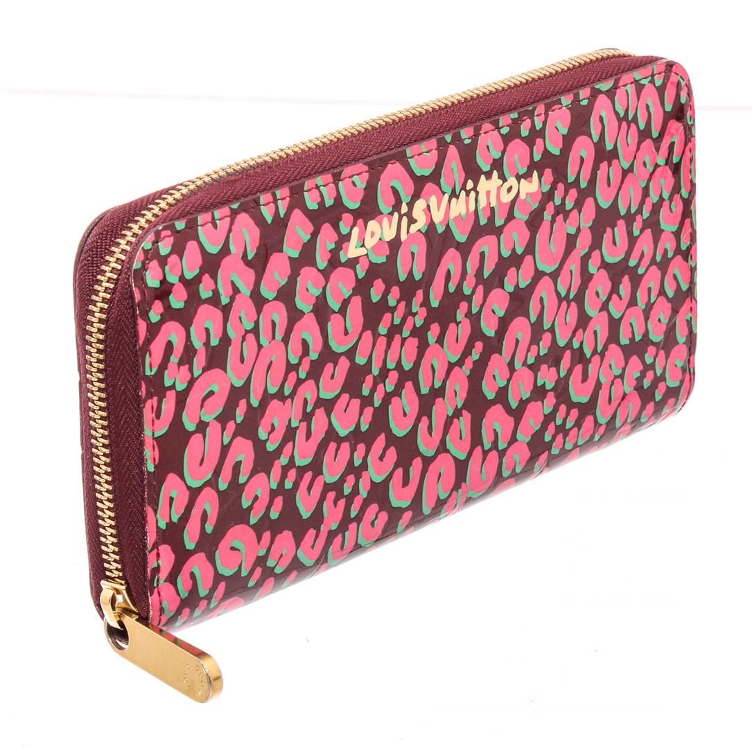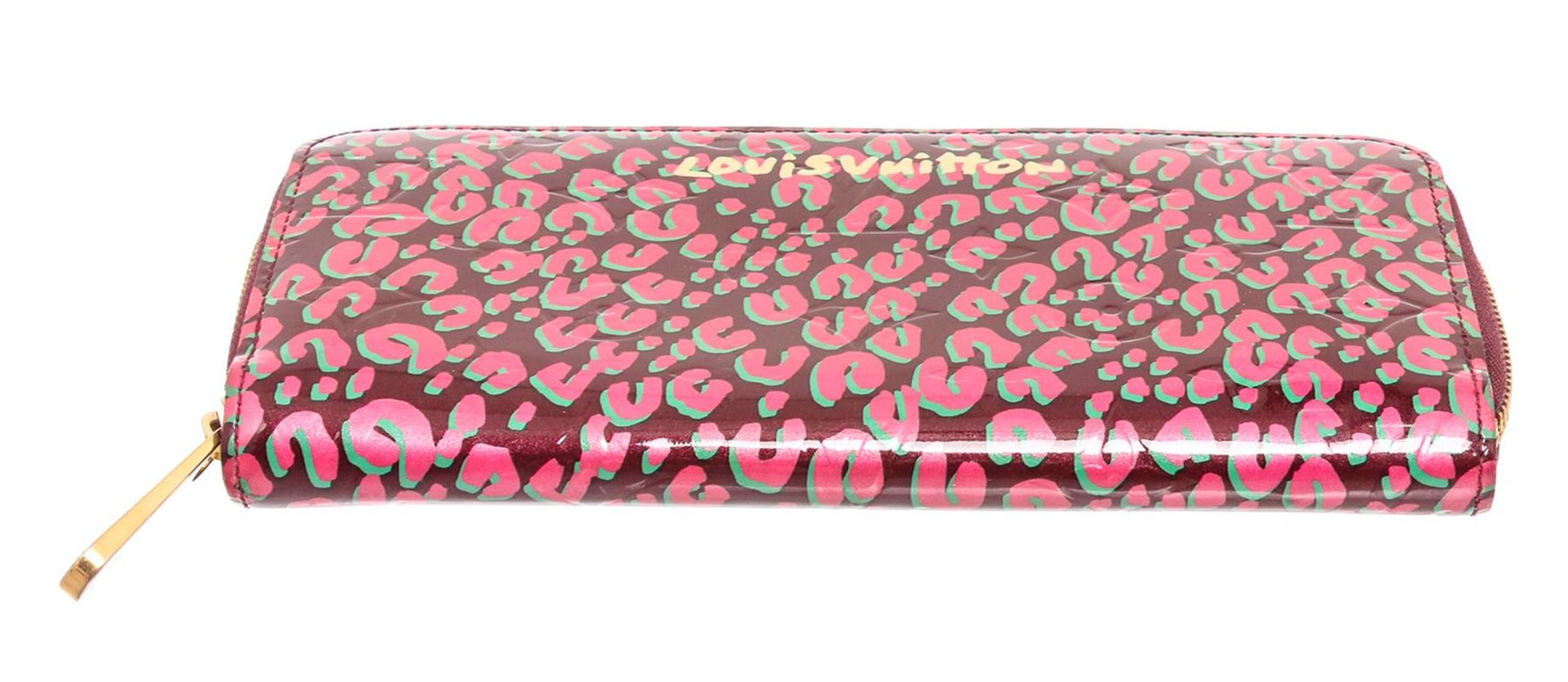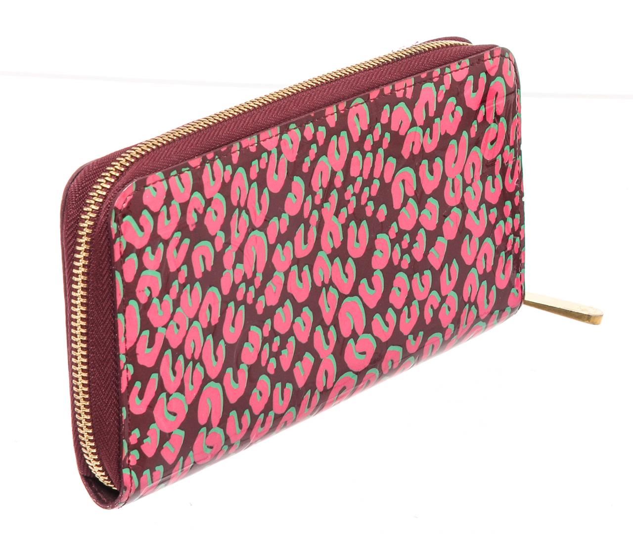 Burgundy and pink leopard print monogram Vernis leather Louis Vuitton Zippy wallet with brass hardware, green printed logo accent at front, tonal leather interior lining, five compartments; one with zip closure, dual bill compartments at interior walls, eight card slots and zip-around closure at top.
