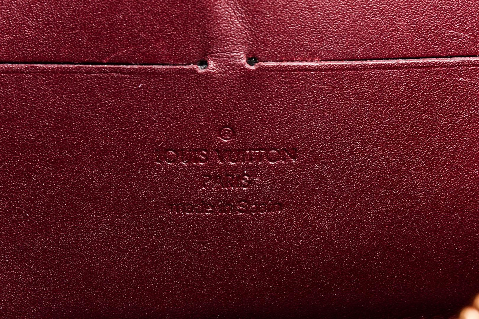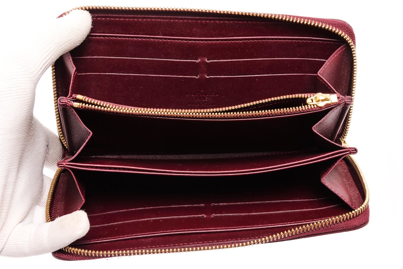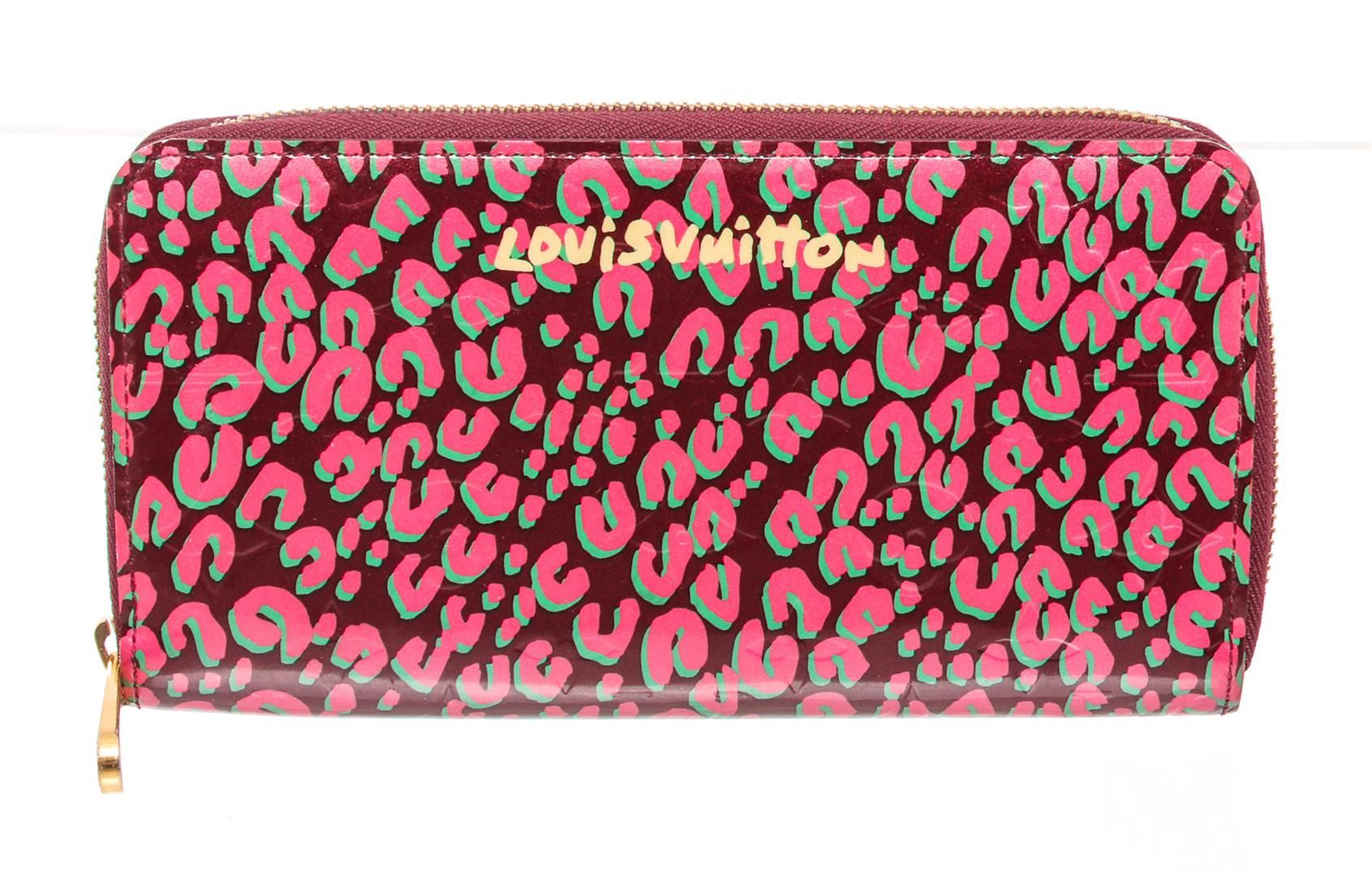 Burgundy and pink leopard print monogram Vernis leather Louis Vuitton Zippy wallet with brass hardware, green printed logo accent at front, tonal leather interior lining, five compartments; one with zip closure, dual bill compartments at interior walls, eight card slots and zip-around closure at top.