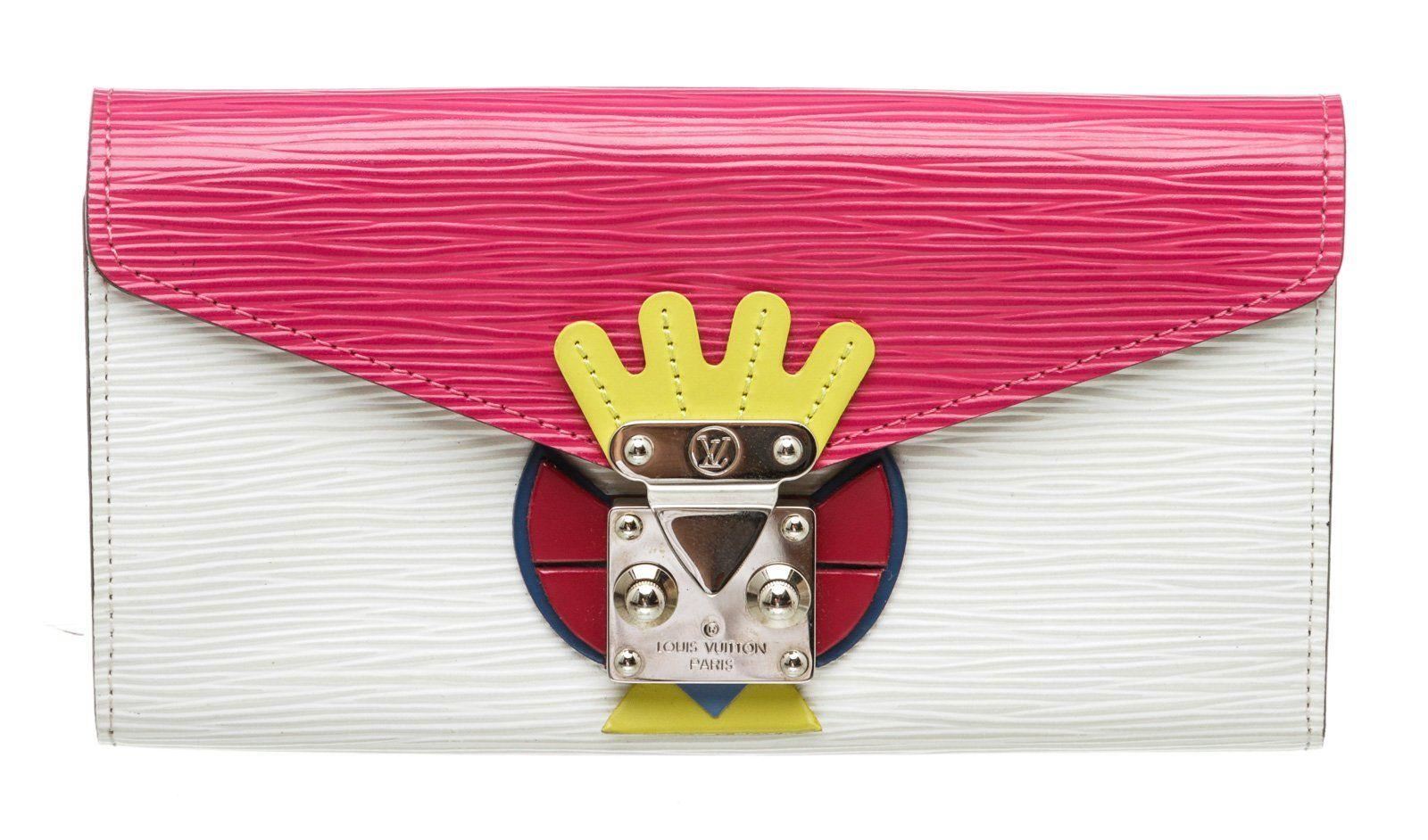 Pink and white multicolor Epi leather Louis Vuitton Tribal Mask Sarah wallet with silver-tone hardware, multicolor leather mask detail at front, exterior slit pocket at back, dual card slots and front flap underside, pink textured leather lining, three interior compartments; one with zip closure, 12 card slots, single bill compartment at interior wall and S-lock closure at front flap. Measurements: Length: 7.25 in / 18 cm Width: 1 in / 3 cm 4.25 in / 11 cm Condition: Pre-Owned Good overall, please see photographs for detail.