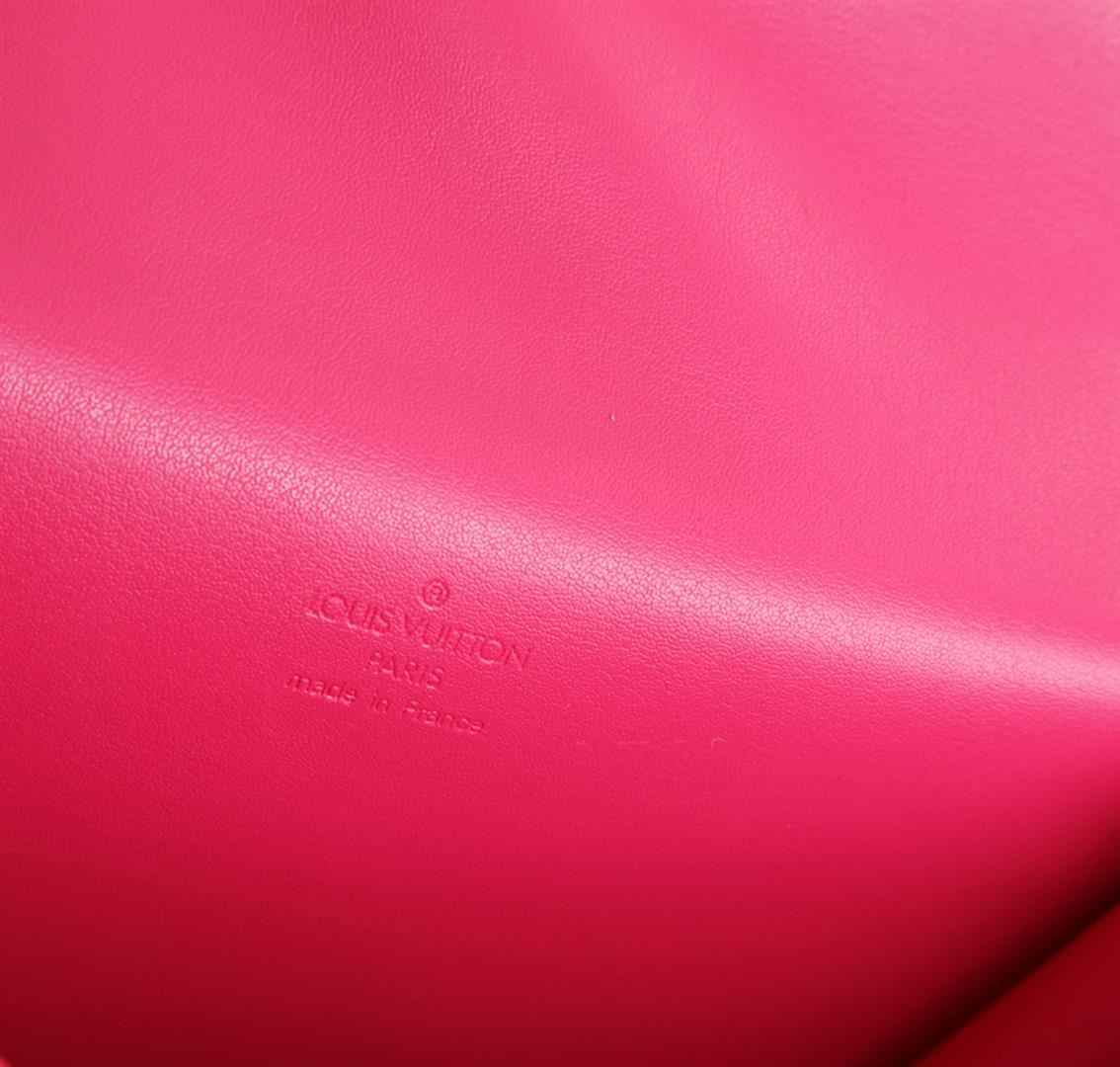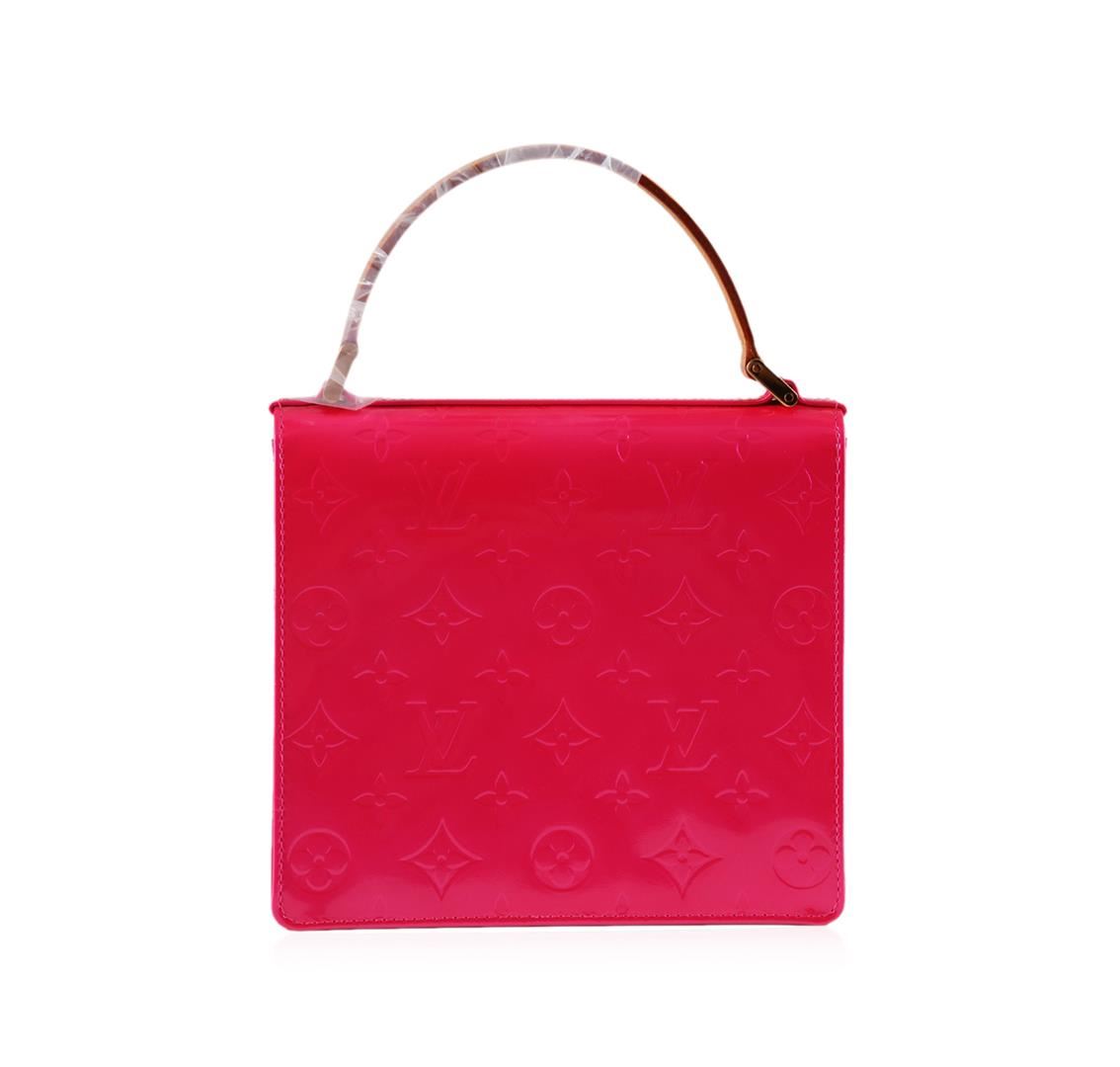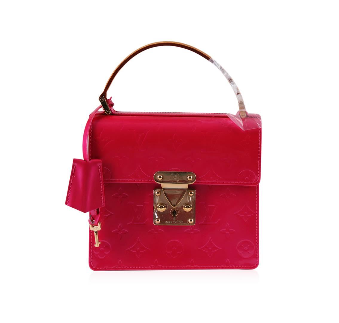 One Louis Vuitton pink patent leather monogrammed handbag in like new condition, measuring approximately 7.5 inches wide by 6.5 inches tall by 3.25 inches deep. The bag is lockable and comes with an attachable clochette and Louis Vuitton box.