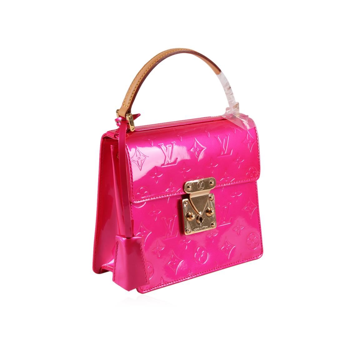 One Louis Vuitton pink patent leather monogrammed handbag in like new condition, measuring approximately 7.5 inches wide by 6.5 inches tall by 3.25 inches deep. The bag is lockable and comes with an attachable clochette and Louis Vuitton box.