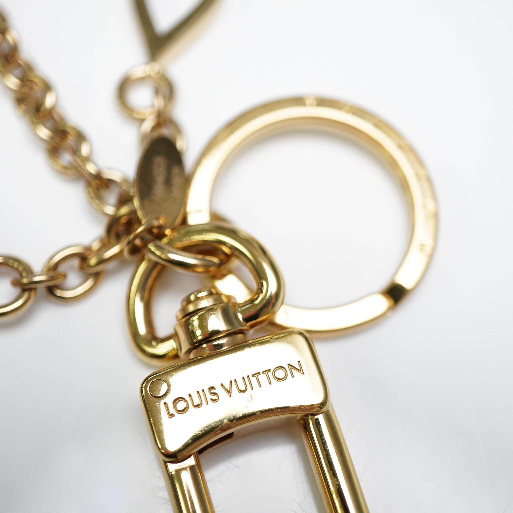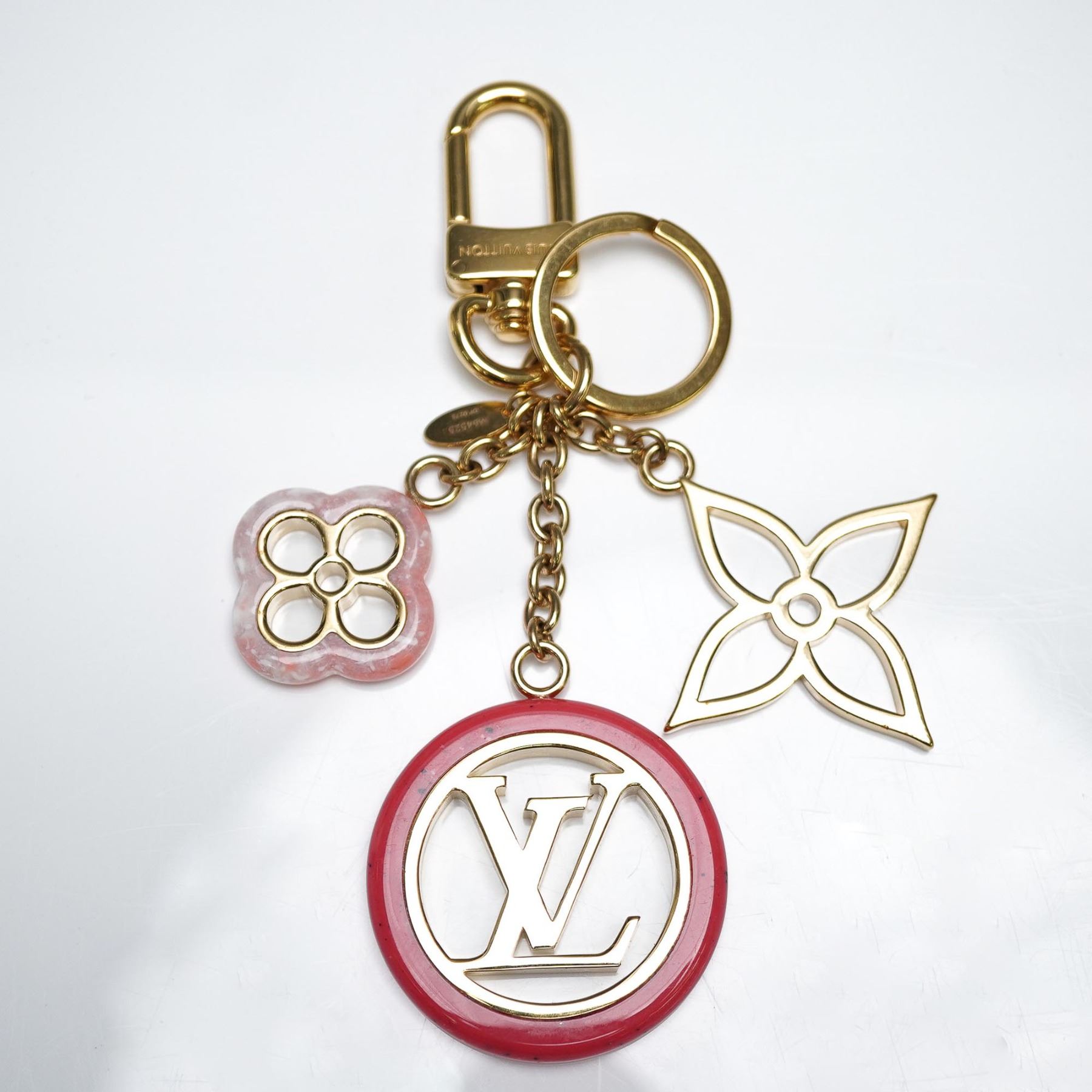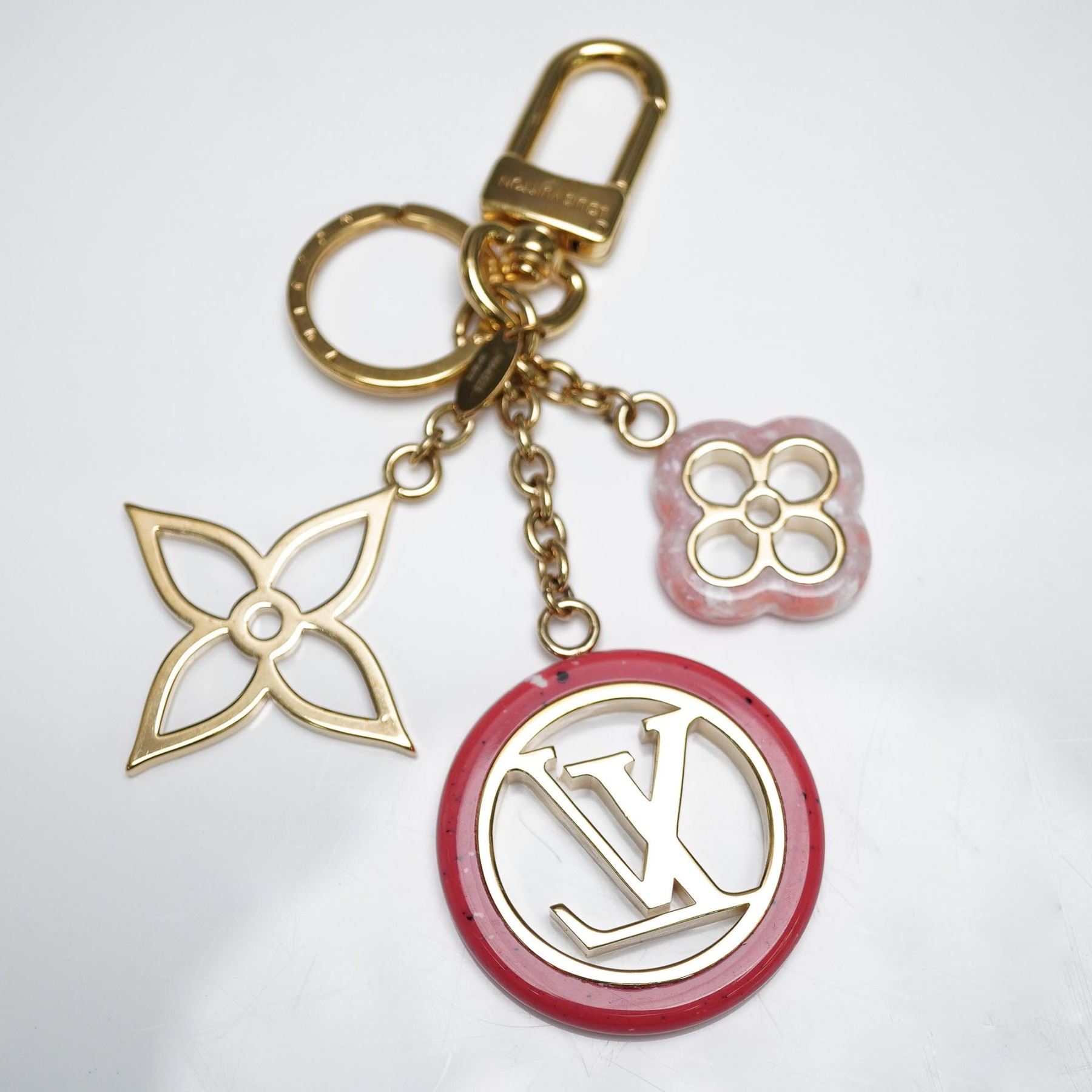 Louis Vuitton Colorline Bag Charm and Key Holder featuring a pink and gold-tone design. The piece includes three attached charms: a Louis Vuitton LV monogram set within a dark pink speckled ring; a gold-tone metal four-petal flower; and a second gold-tone metal four-petal flower outlined with a pink confetti pattern. Designed for use as either a bag charm or key holder, the piece includes a snap hook and a circular key ring, both engraved with the Louis Vuitton name. This accessory is crafted in metal with an enamel finish on the pink elements. M64525.
