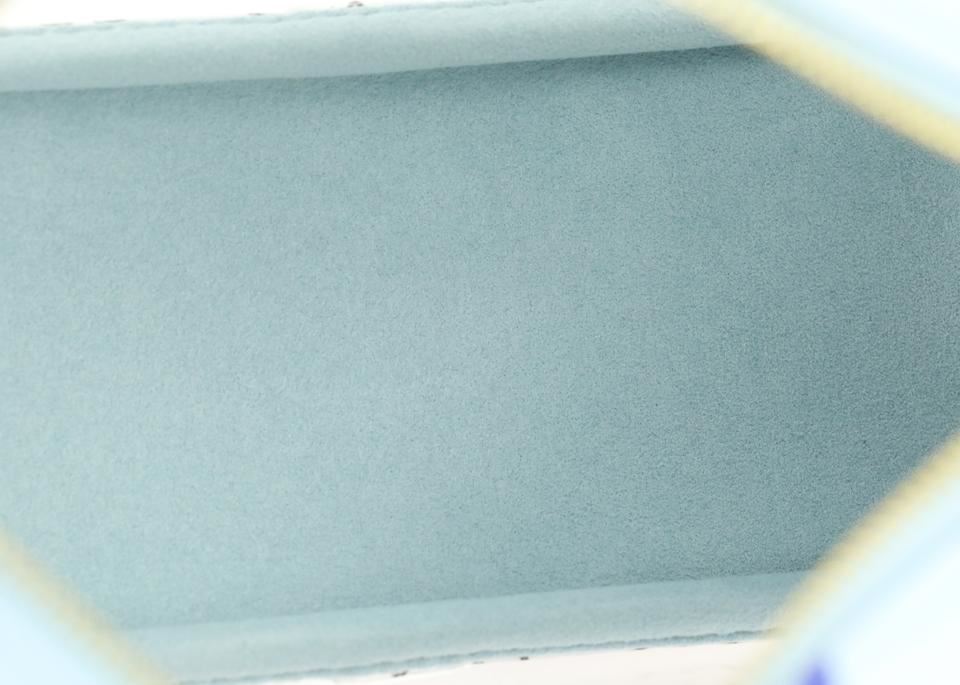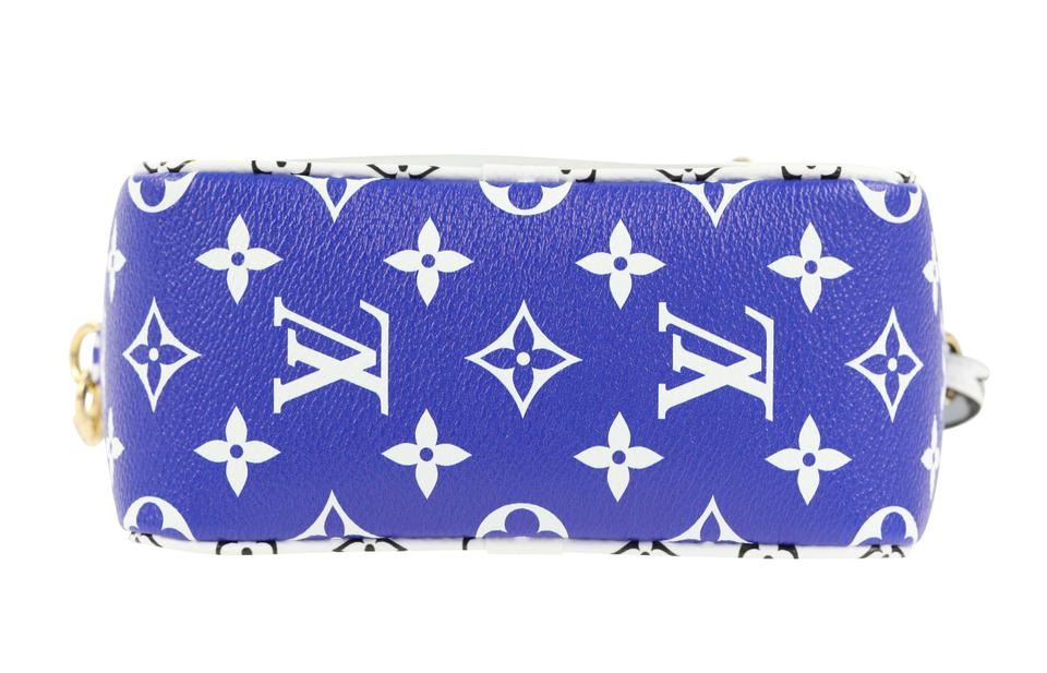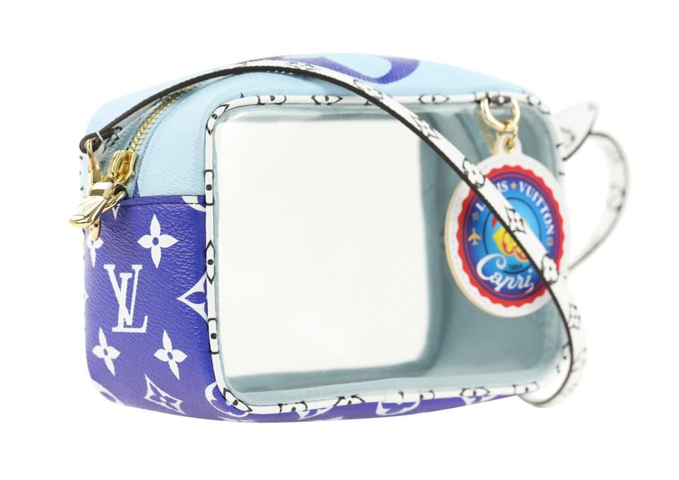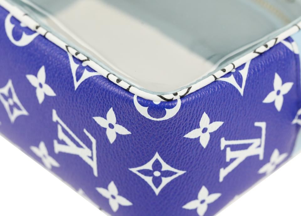 Louis Vuitton Monogram Beach Pouch Strap drop approx. 8.5" Single coated canvas strap that is removable It can be worn at the curve of the arm Length at longest point 6.5" Coated canvas Transparent PVC featured at the front and back Blue Structure of bag is hard- it can stand on its own Top zipper closure Gold-tone hardware Microfiber lined interior Made in France