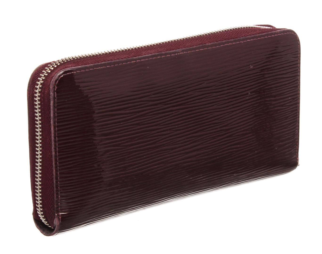 Prune color Electric Epi leather Louis Vuitton Zippy wallet with silver-tone hardware, embossed logo at front, tonal grained leather lining, interior bill compartments; one with zip closure, eight card slots at interior walls and zip-around closure at exterior.