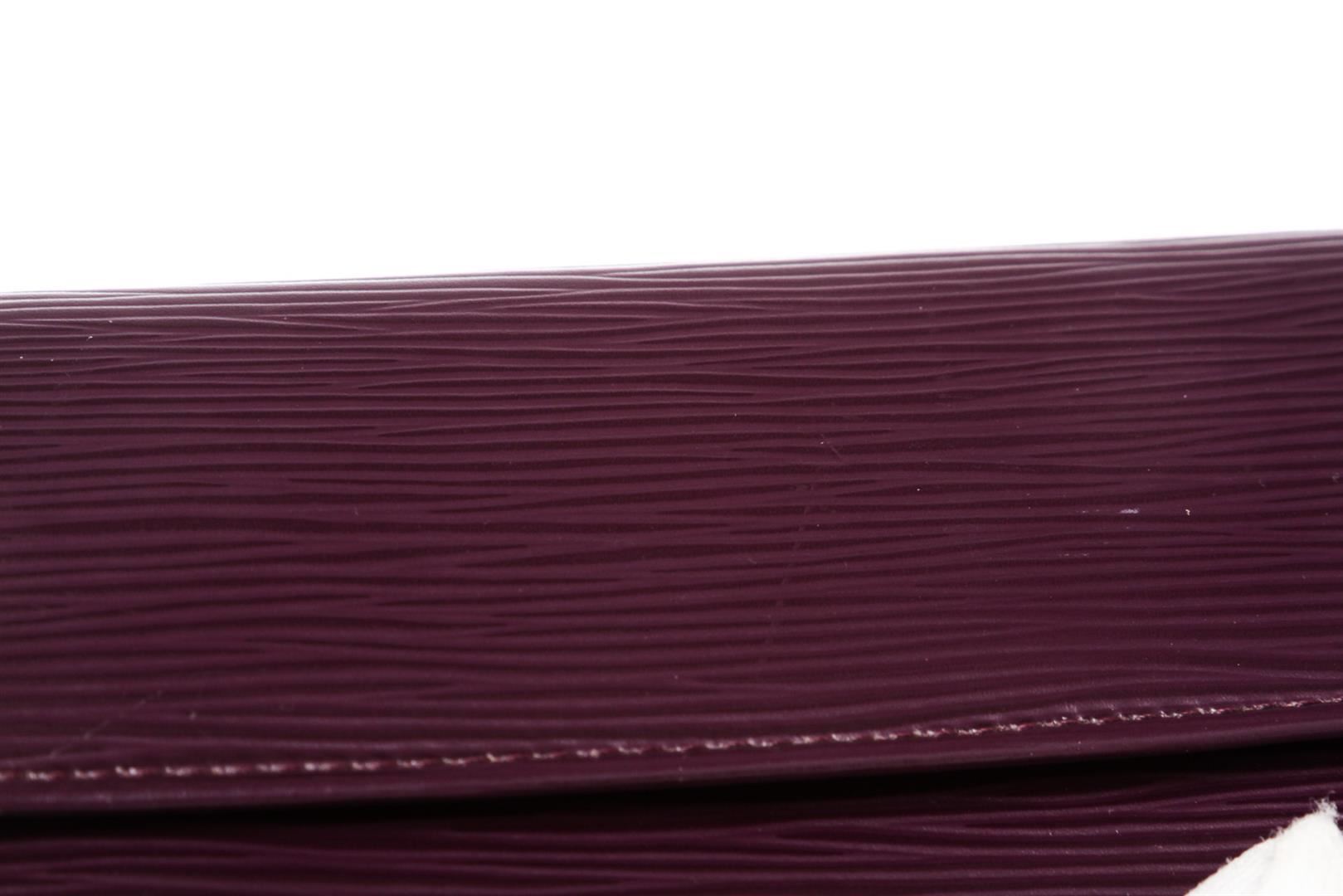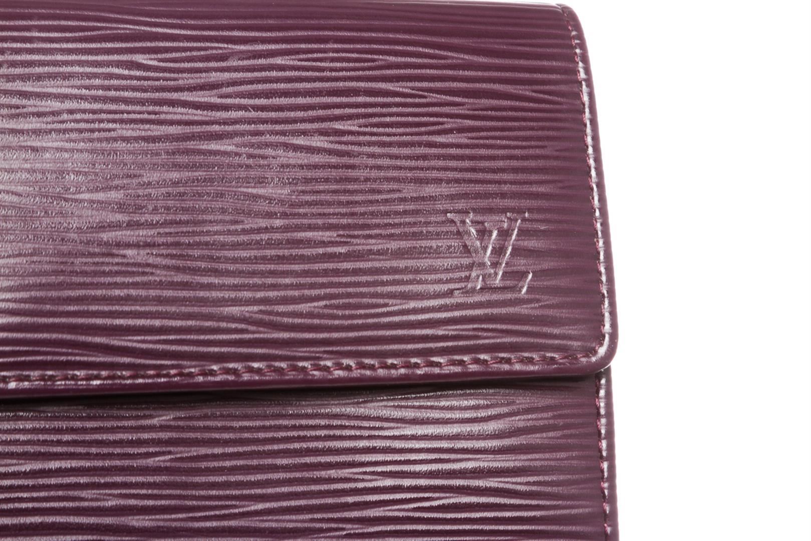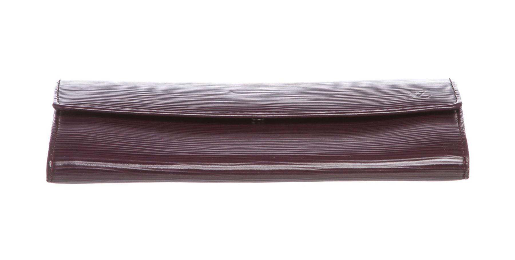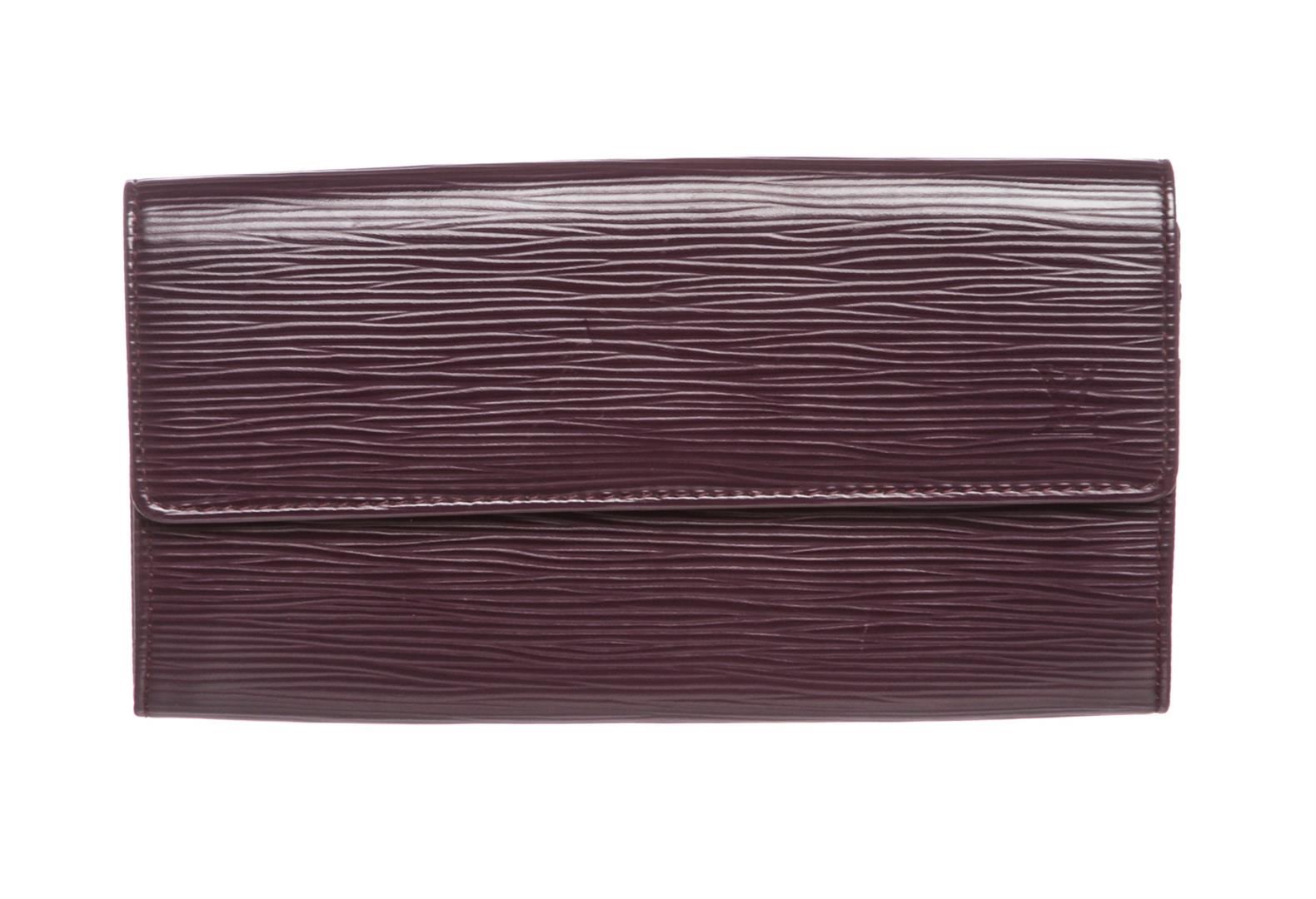 Epi leather Louis Vuitton Sarah wallet with brass hardware, embossed logo at corner, tonal leather lining, single interior zip pocket, single bill compartment, six card slots and snap closure at front flap. Authentic.