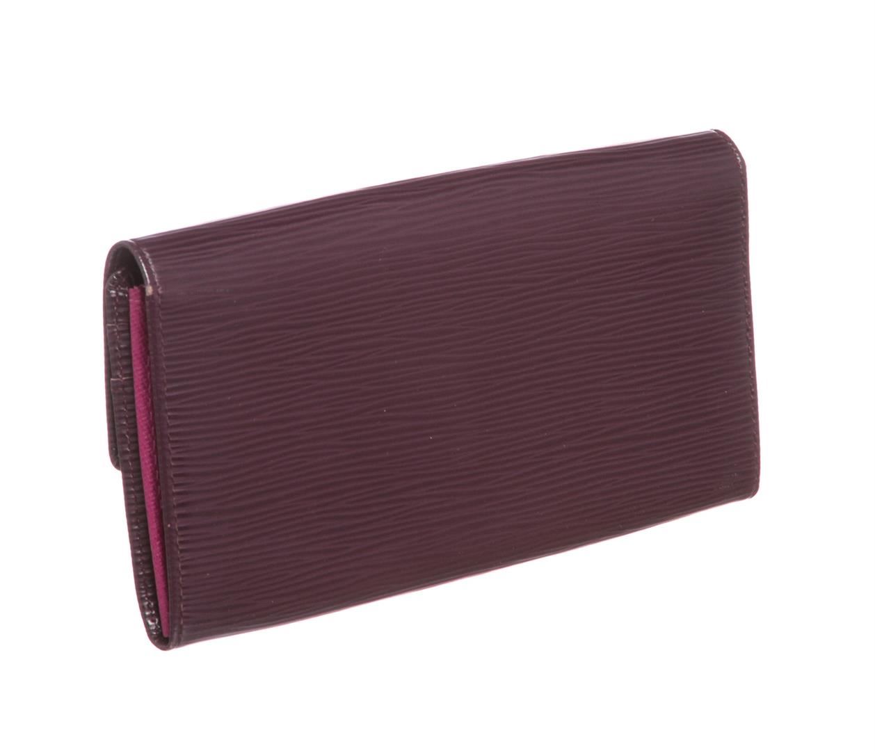 Epi leather Louis Vuitton Sarah wallet with brass hardware, embossed logo at corner, tonal leather lining, single interior zip pocket, single bill compartment, six card slots and snap closure at front flap. Authentic.
