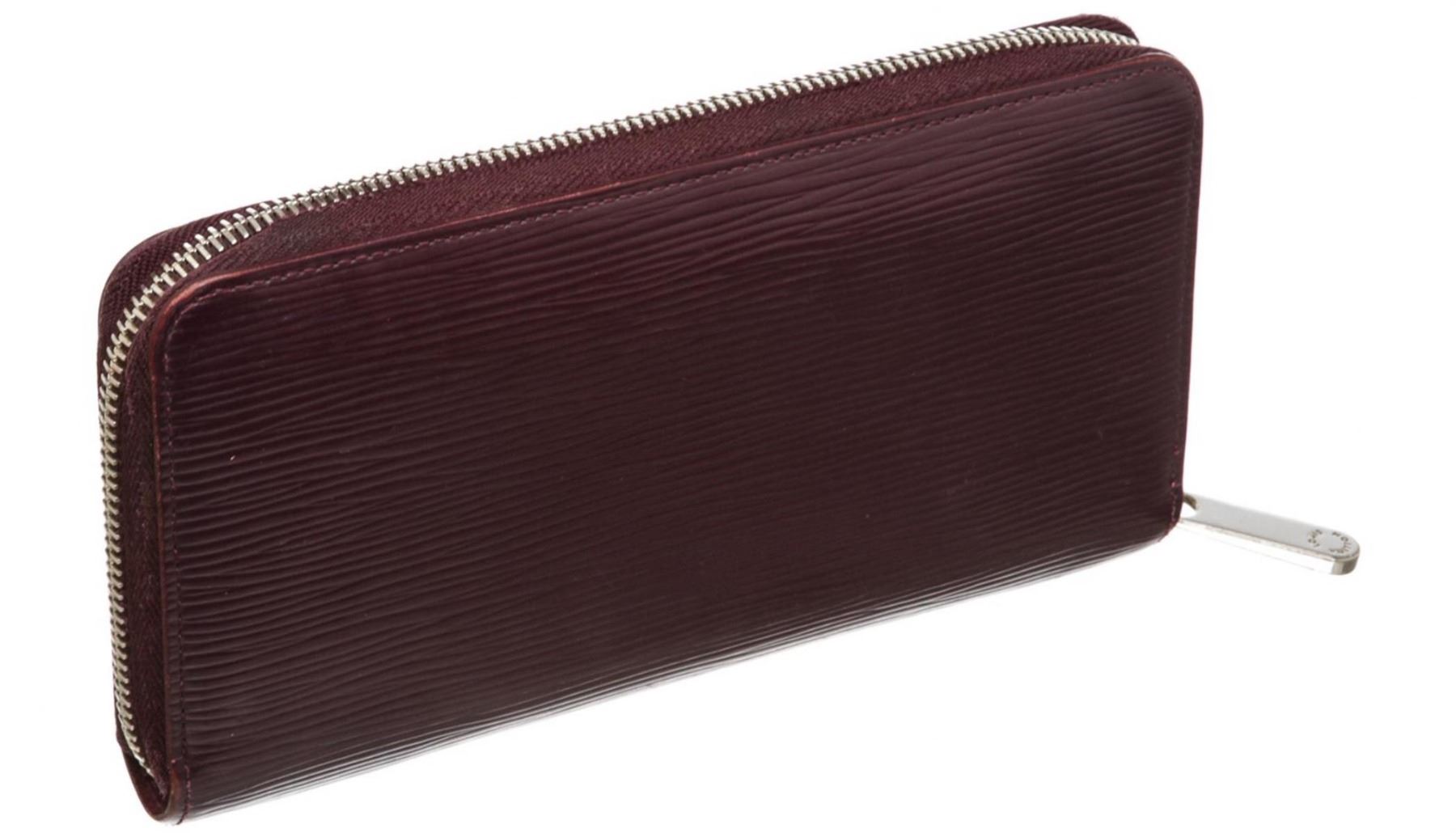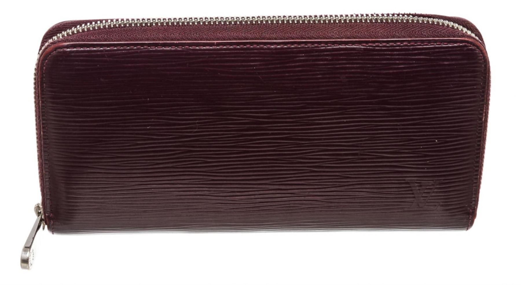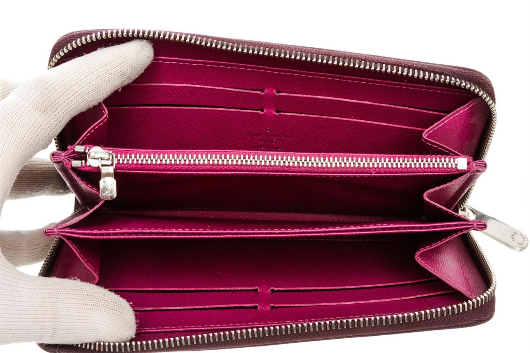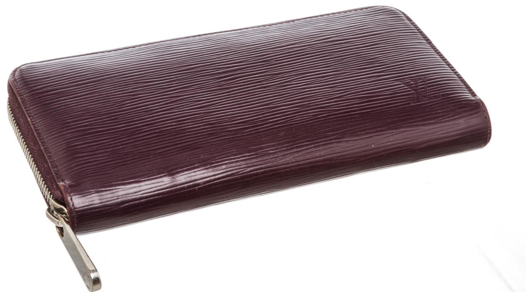 Purple Epi leather Louis Vuitton Zippy wallet with silver-tone hardware, tonal leather interior, five compartments; one with zip closure, dual bill compartments, eight card slots and zip-around closure at top. Authentic.