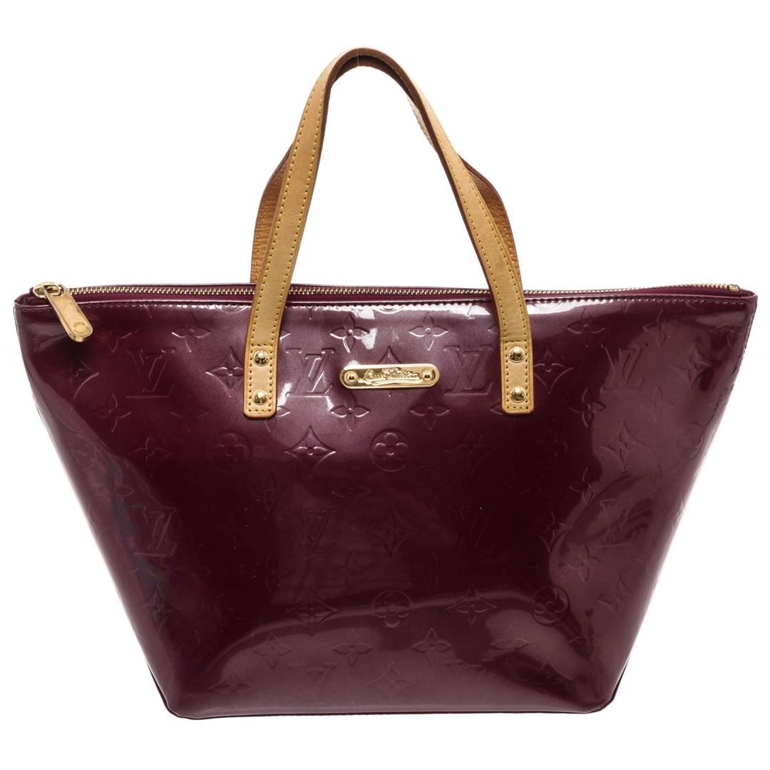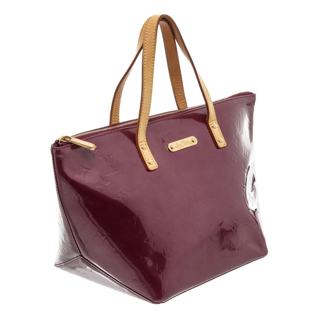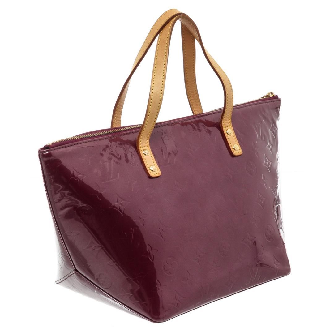Purple Monogram Vernis leather Louis Vuitton Bellevue PM with brass hardware tan vachetta leather trim, dual flat top handles, tonal canvas lining, dual open pockets at interior walls and zip closure at top. Authentic.