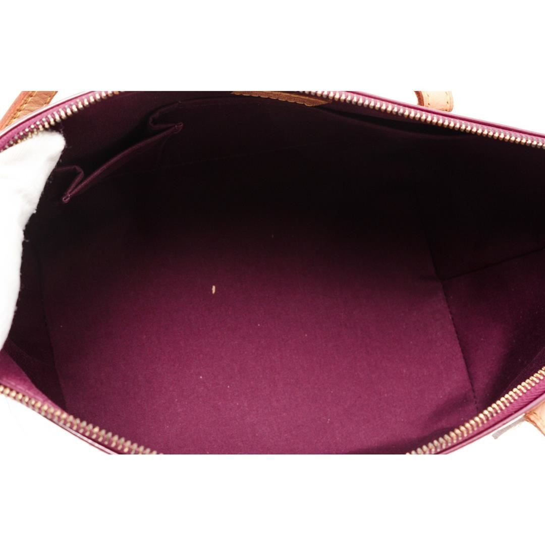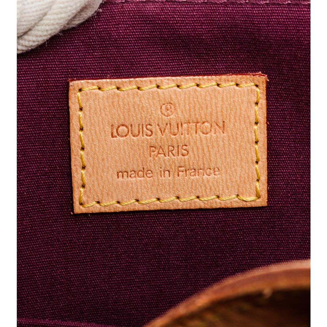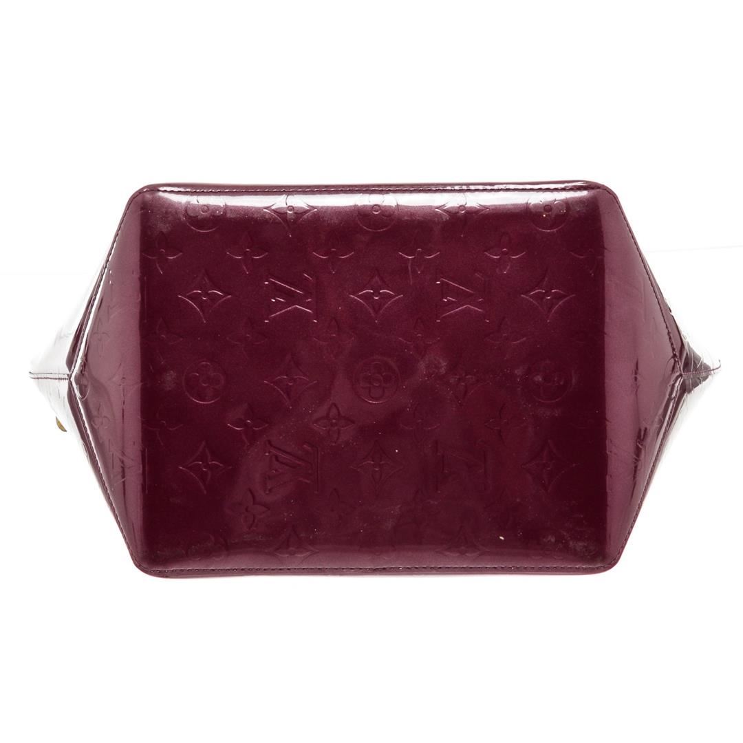 Purple Monogram Vernis leather Louis Vuitton Bellevue PM with brass hardware tan vachetta leather trim, dual flat top handles, tonal canvas lining, dual open pockets at interior walls and zip closure at top. Authentic.