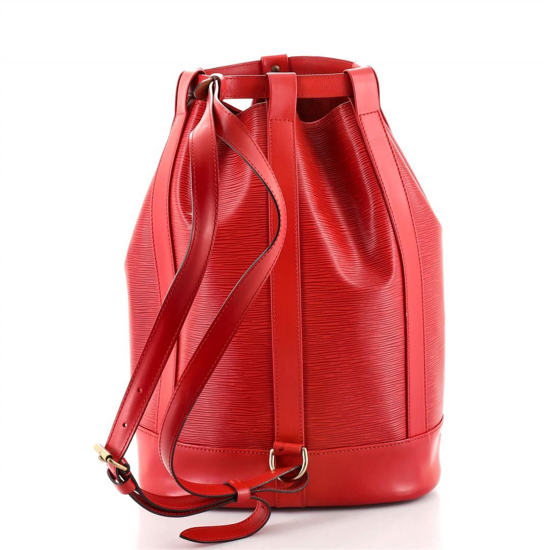 One Louis Vuitton Randonnee Backpack Epi Leather PM. Item is sold AS-IS. All available information is listed in the description and shown in the photo. Louis Vuitton Randonnee Backpack Epi Leather PM. Odor in interior. Creasing on exterior, minor wear and marks on opening and base trim. Fraying on strap wax edges, scratches and tarnish on hardware.