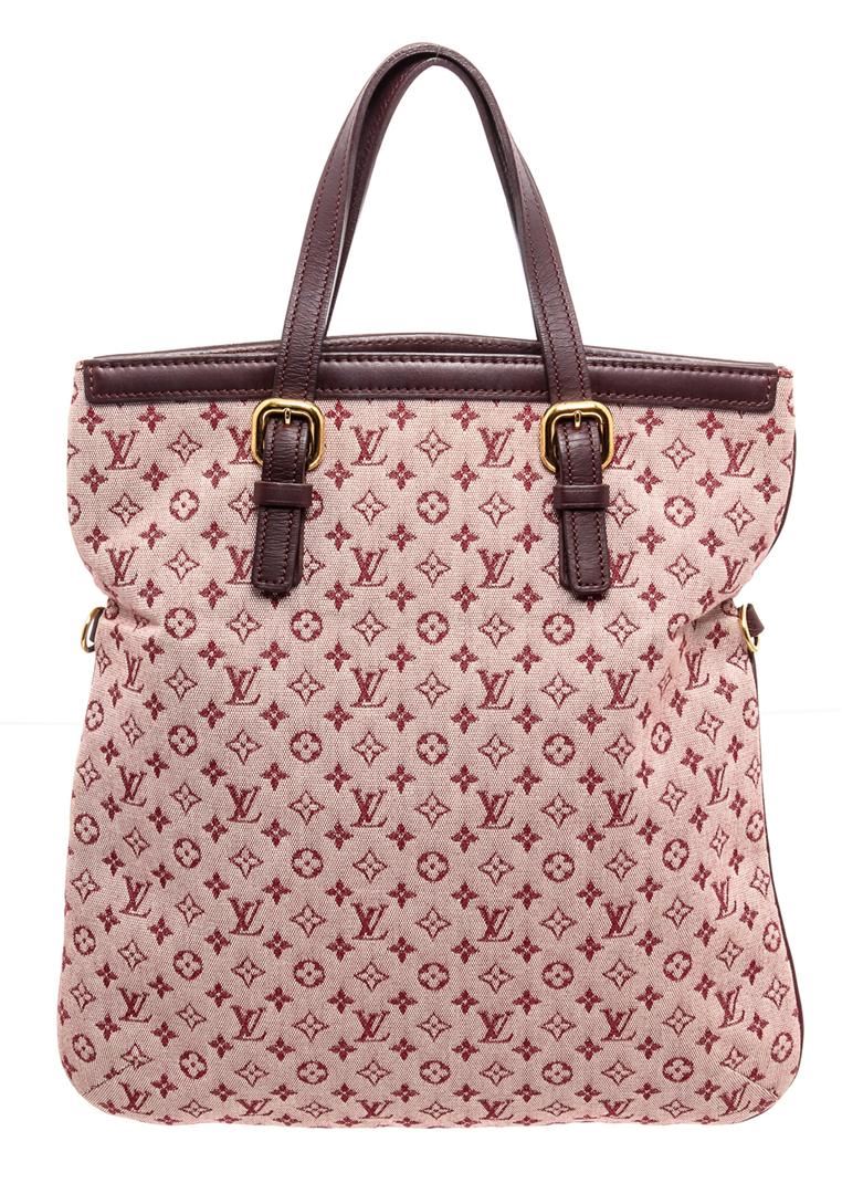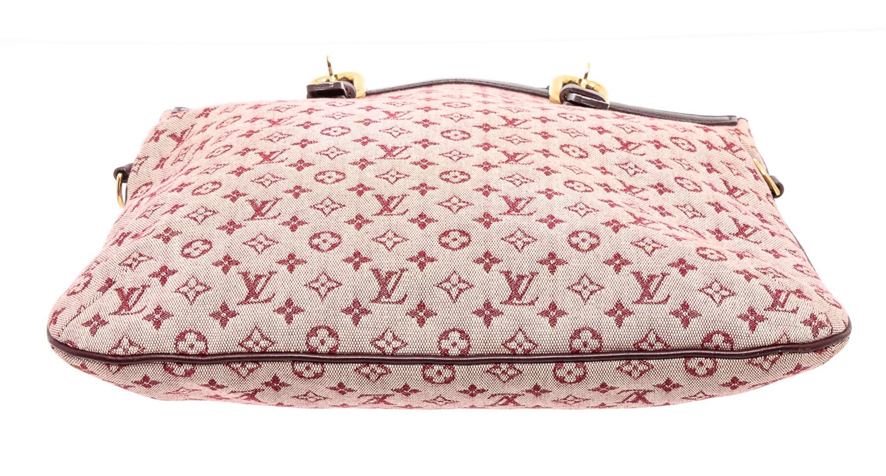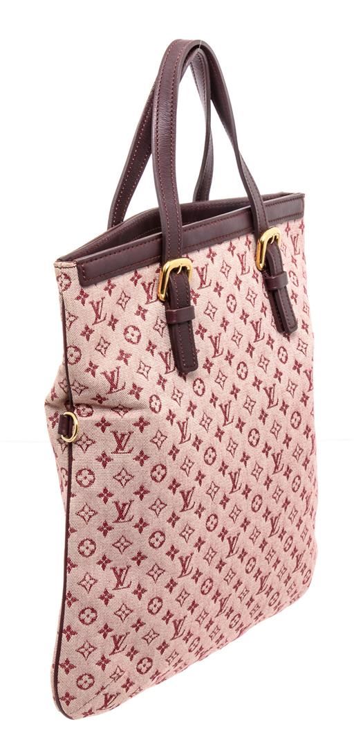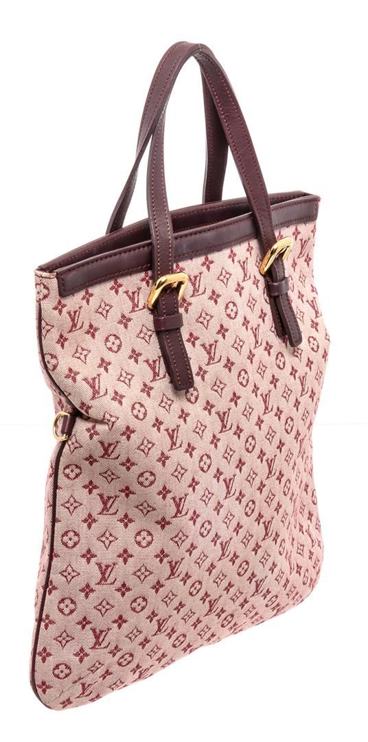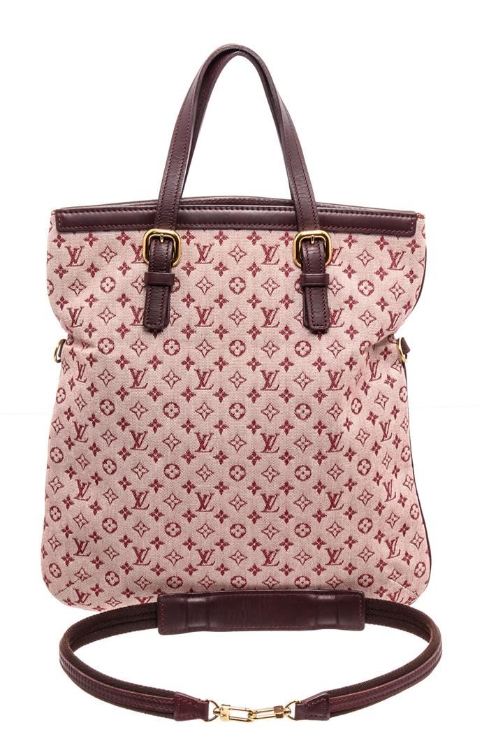 Raspberry and creme Mini Lin monogram canvas Louis Vuitton Francoise tote with brass hardware, single detachable flat shoulder strap, dual flat top handles, chocolate leather trim, creme woven lining, single interior zip pocket and open at top.