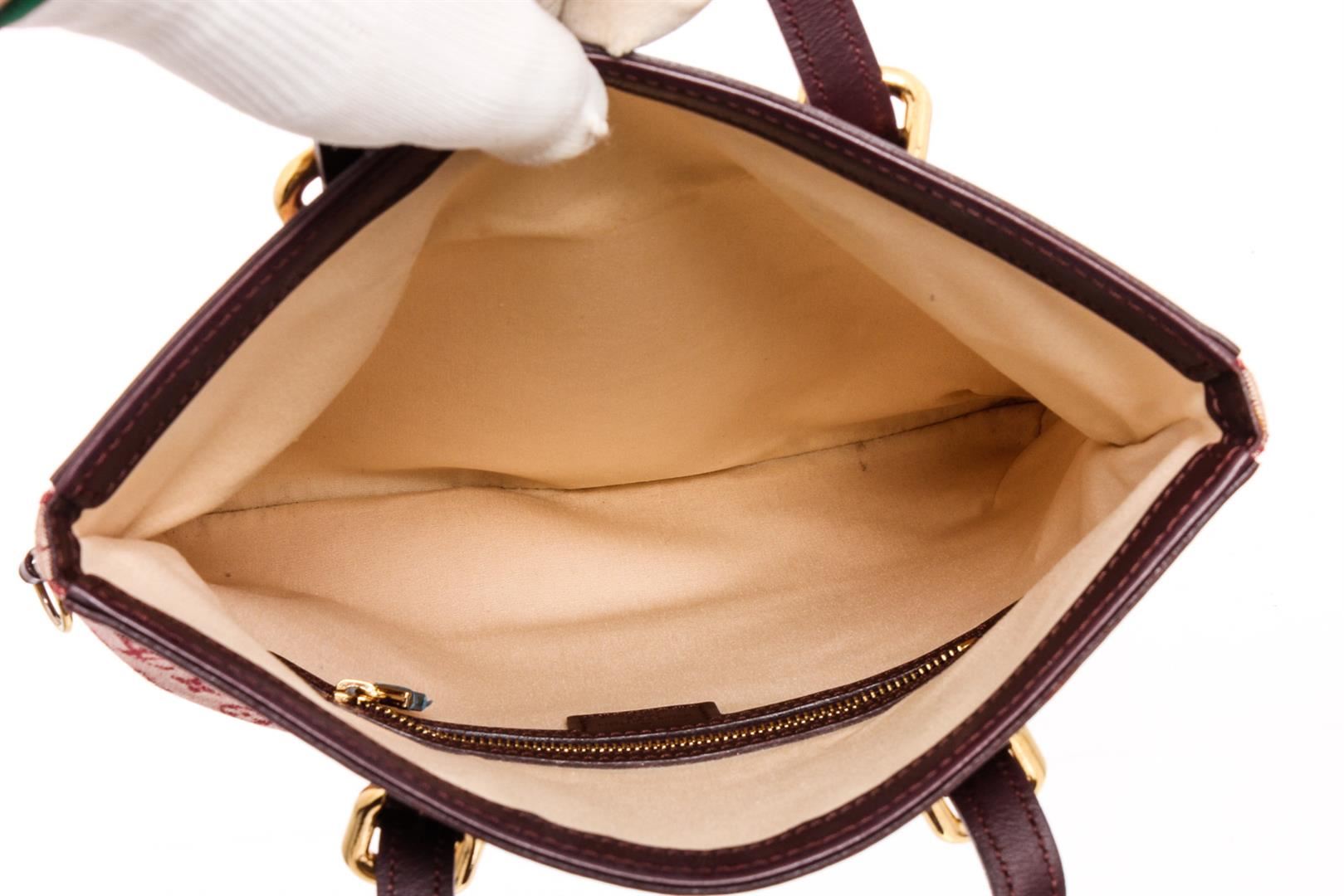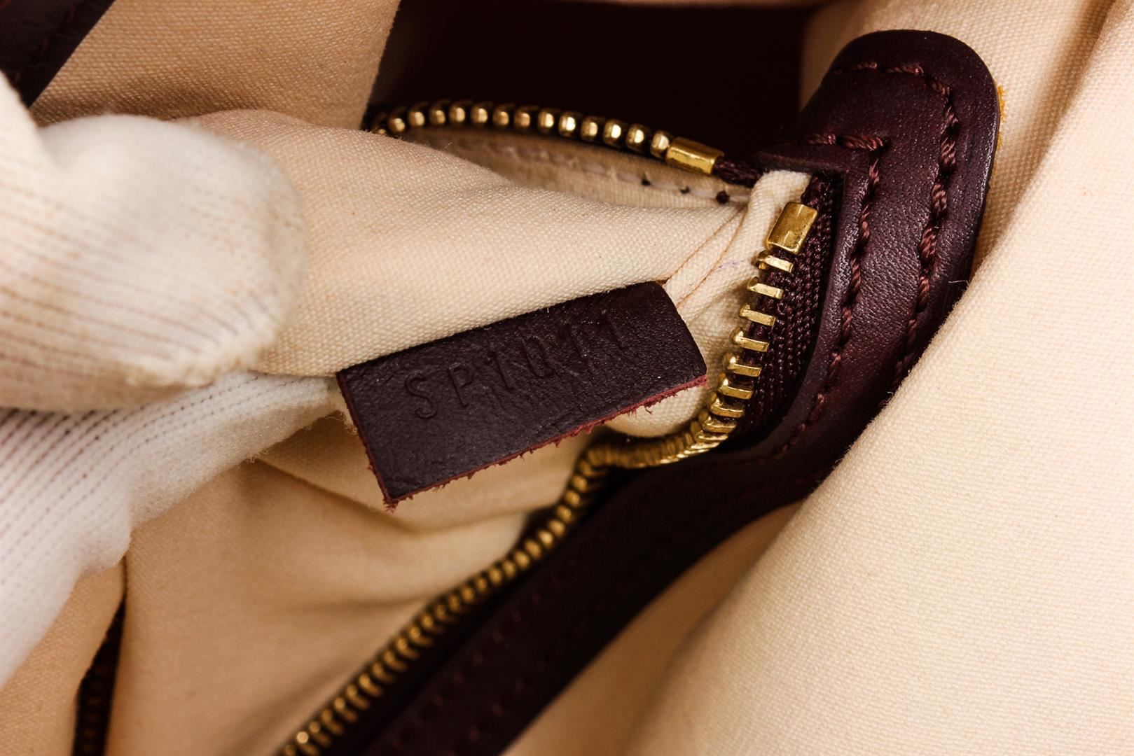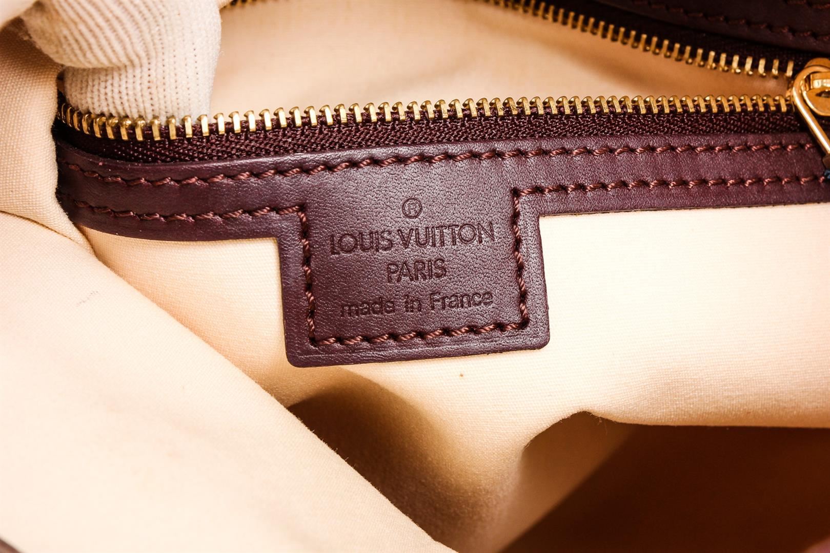 Raspberry and creme Mini Lin monogram canvas Louis Vuitton Francoise tote with brass hardware, single detachable flat shoulder strap, dual flat top handles, chocolate leather trim, creme woven lining, single interior zip pocket and open at top.