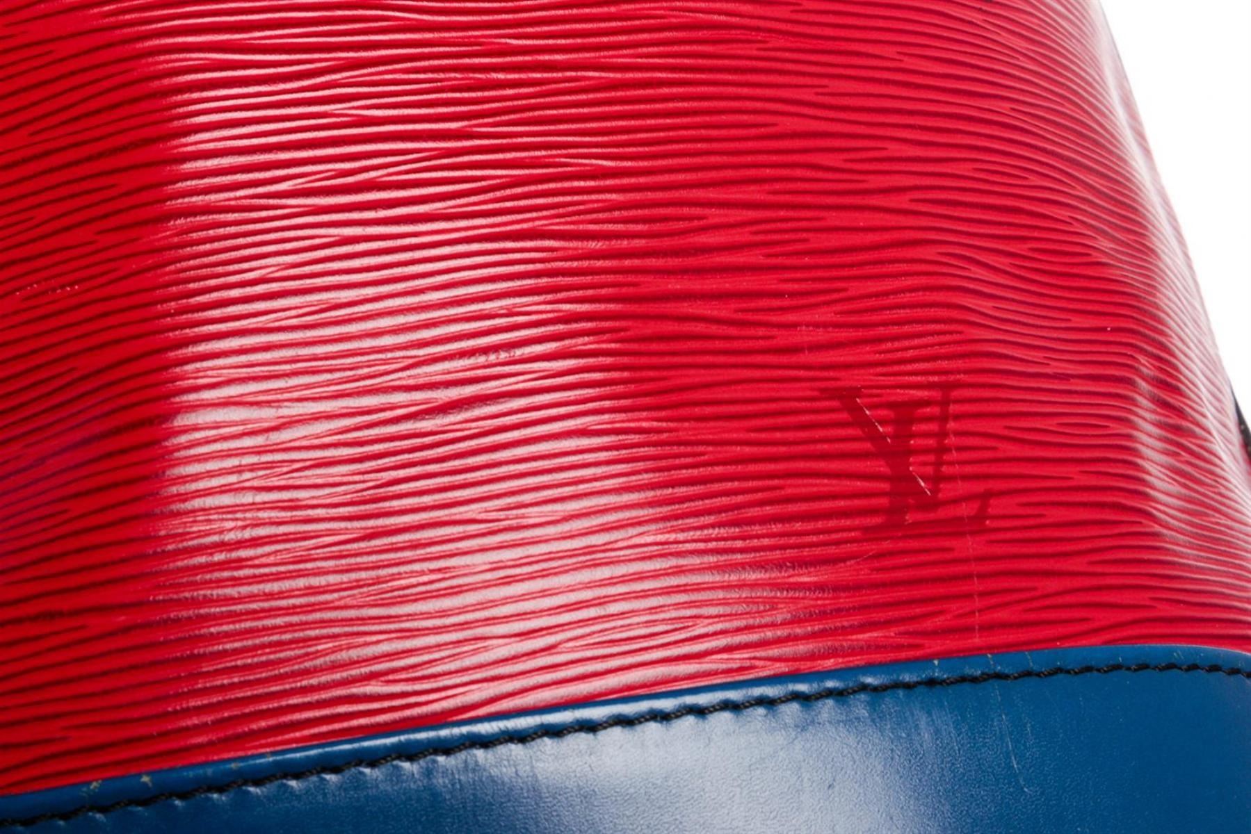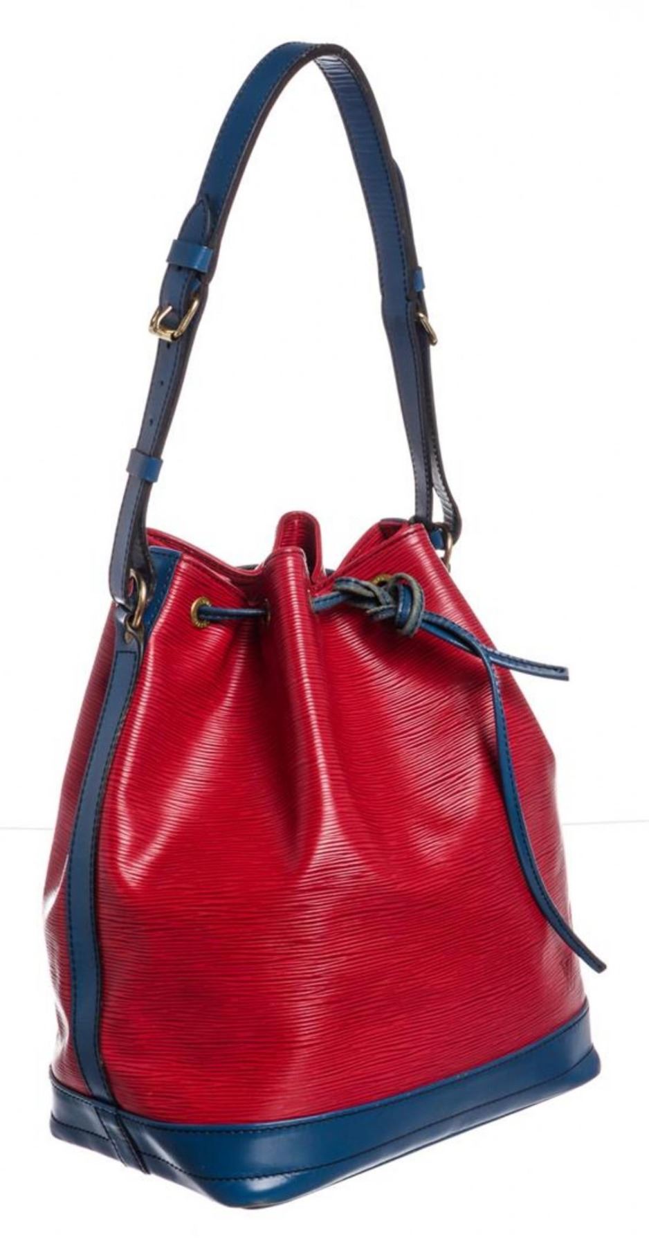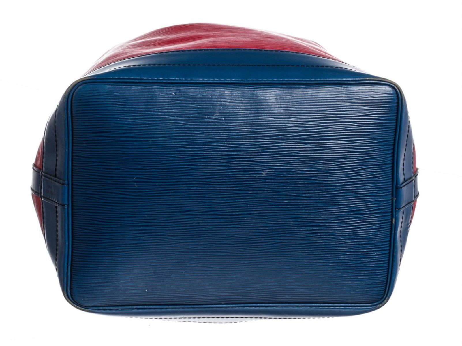 Red and Blue Epi leather Louis Vuitton Noe GM with brass hardware, single adjustable shoulder strap, tonal leather trim, embossed logo at exterior side, Alcantara lining and drawstring closure at top. Authentic.